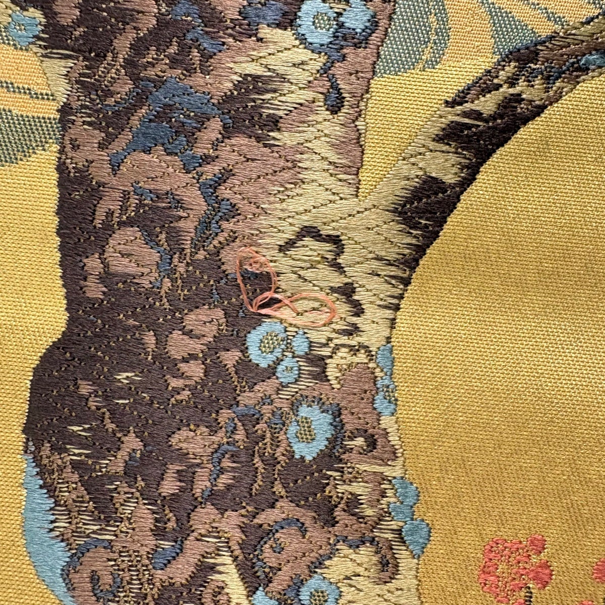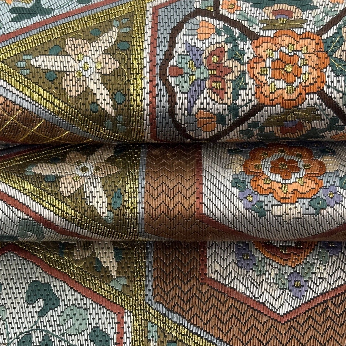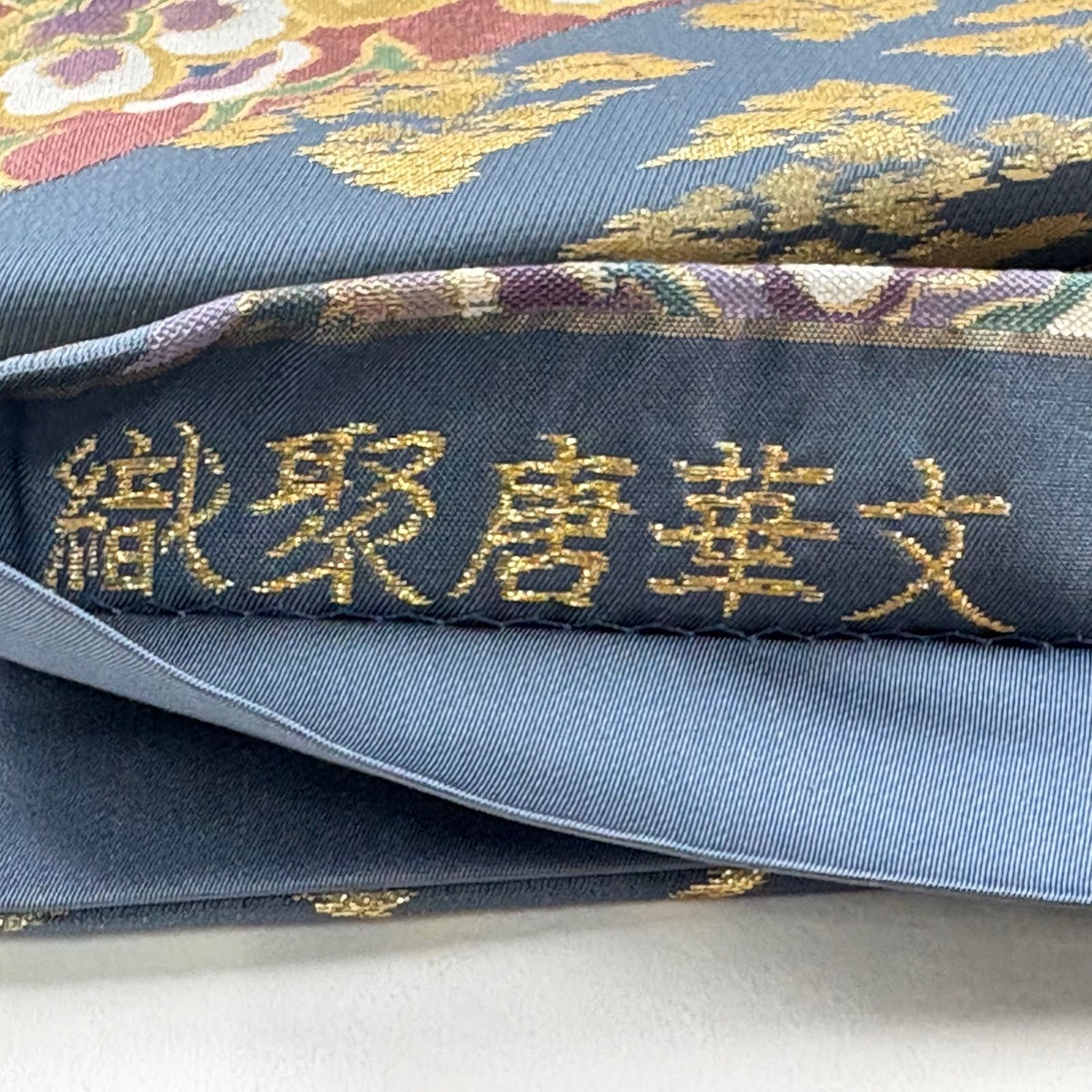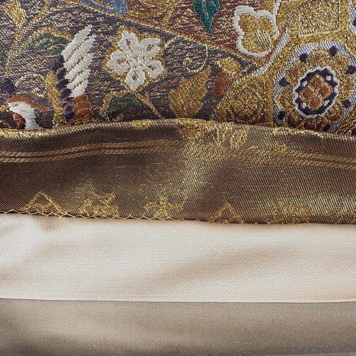 袋帯とは女性用の主にフォーマル用の帯で第一礼装として着用されることが多く、形状は表地にのみ柄があり裏地は無地になるように袋状に織って作成されたため袋帯という名が付きました。 帯を締める際にはおめでたいことが重なりますようにという願いが込められている二重太鼓や成人式の際に振袖に見かけるふくら雀や文庫結びなどの変わり結びを用いて着用します。