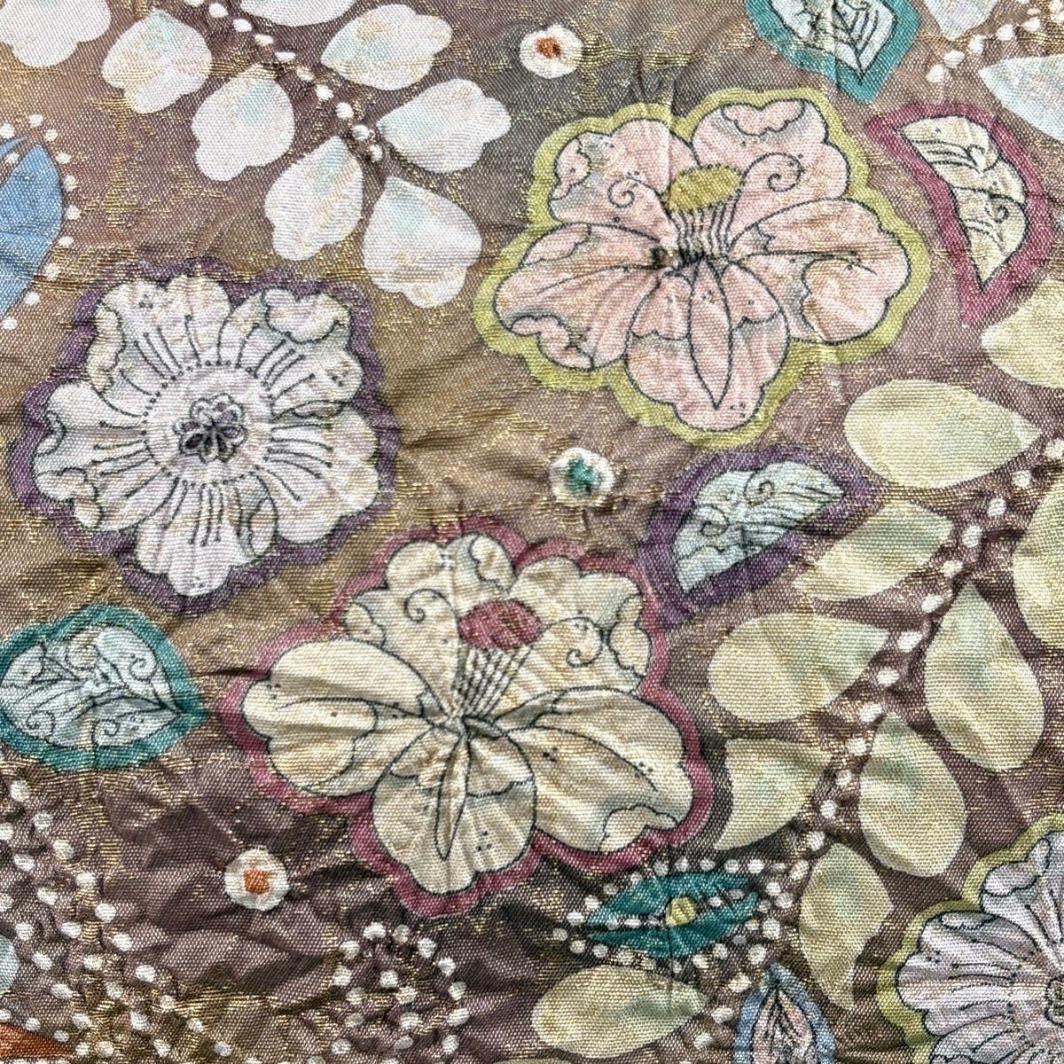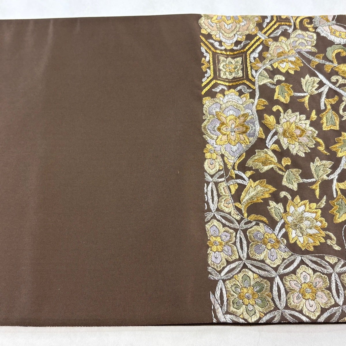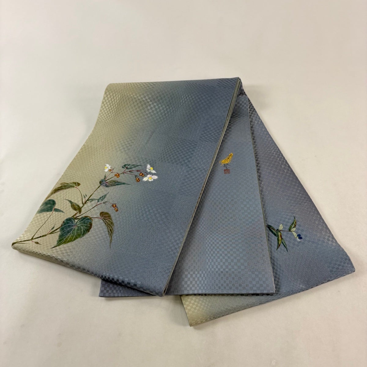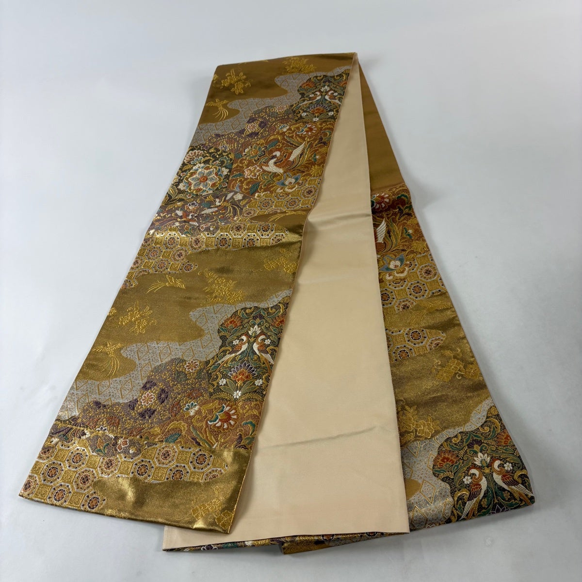 袋帯とは女性用の主にフォーマル用の帯で第一礼装として着用されることが多く、形状は表地にのみ柄があり裏地は無地になるように袋状に織って作成されたため袋帯という名が付きました。 帯を締める際にはおめでたいことが重なりますようにという願いが込められている二重太鼓や成人式の際に振袖に見かけるふくら雀や文庫結びなどの変わり結びを用いて着用します。
