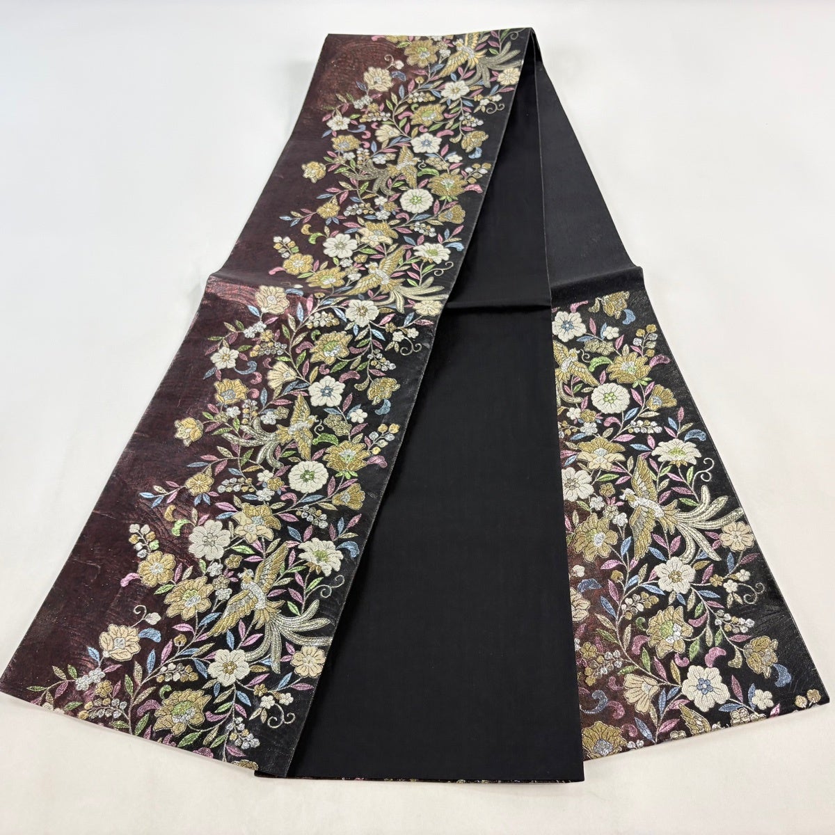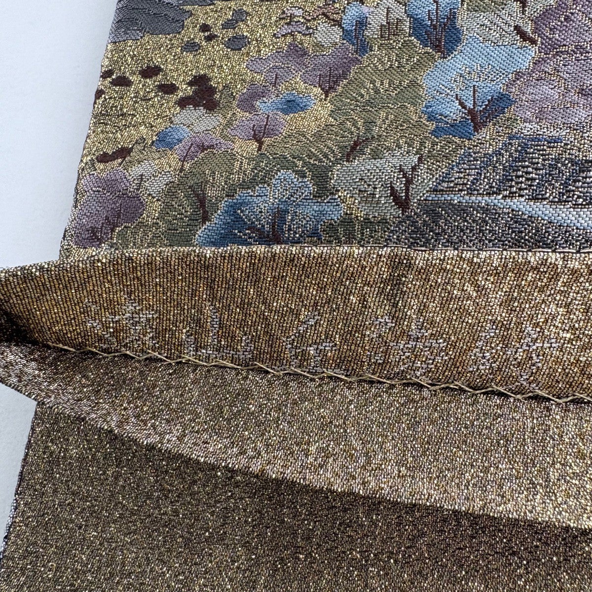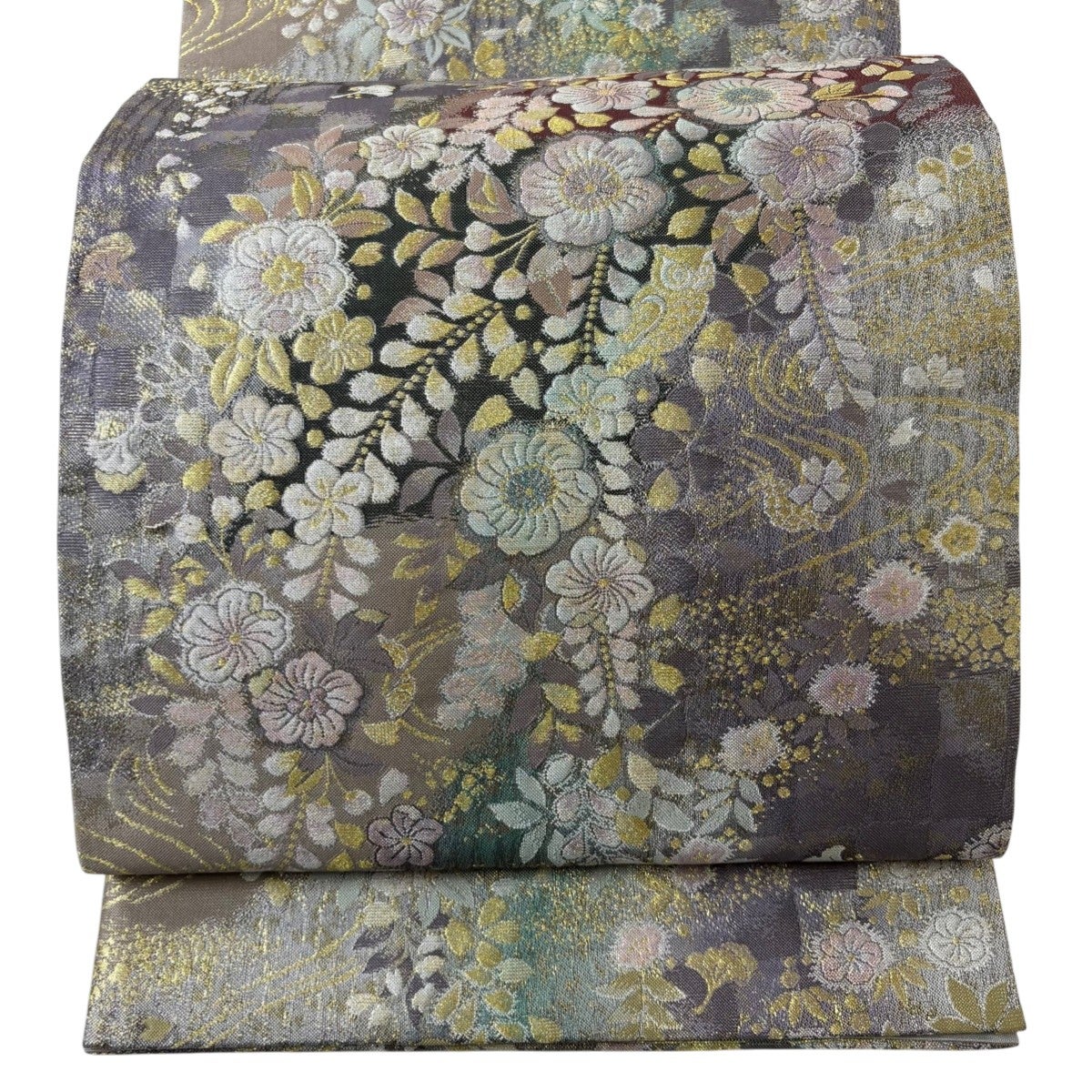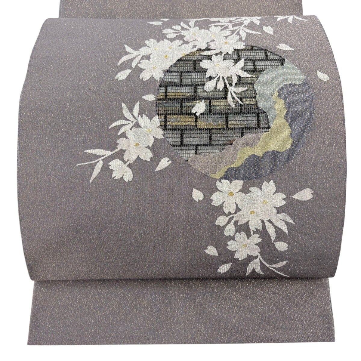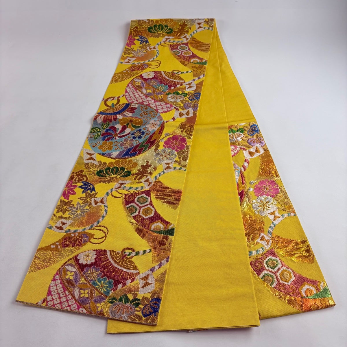 袋帯とは女性用の主にフォーマル用の帯で第一礼装として着用されることが多く、形状は表地にのみ柄があり裏地は無地になるように袋状に織って作成されたため袋帯という名が付きました。 帯を締める際にはおめでたいことが重なりますようにという願いが込められている二重太鼓や成人式の際に振袖に見かけるふくら雀や文庫結びなどの変わり結びを用いて着用します。