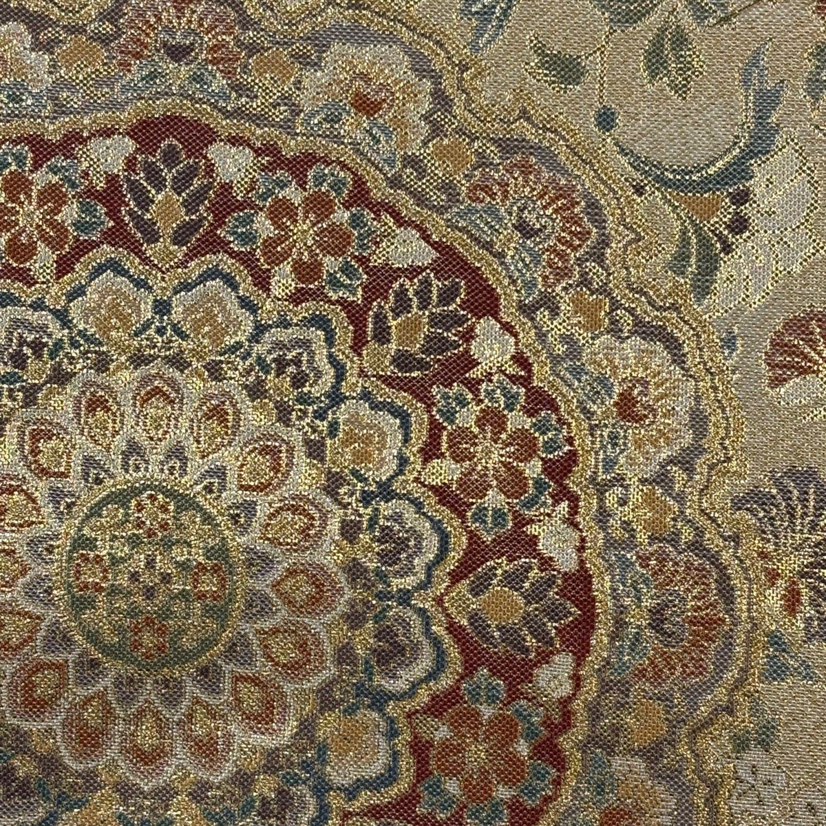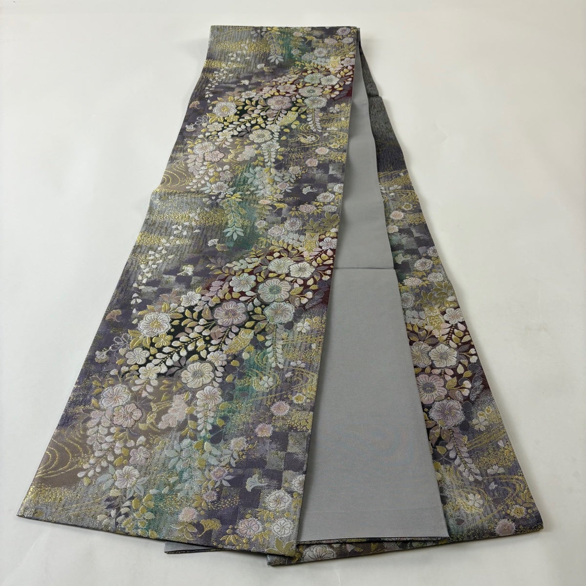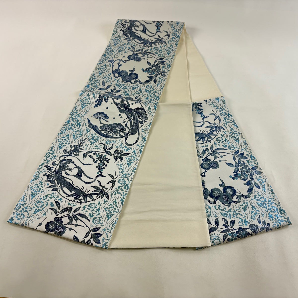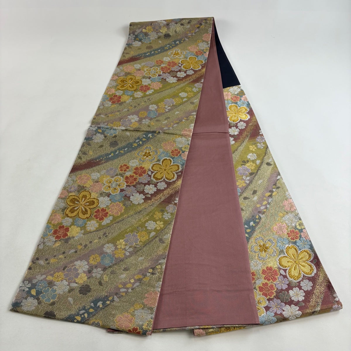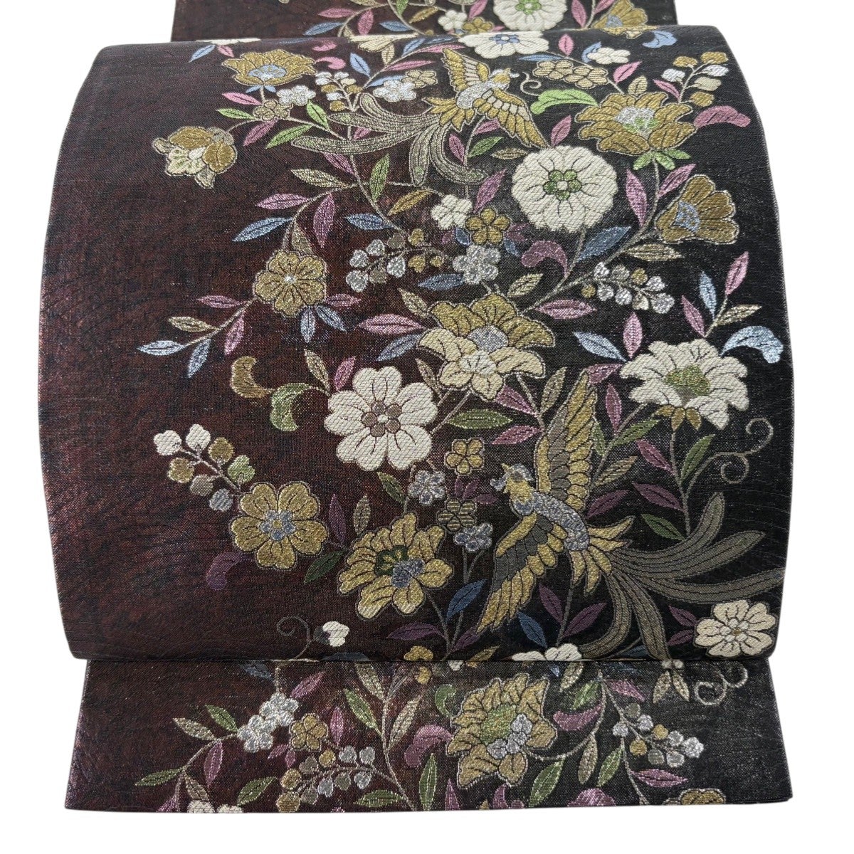 袋帯とは女性用の主にフォーマル用の帯で第一礼装として着用されることが多く、形状は表地にのみ柄があり裏地は無地になるように袋状に織って作成されたため袋帯という名が付きました。 帯を締める際にはおめでたいことが重なりますようにという願いが込められている二重太鼓や成人式の際に振袖に見かけるふくら雀や文庫結びなどの変わり結びを用いて着用します。