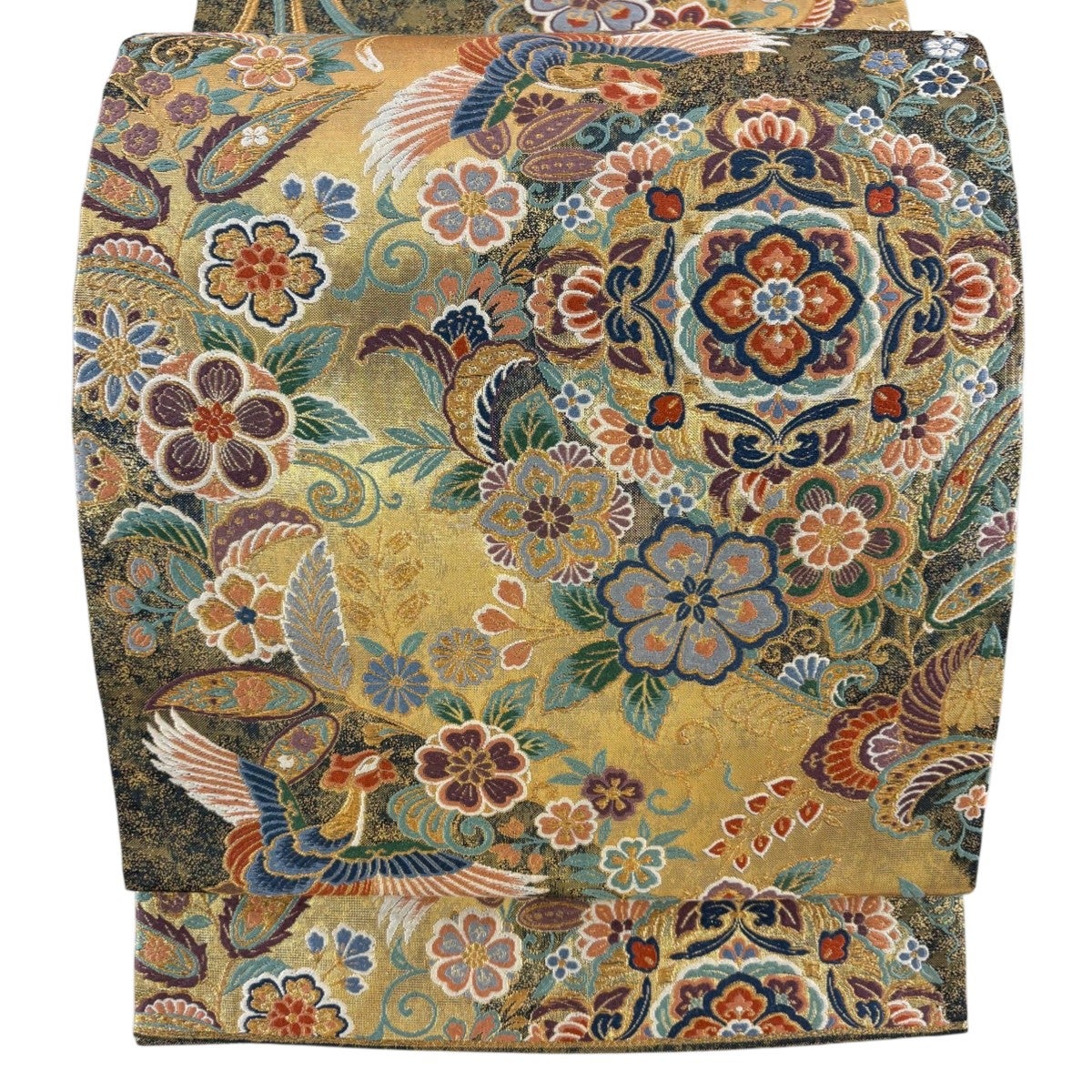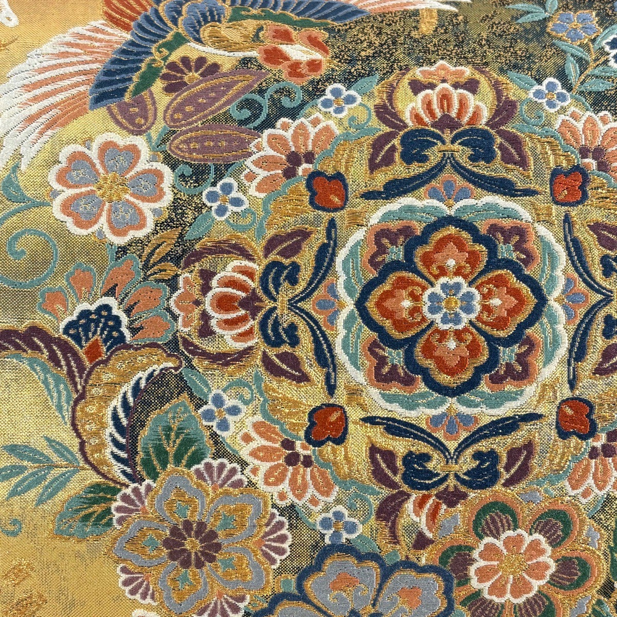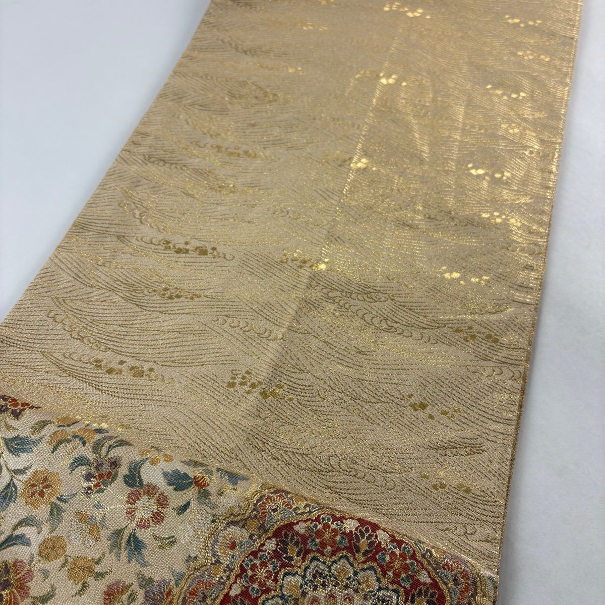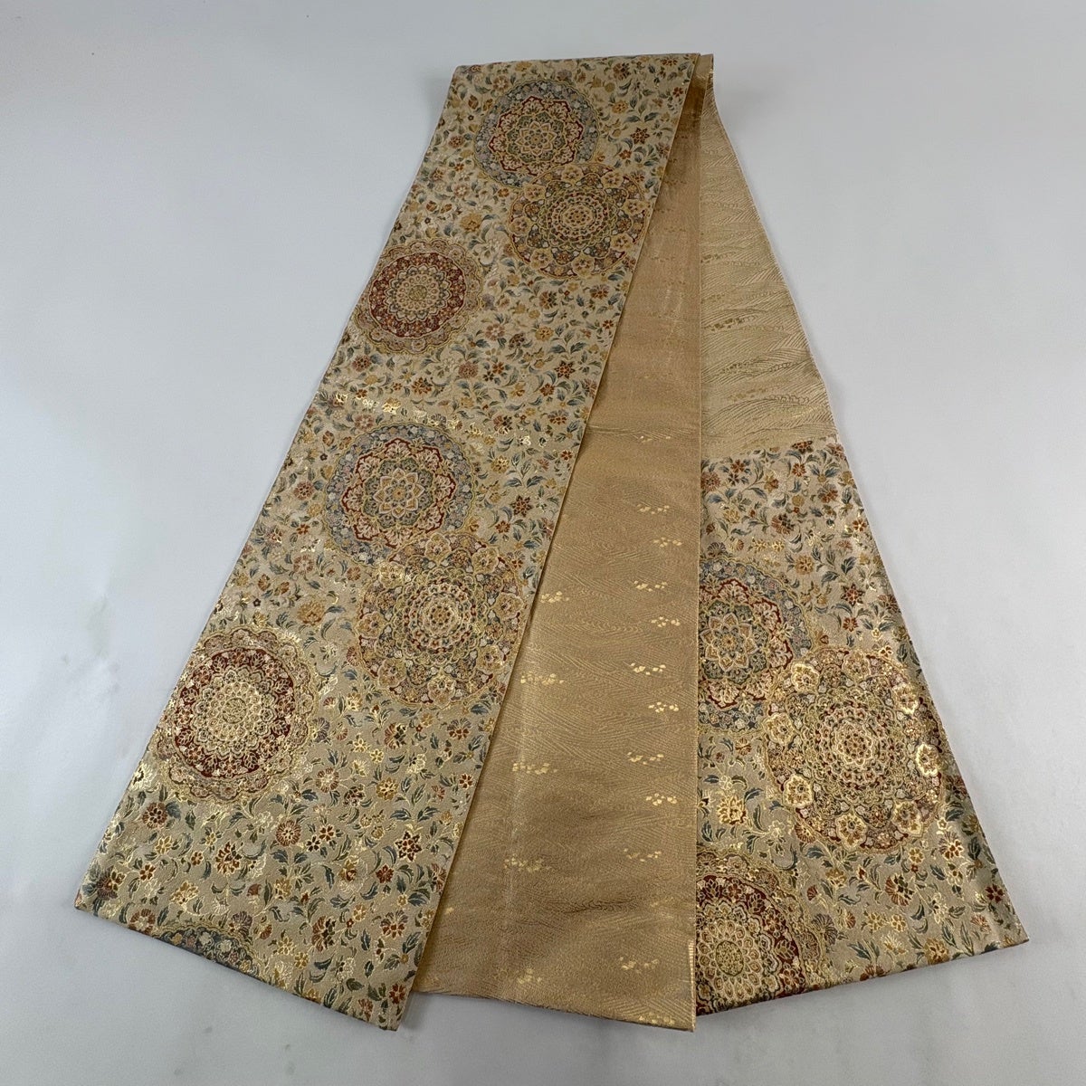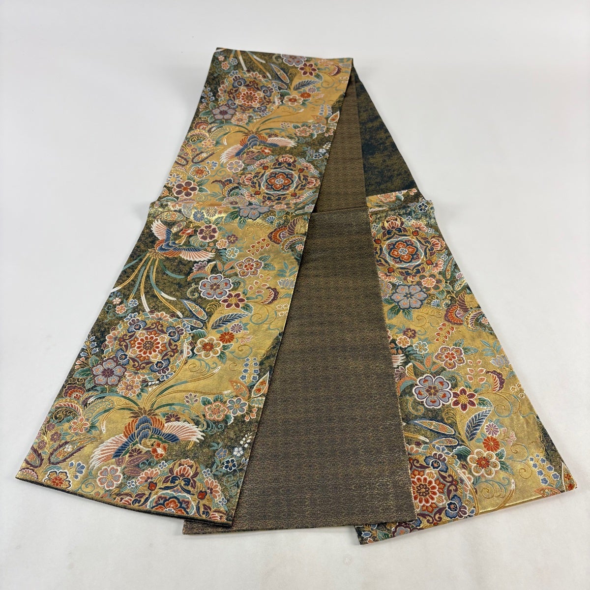 袋帯とは女性用の主にフォーマル用の帯で第一礼装として着用されることが多く、形状は表地にのみ柄があり裏地は無地になるように袋状に織って作成されたため袋帯という名が付きました。 帯を締める際にはおめでたいことが重なりますようにという願いが込められている二重太鼓や成人式の際に振袖に見かけるふくら雀や文庫結びなどの変わり結びを用いて着用します。