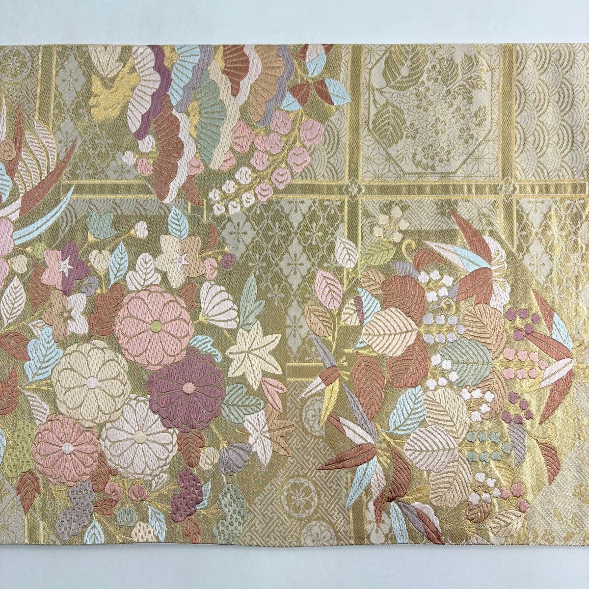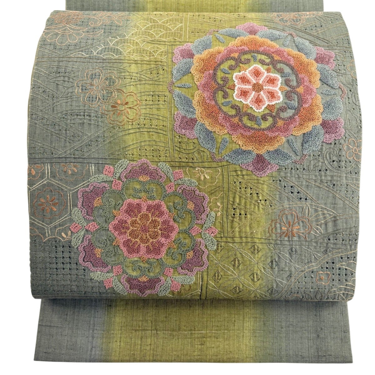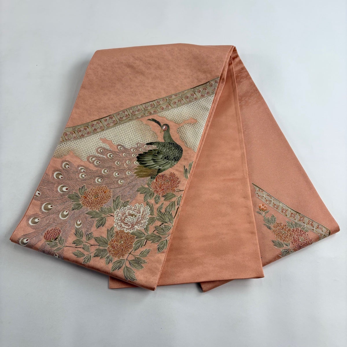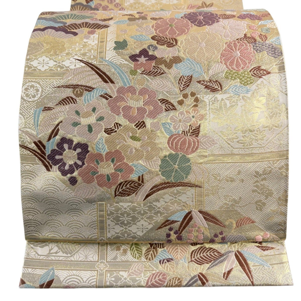 袋帯とは女性用の主にフォーマル用の帯で第一礼装として着用されることが多く、形状は表地にのみ柄があり裏地は無地になるように袋状に織って作成されたため袋帯という名が付きました。 帯を締める際にはおめでたいことが重なりますようにという願いが込められている二重太鼓や成人式の際に振袖に見かけるふくら雀や文庫結びなどの変わり結びを用いて着用します。