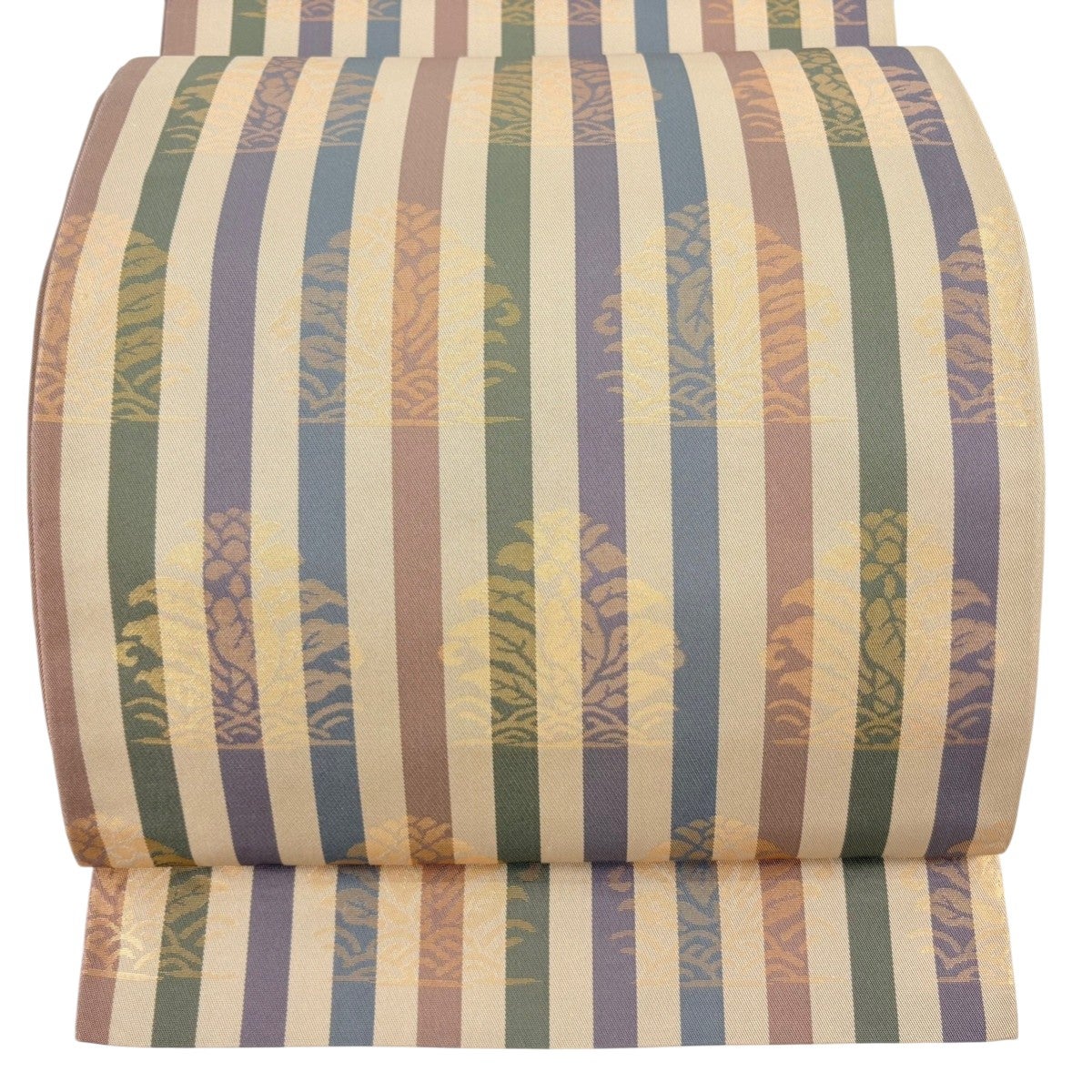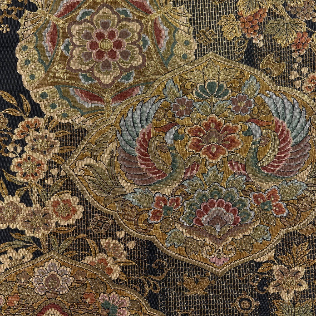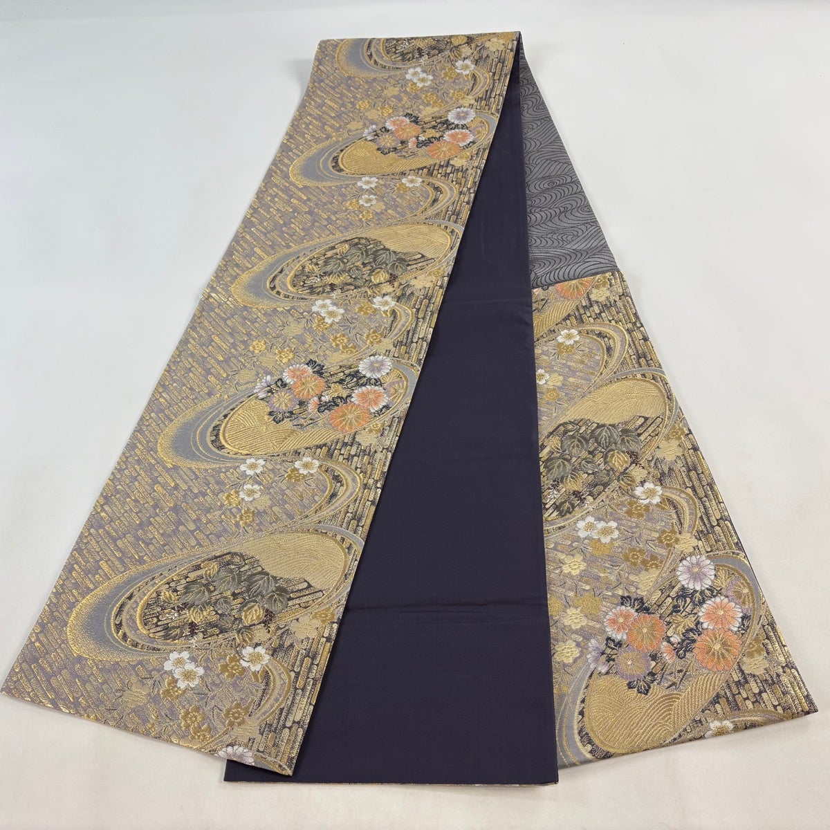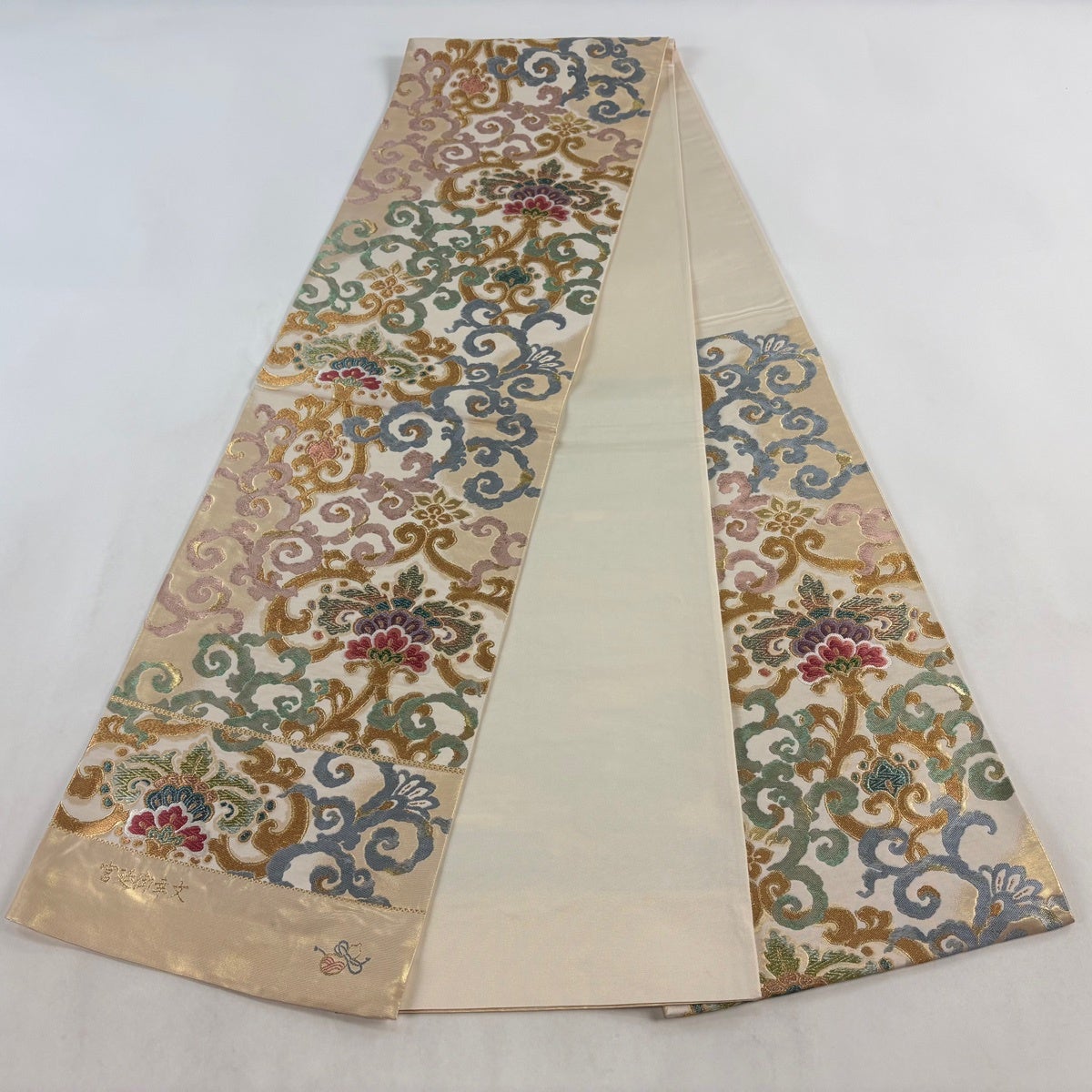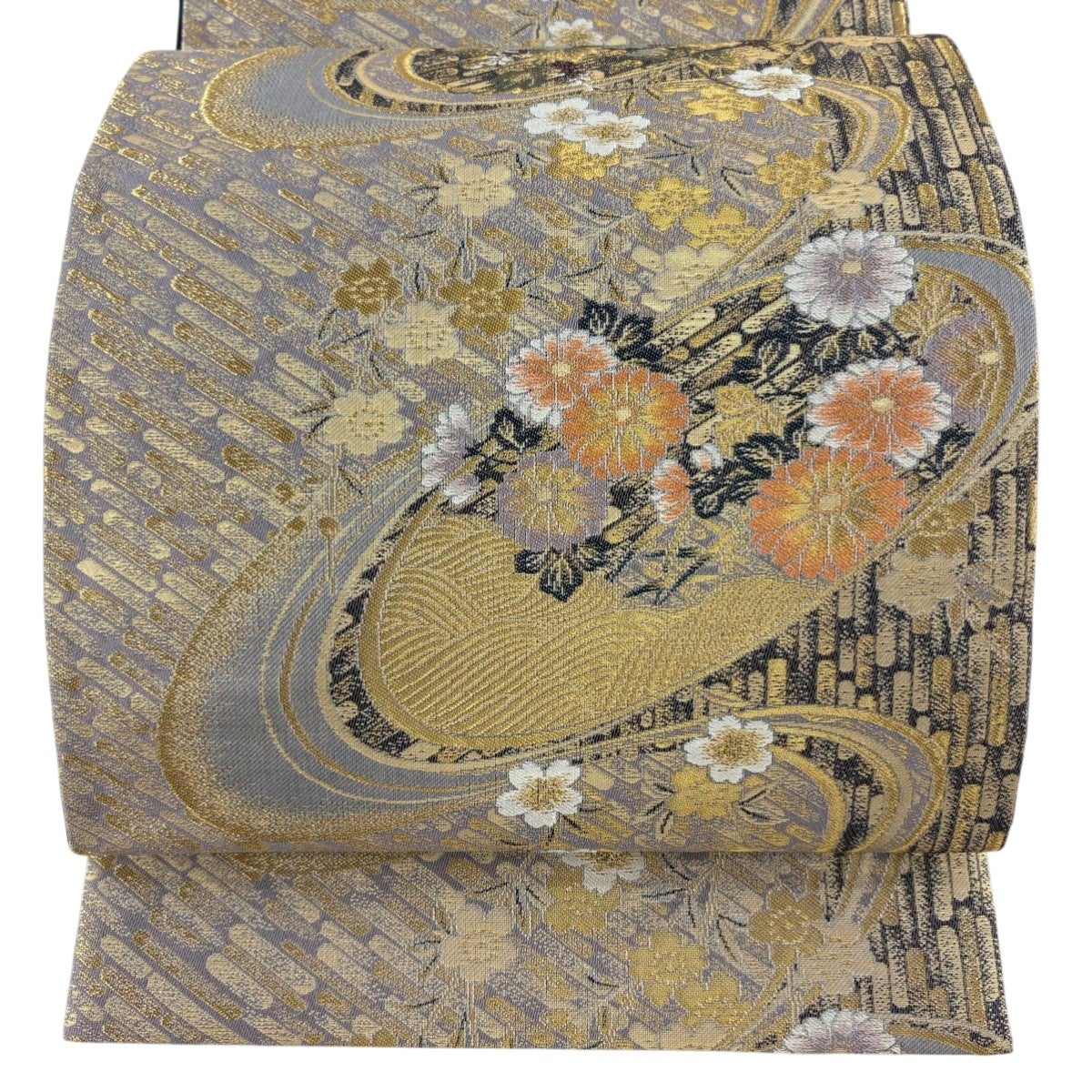 袋帯とは女性用の主にフォーマル用の帯で第一礼装として着用されることが多く、形状は表地にのみ柄があり裏地は無地になるように袋状に織って作成されたため袋帯という名が付きました。 帯を締める際にはおめでたいことが重なりますようにという願いが込められている二重太鼓や成人式の際に振袖に見かけるふくら雀や文庫結びなどの変わり結びを用いて着用します。