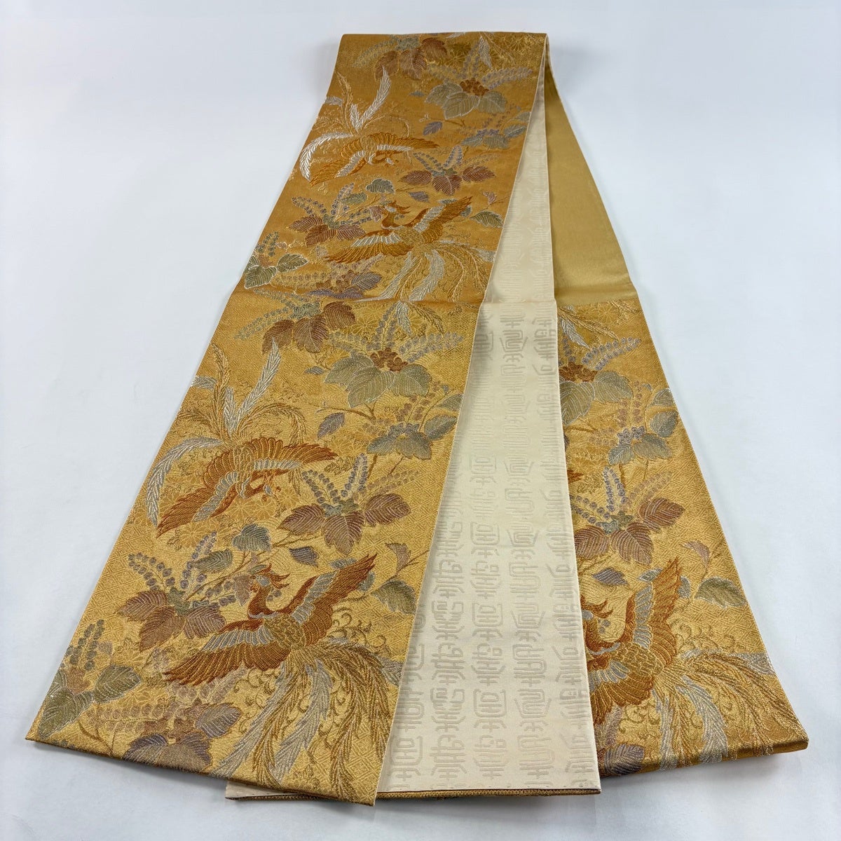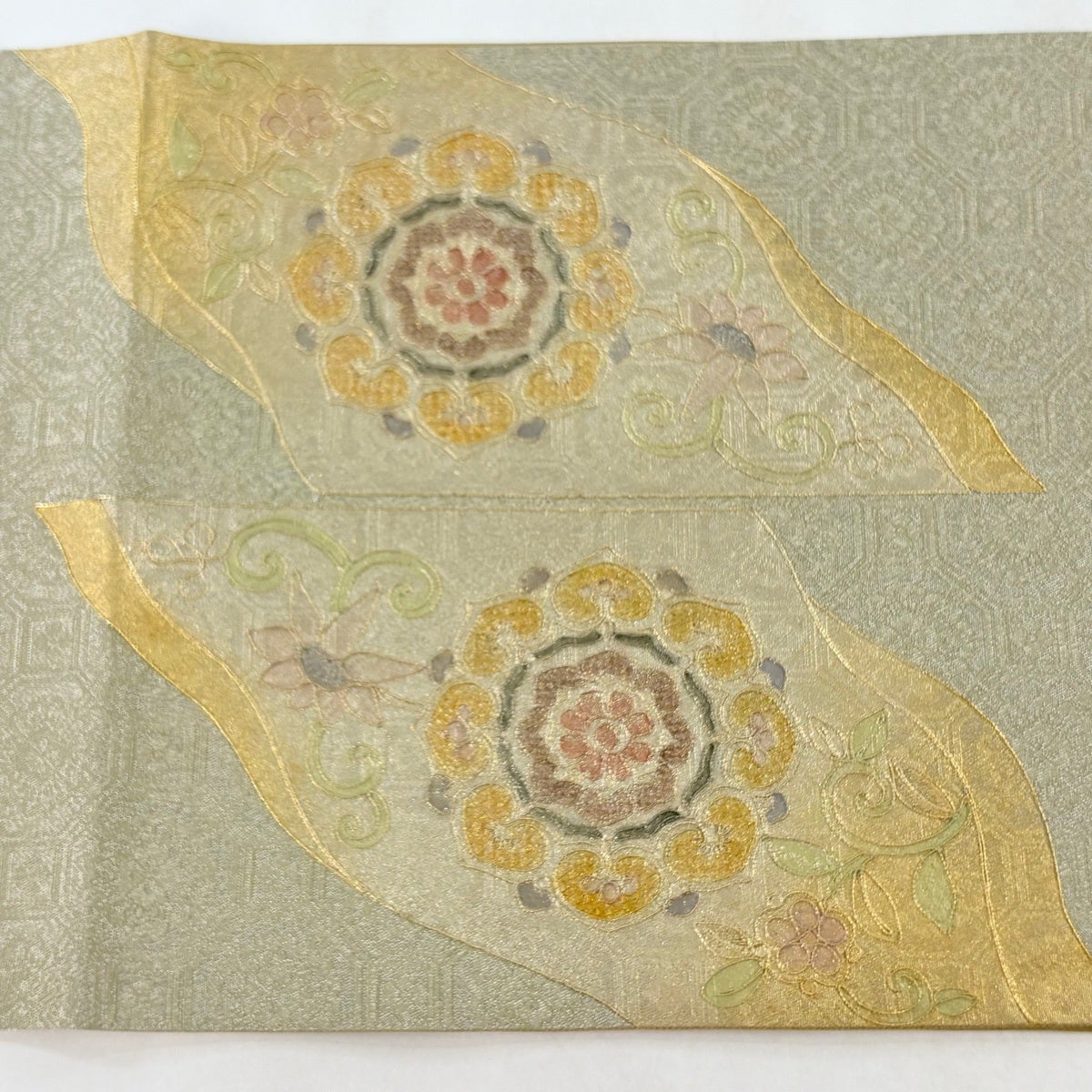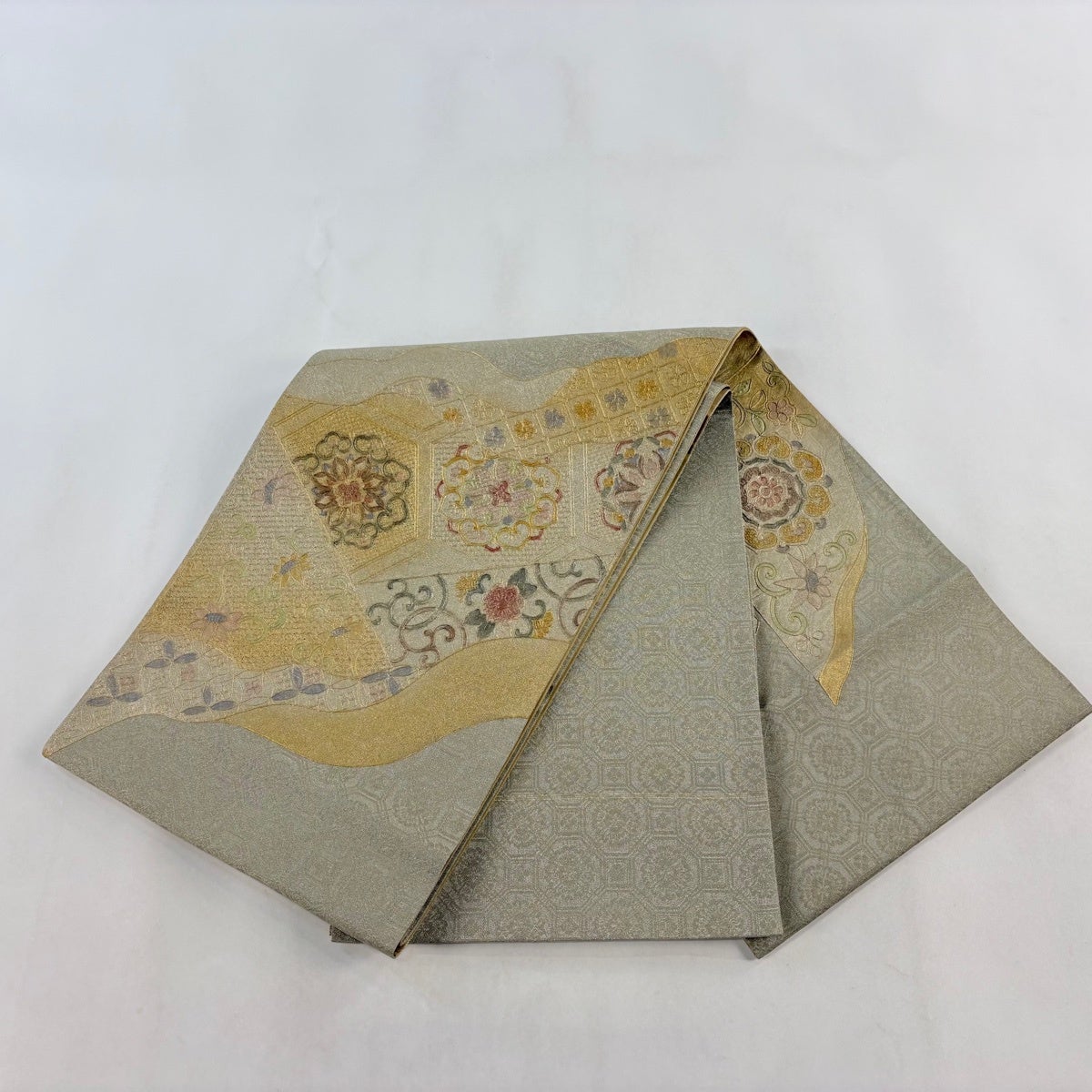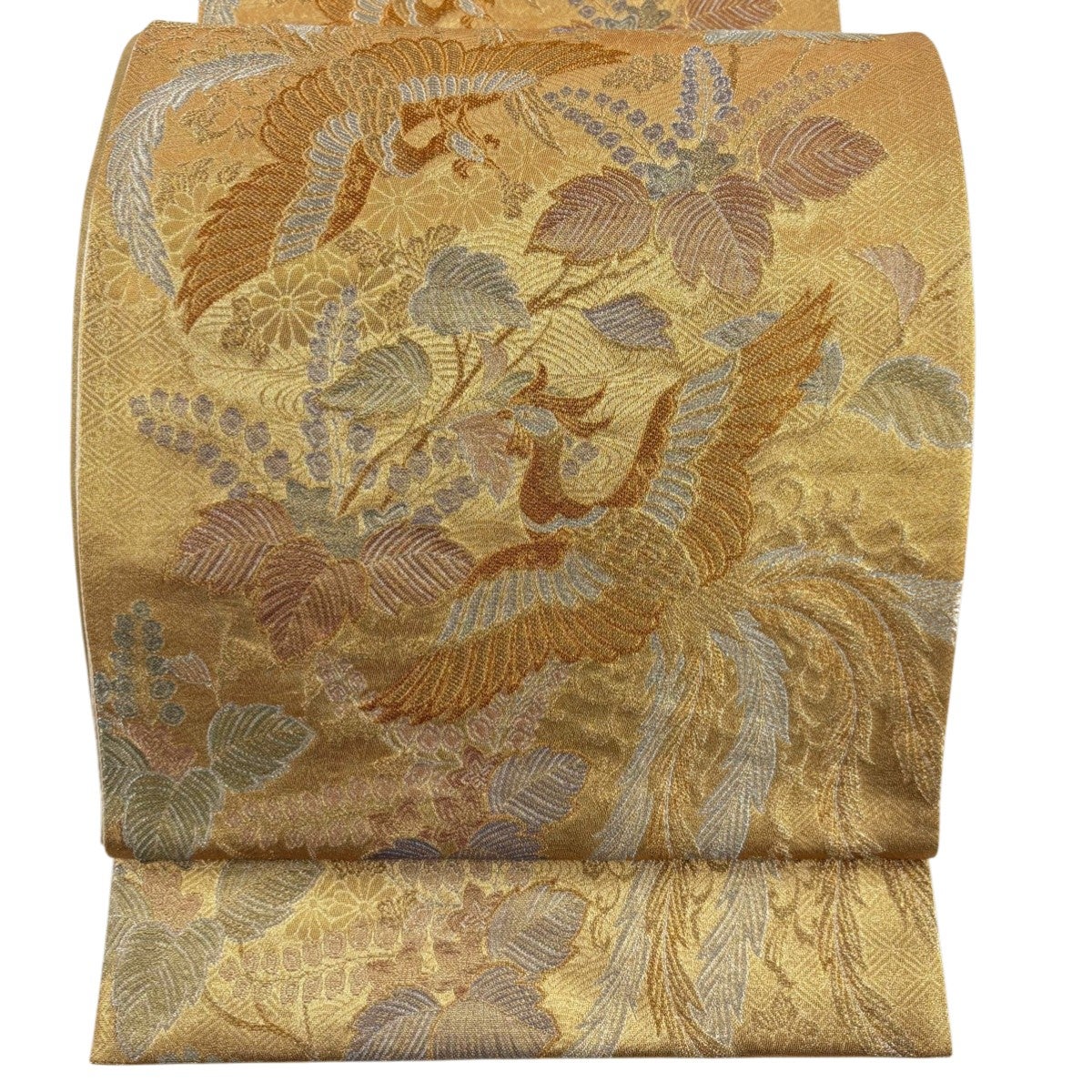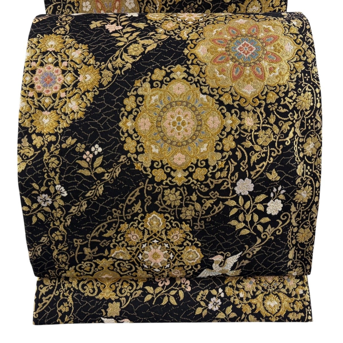 袋帯とは女性用の主にフォーマル用の帯で第一礼装として着用されることが多く、形状は表地にのみ柄があり裏地は無地になるように袋状に織って作成されたため袋帯という名が付きました。 帯を締める際にはおめでたいことが重なりますようにという願いが込められている二重太鼓や成人式の際に振袖に見かけるふくら雀や文庫結びなどの変わり結びを用いて着用します。