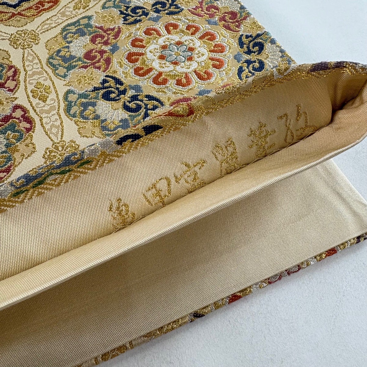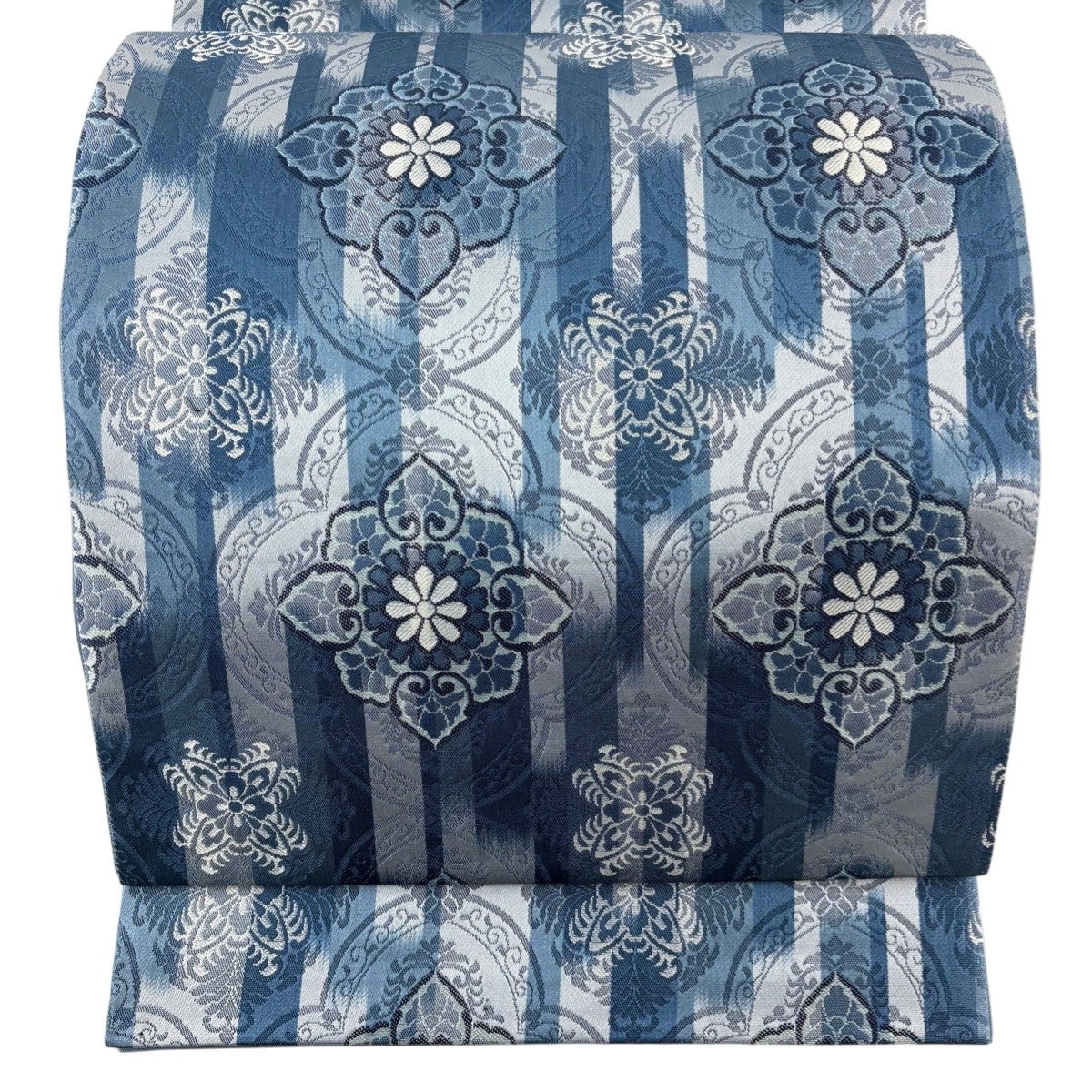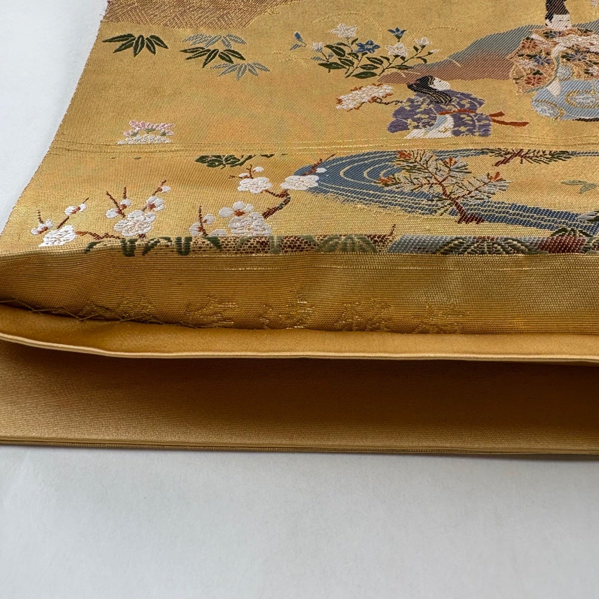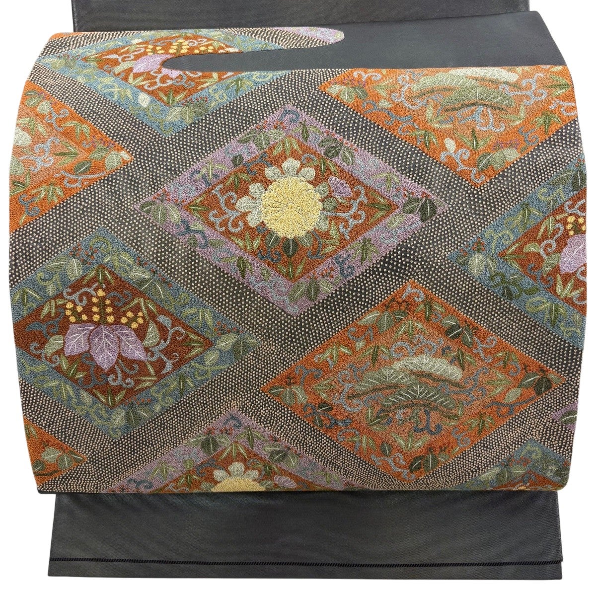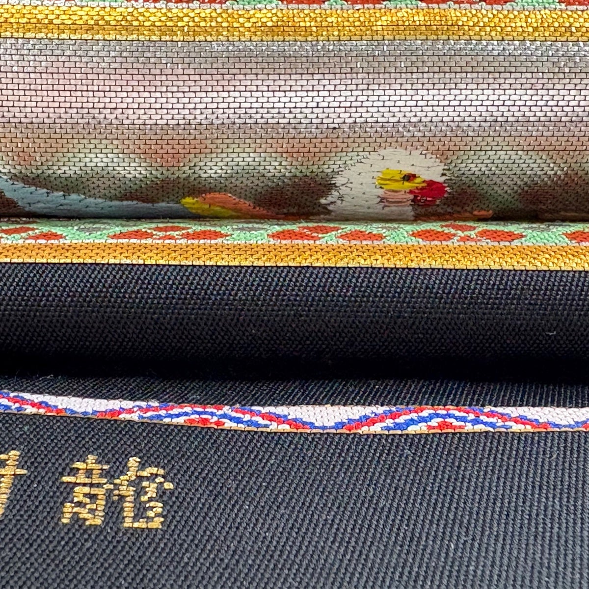 袋帯とは女性用の主にフォーマル用の帯で第一礼装として着用されることが多く、形状は表地にのみ柄があり裏地は無地になるように袋状に織って作成されたため袋帯という名が付きました。 帯を締める際にはおめでたいことが重なりますようにという願いが込められている二重太鼓や成人式の際に振袖に見かけるふくら雀や文庫結びなどの変わり結びを用いて着用します。