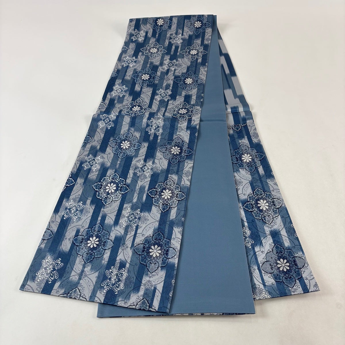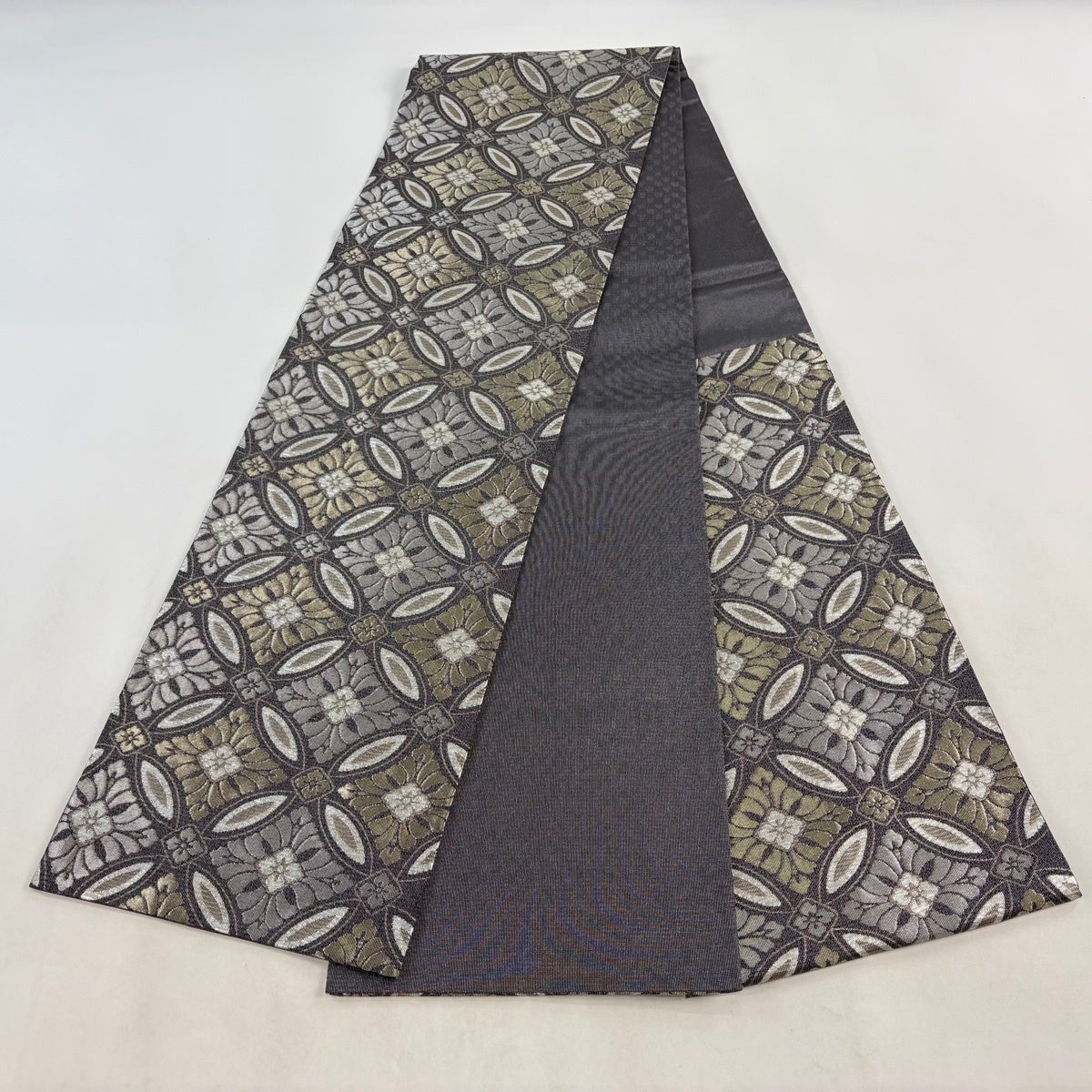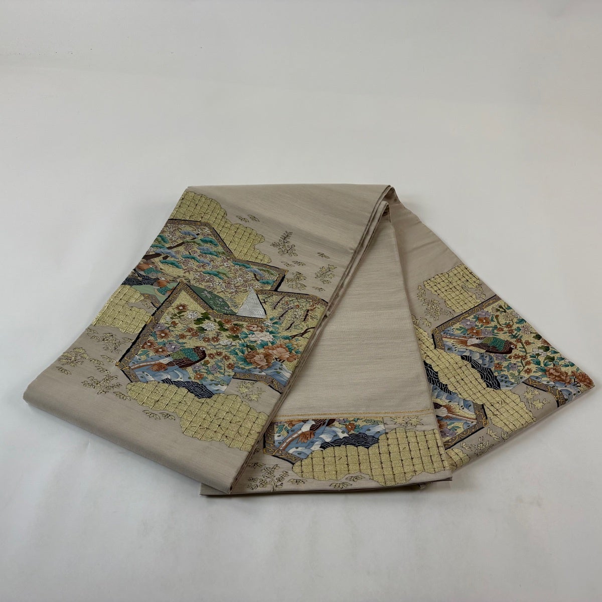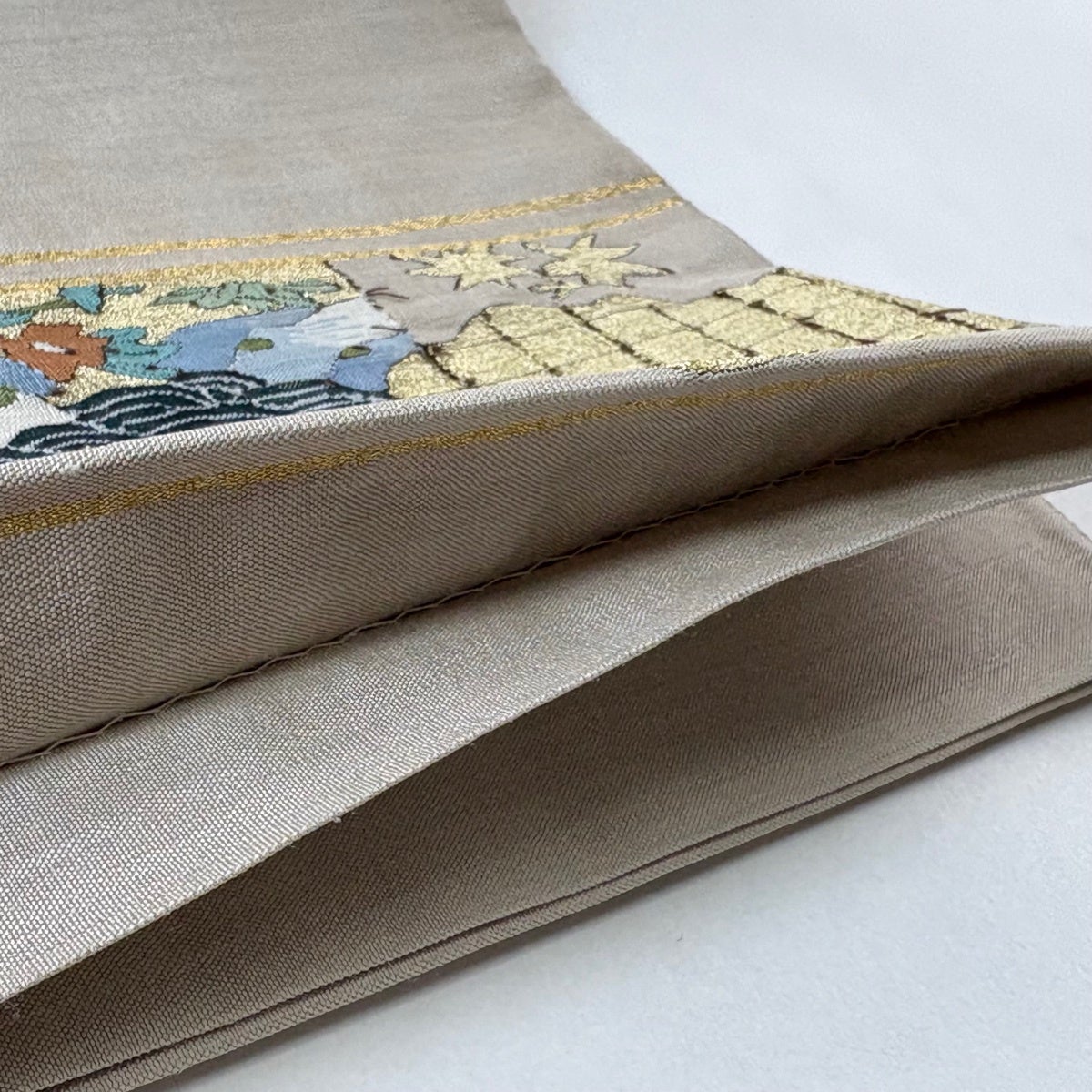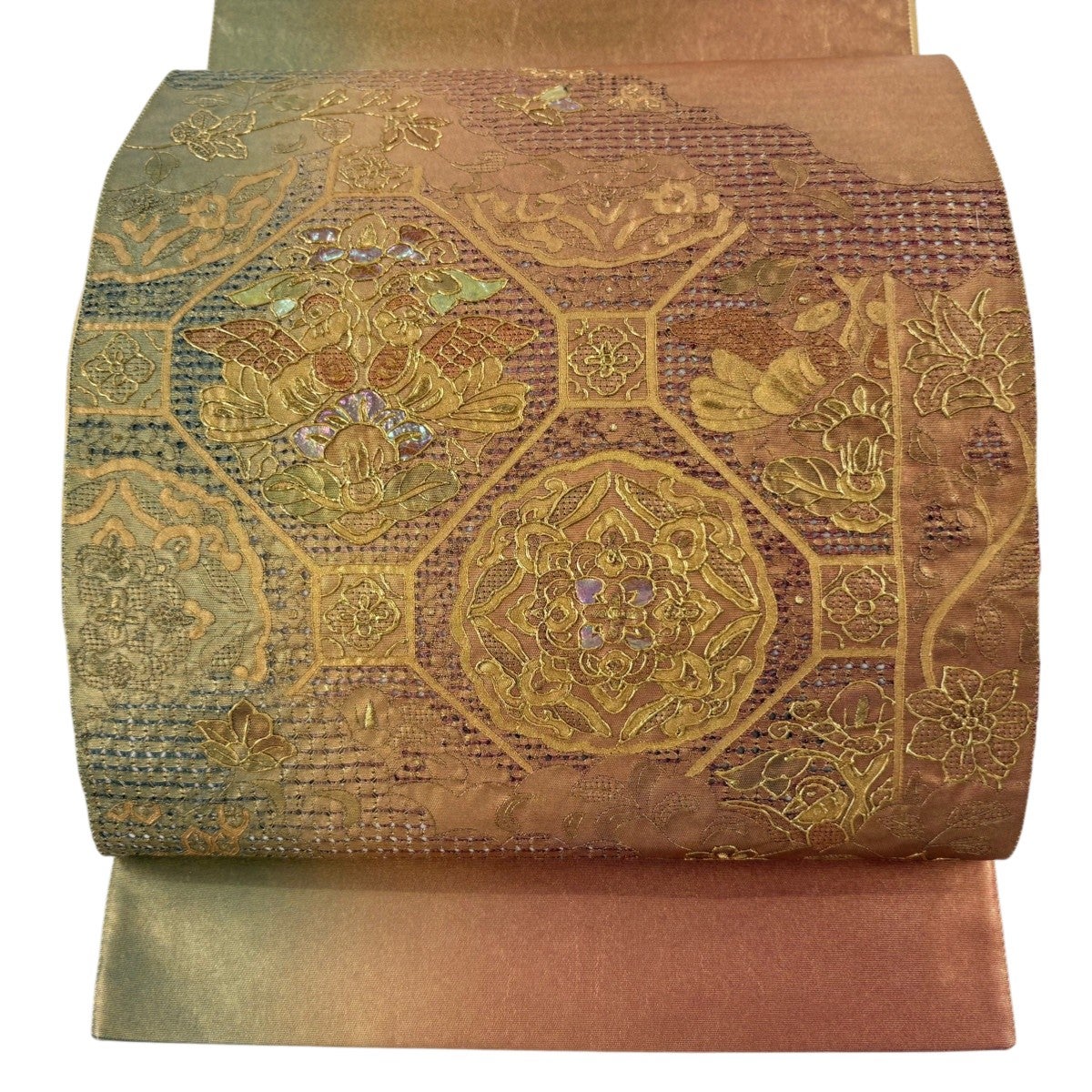 袋帯とは女性用の主にフォーマル用の帯で第一礼装として着用されることが多く、形状は表地にのみ柄があり裏地は無地になるように袋状に織って作成されたため袋帯という名が付きました。 帯を締める際にはおめでたいことが重なりますようにという願いが込められている二重太鼓や成人式の際に振袖に見かけるふくら雀や文庫結びなどの変わり結びを用いて着用します。