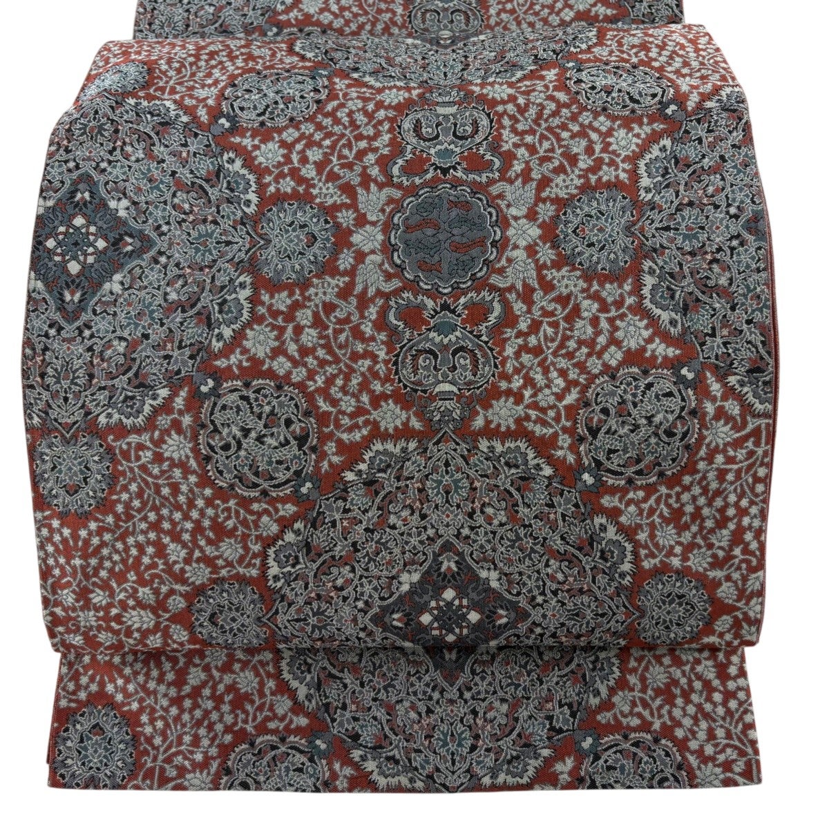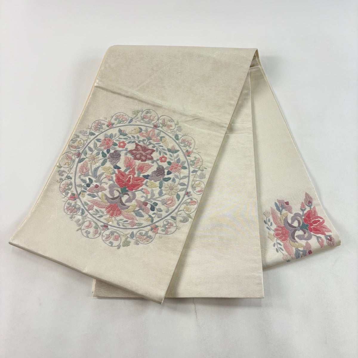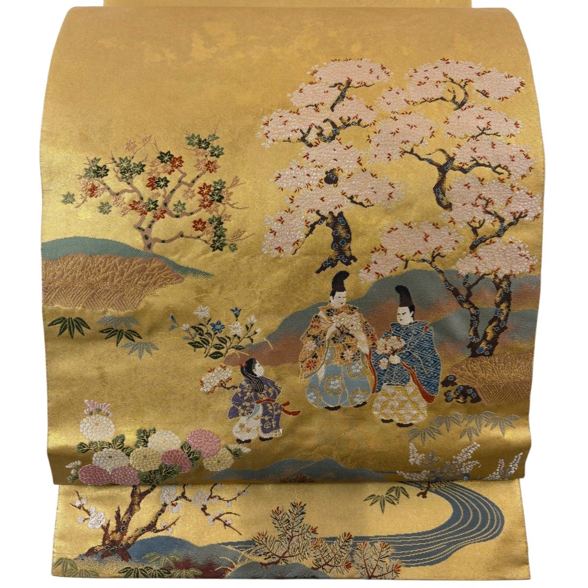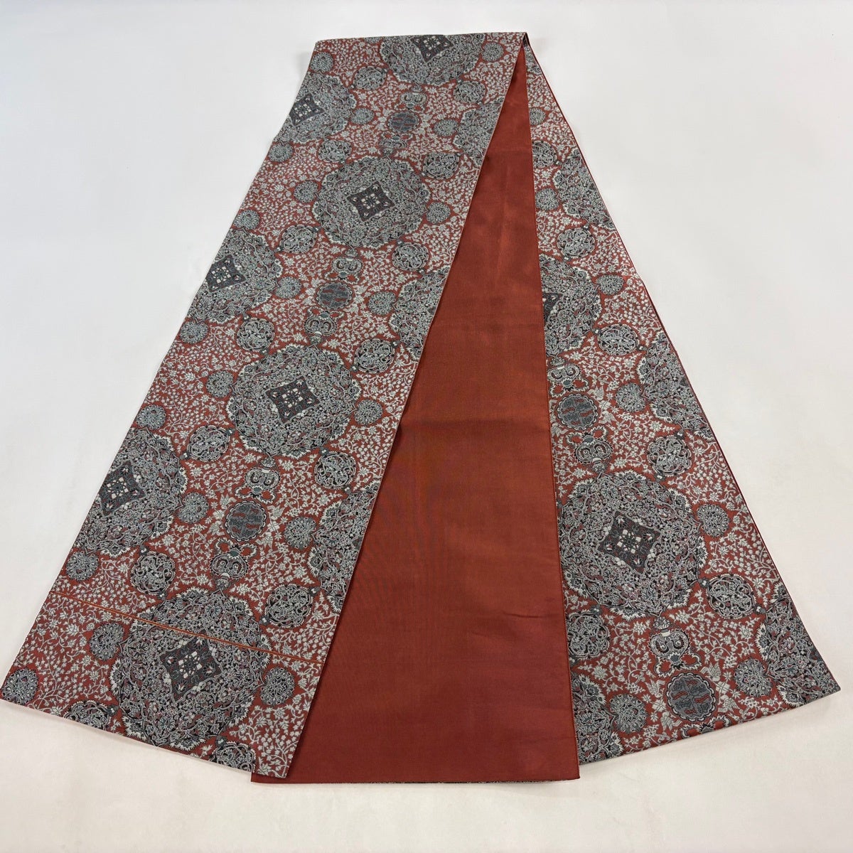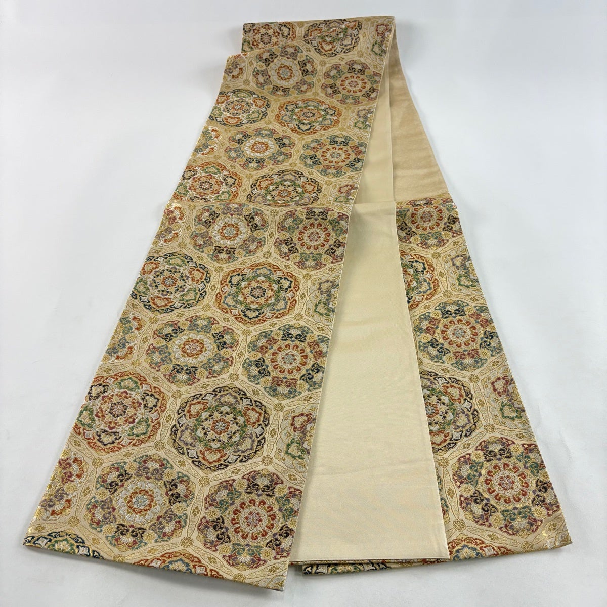 袋帯とは女性用の主にフォーマル用の帯で第一礼装として着用されることが多く、形状は表地にのみ柄があり裏地は無地になるように袋状に織って作成されたため袋帯という名が付きました。 帯を締める際にはおめでたいことが重なりますようにという願いが込められている二重太鼓や成人式の際に振袖に見かけるふくら雀や文庫結びなどの変わり結びを用いて着用します。