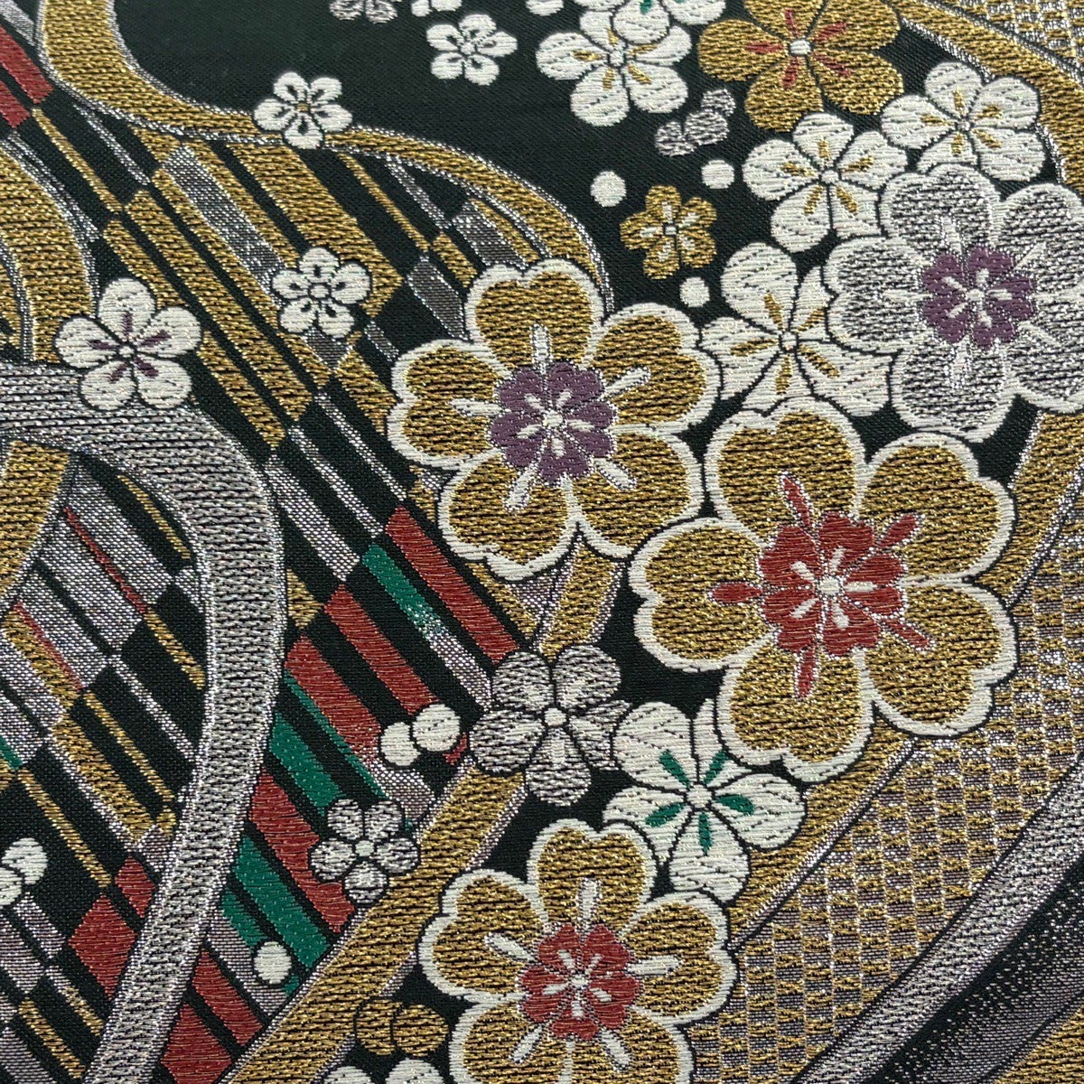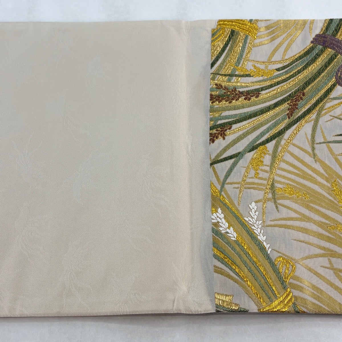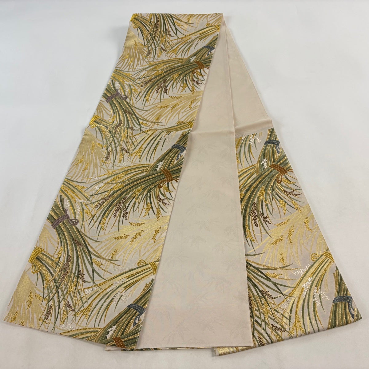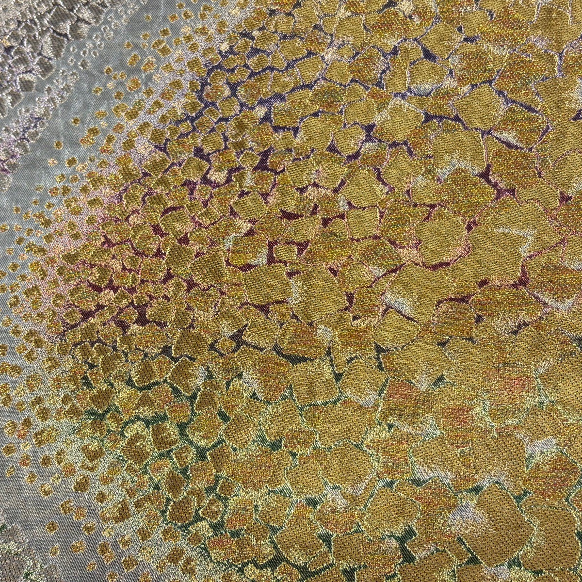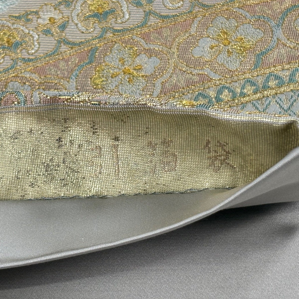 袋帯とは女性用の主にフォーマル用の帯で第一礼装として着用されることが多く、形状は表地にのみ柄があり裏地は無地になるように袋状に織って作成されたため袋帯という名が付きました。 帯を締める際にはおめでたいことが重なりますようにという願いが込められている二重太鼓や成人式の際に振袖に見かけるふくら雀や文庫結びなどの変わり結びを用いて着用します。
