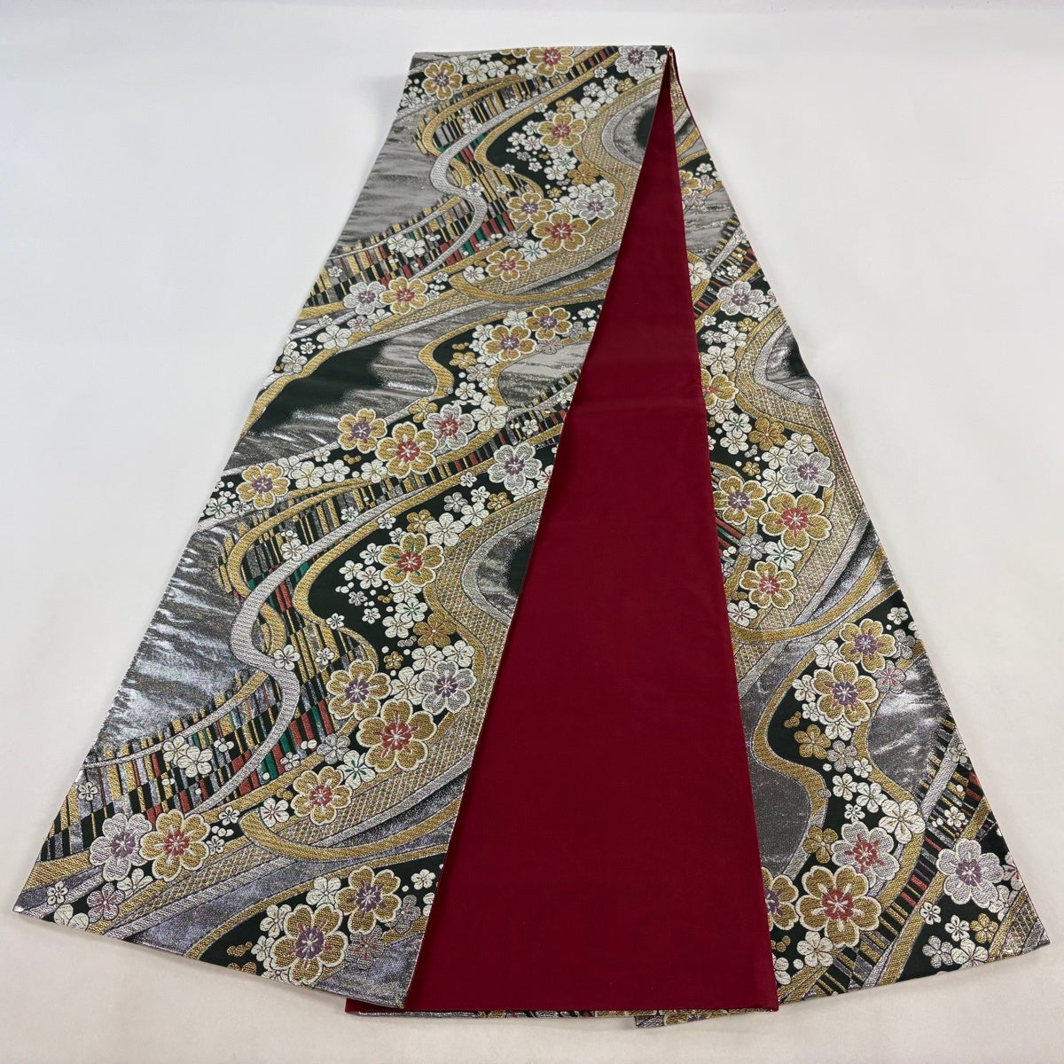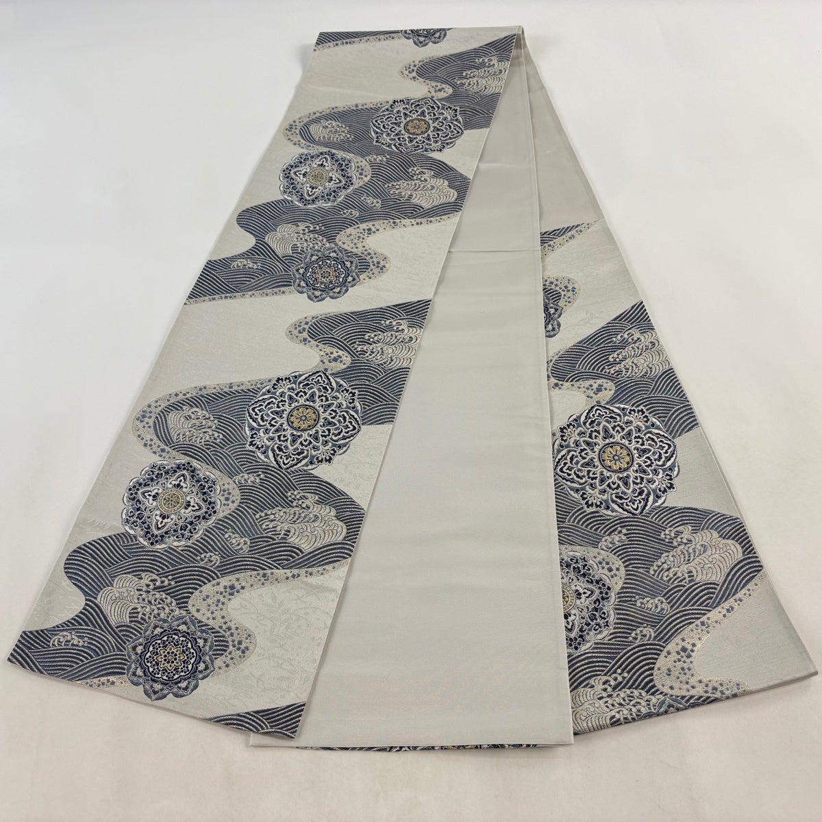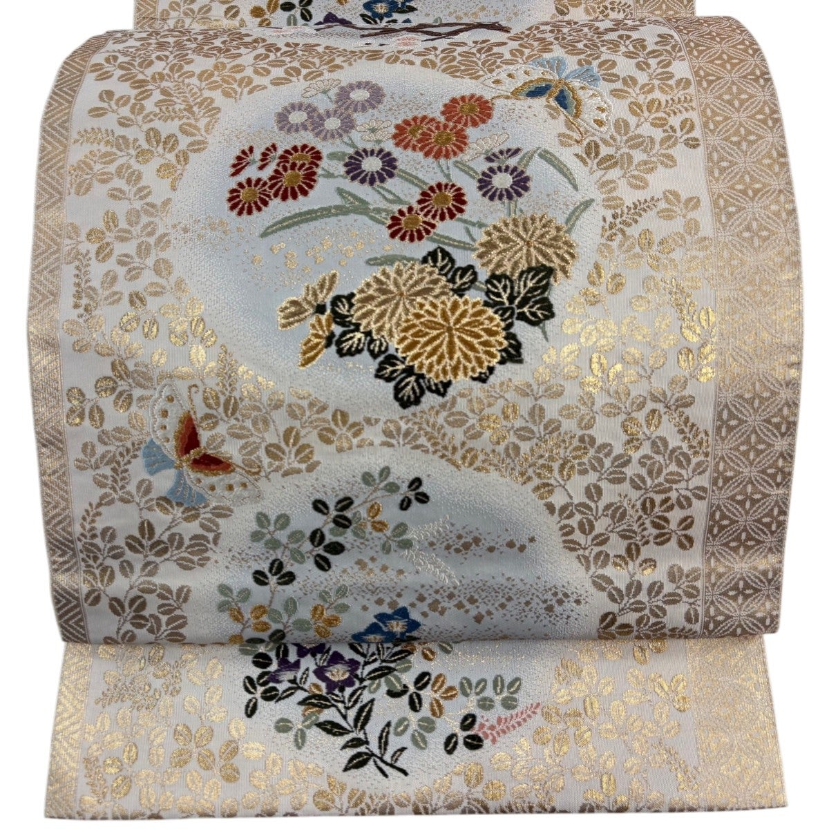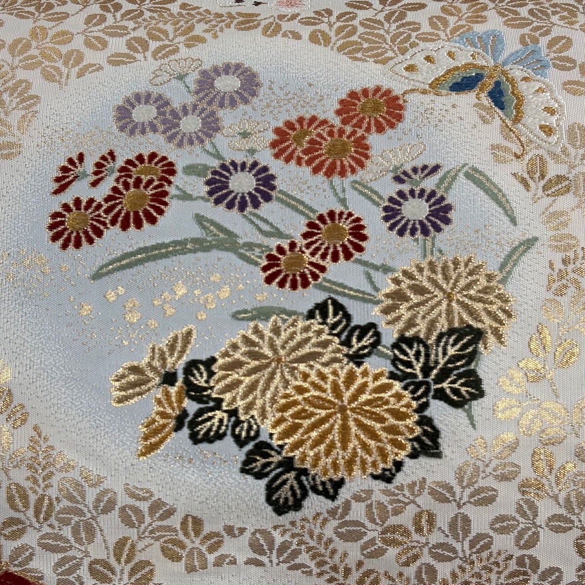 袋帯とは女性用の主にフォーマル用の帯で第一礼装として着用されることが多く、形状は表地にのみ柄があり裏地は無地になるように袋状に織って作成されたため袋帯という名が付きました。 帯を締める際にはおめでたいことが重なりますようにという願いが込められている二重太鼓や成人式の際に振袖に見かけるふくら雀や文庫結びなどの変わり結びを用いて着用します。