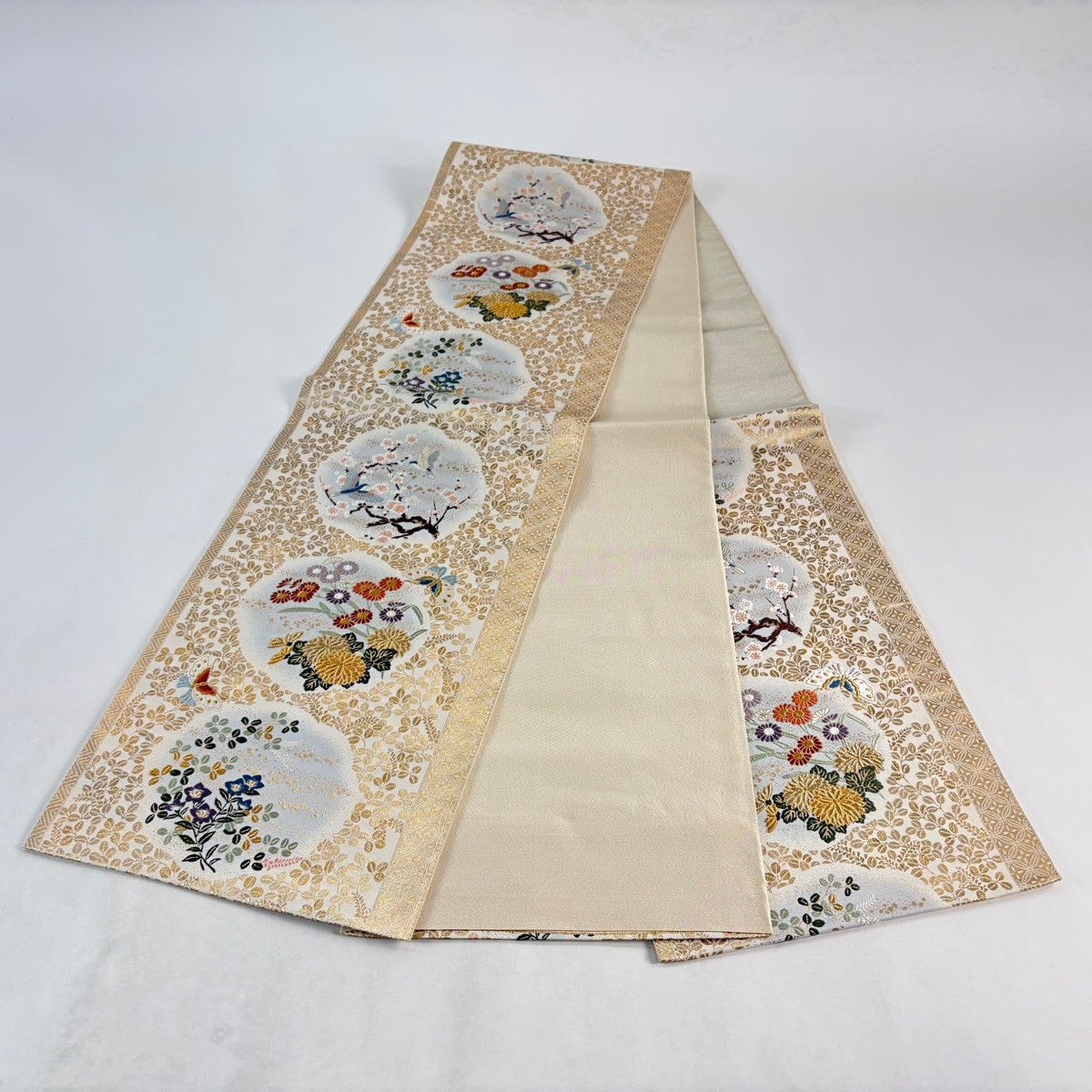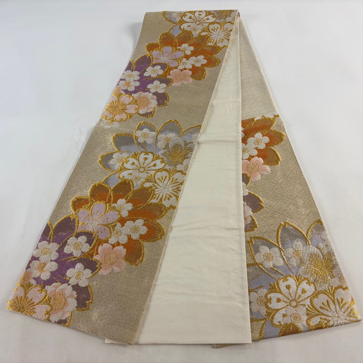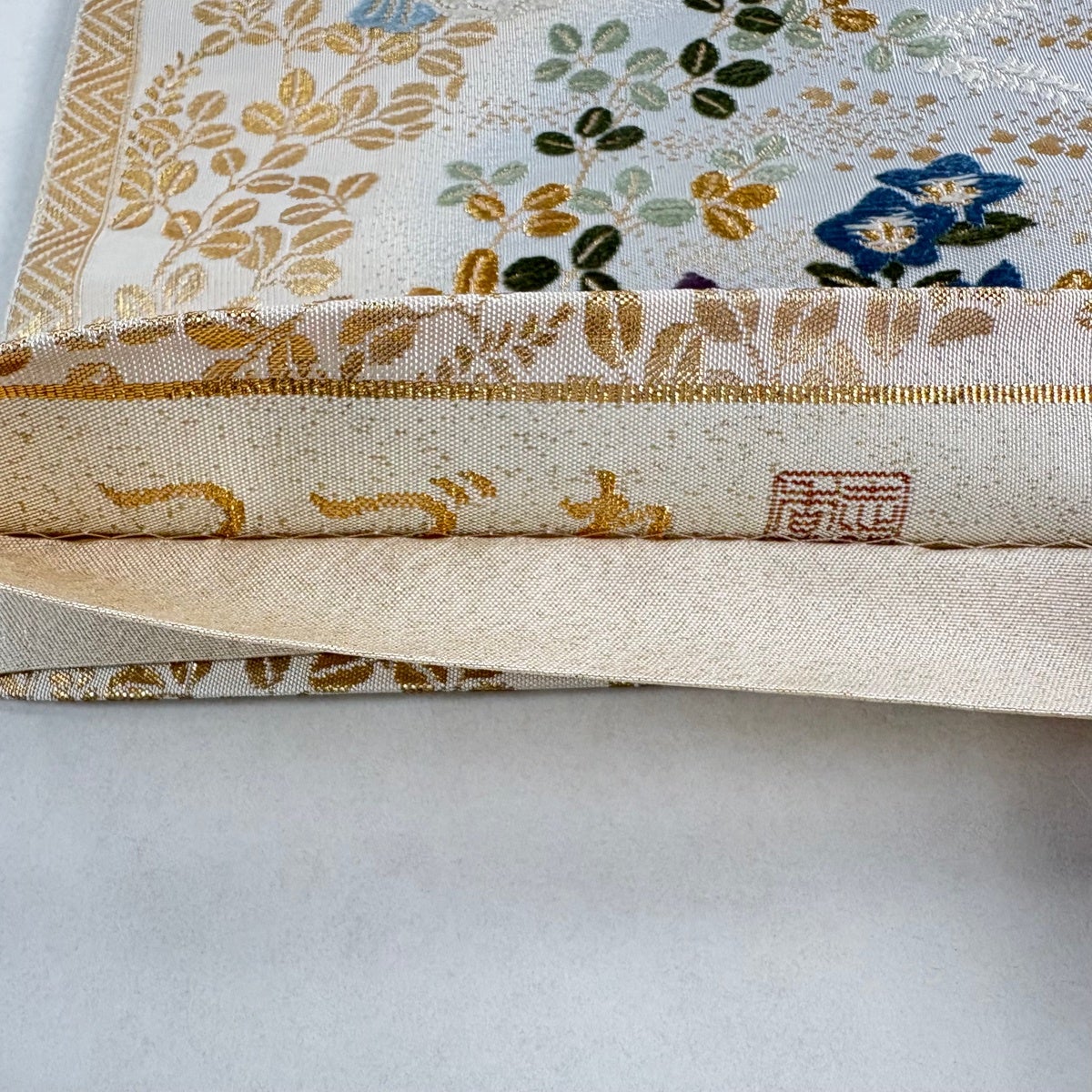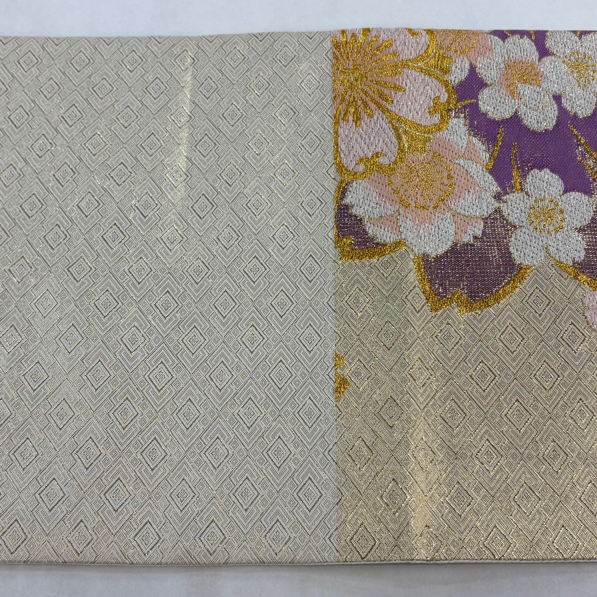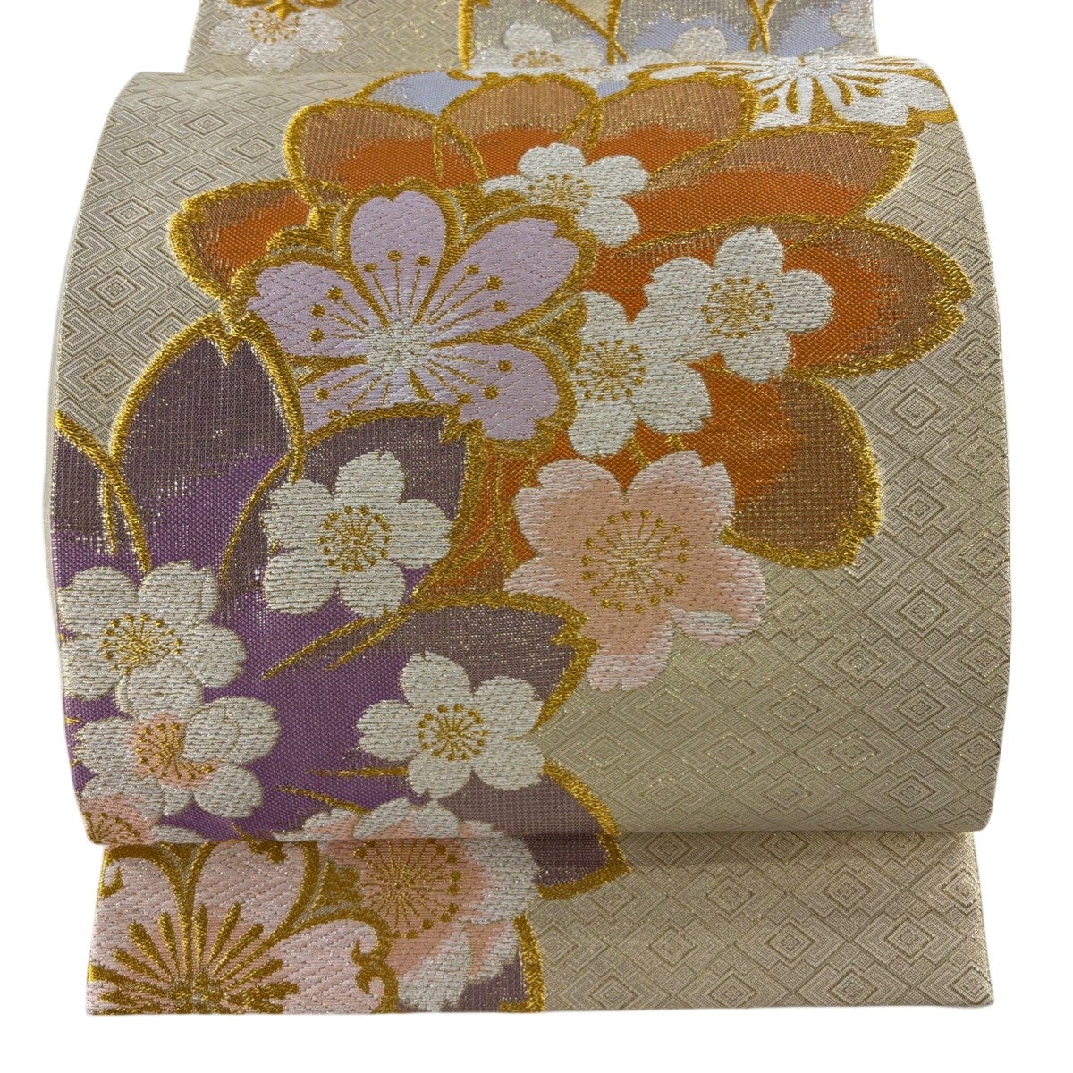袋帯とは女性用の主にフォーマル用の帯で第一礼装として着用されることが多く、形状は表地にのみ柄があり裏地は無地になるように袋状に織って作成されたため袋帯という名が付きました。 帯を締める際にはおめでたいことが重なりますようにという願いが込められている二重太鼓や成人式の際に振袖に見かけるふくら雀や文庫結びなどの変わり結びを用いて着用します。