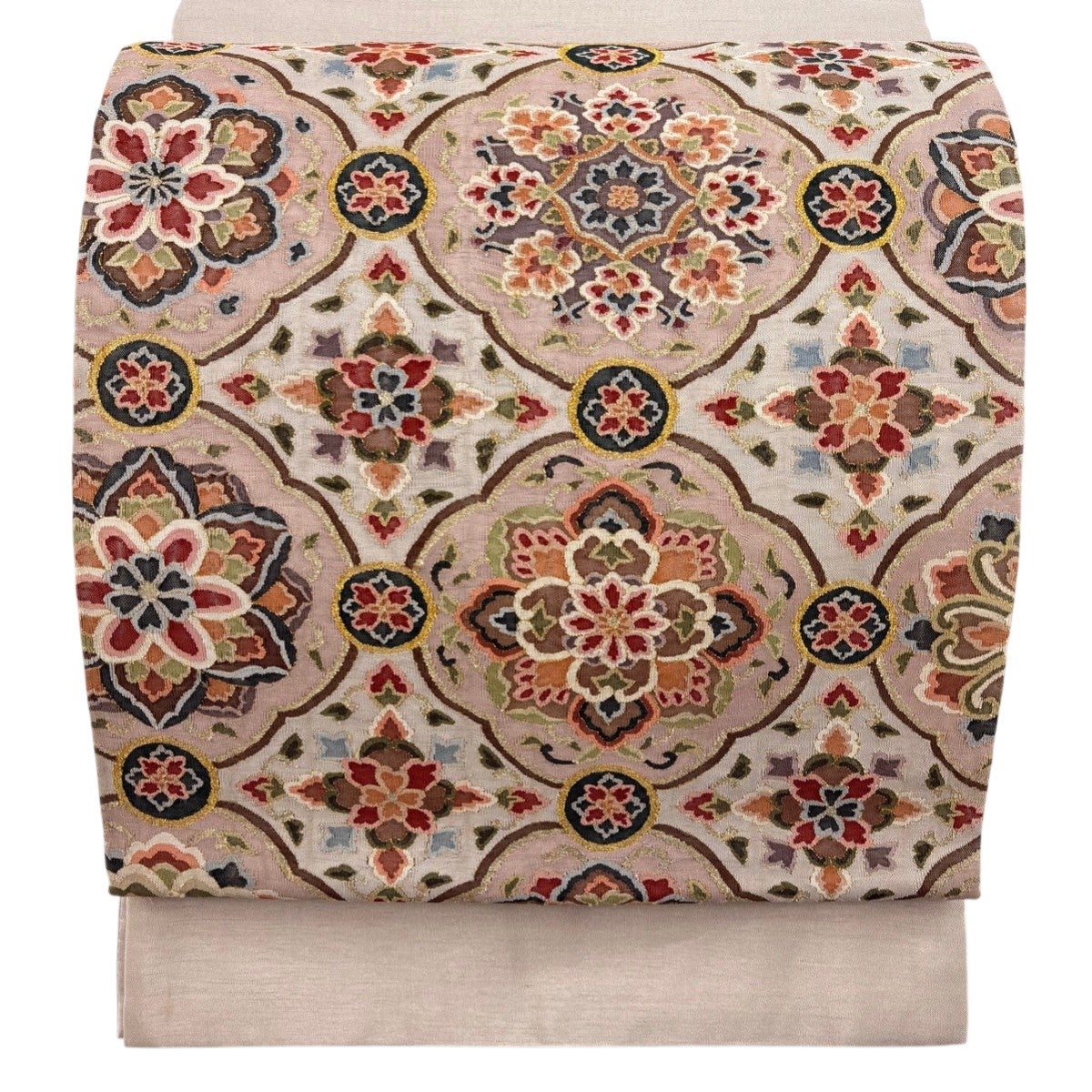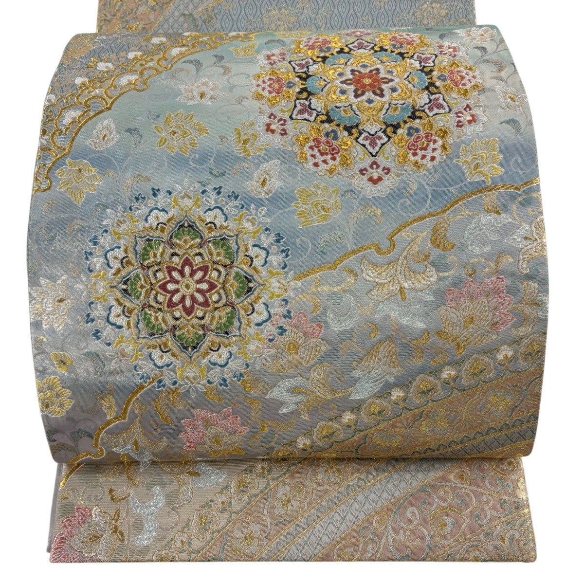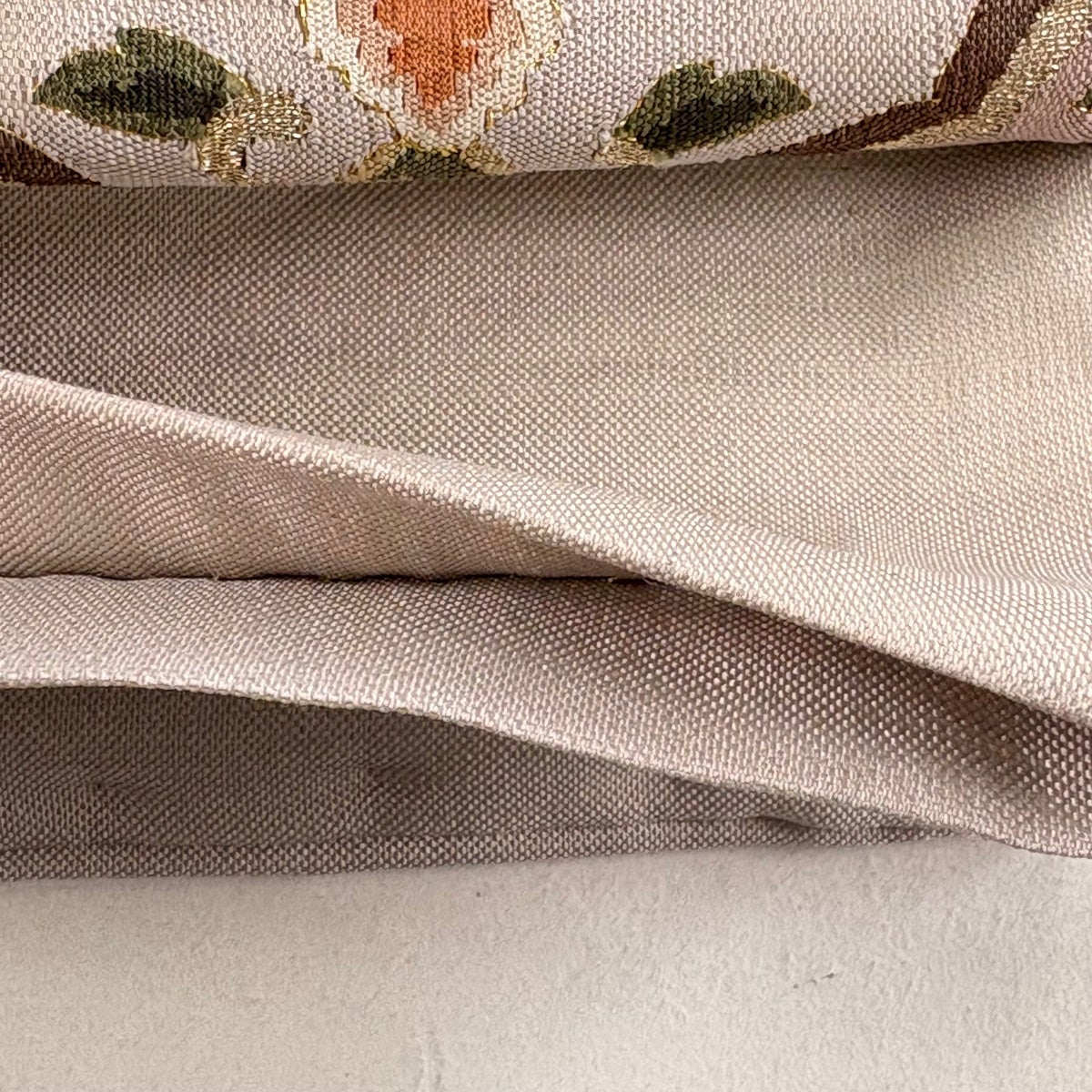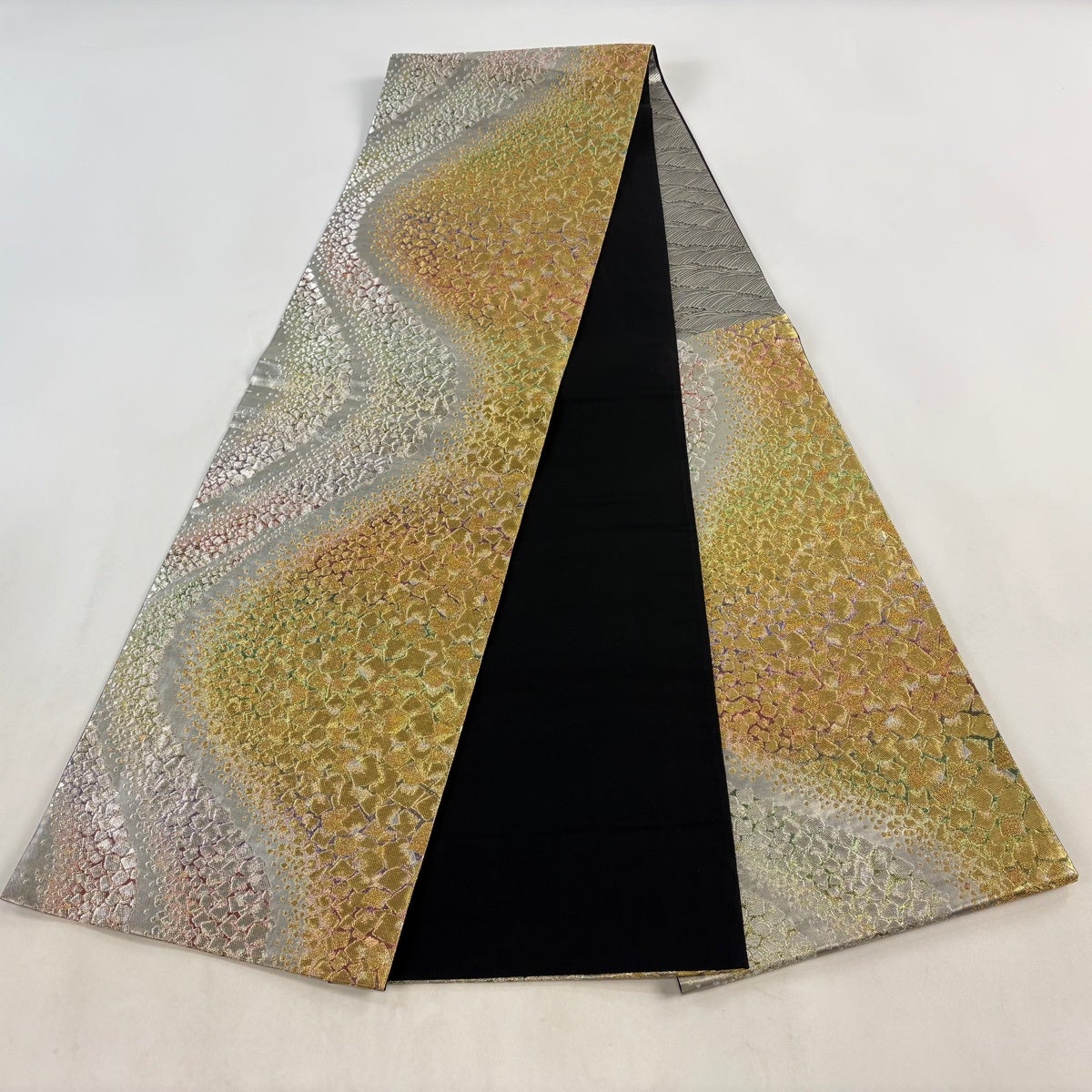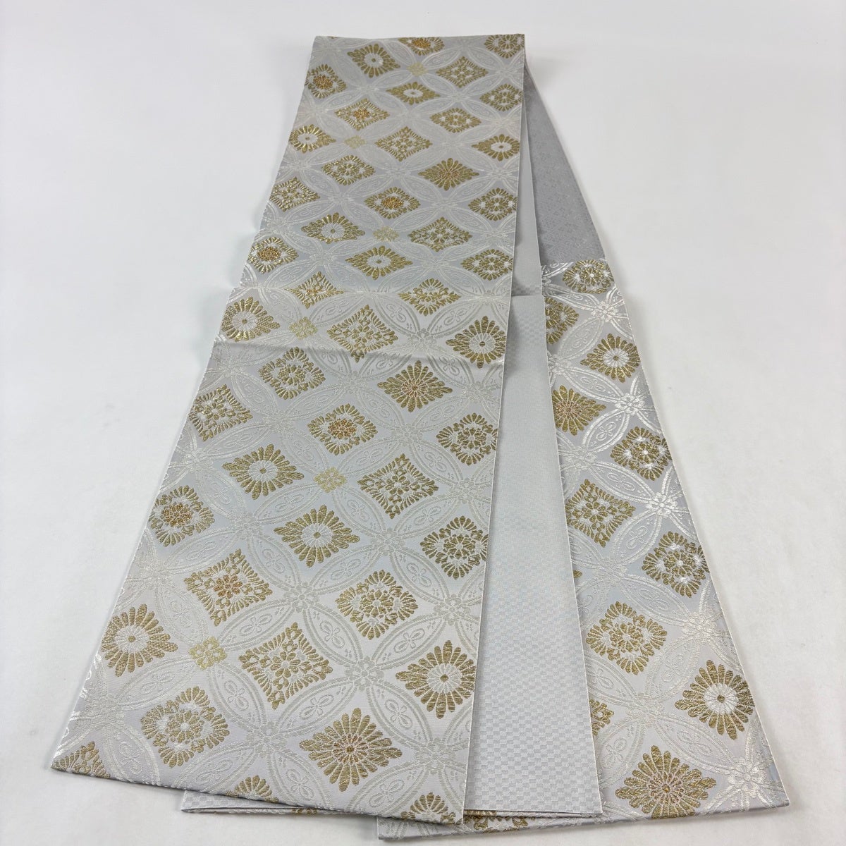 袋帯とは女性用の主にフォーマル用の帯で第一礼装として着用されることが多く、形状は表地にのみ柄があり裏地は無地になるように袋状に織って作成されたため袋帯という名が付きました。 帯を締める際にはおめでたいことが重なりますようにという願いが込められている二重太鼓や成人式の際に振袖に見かけるふくら雀や文庫結びなどの変わり結びを用いて着用します。