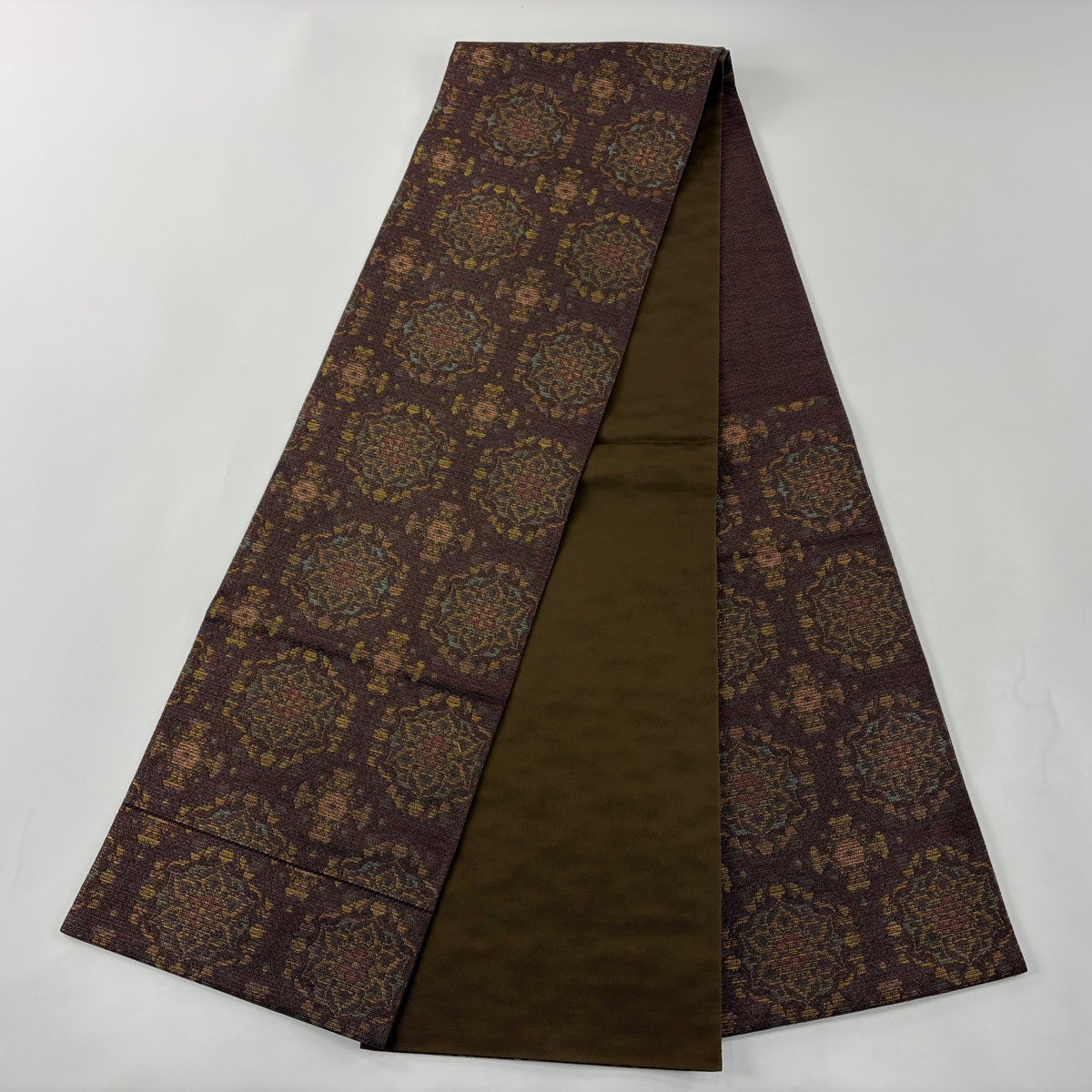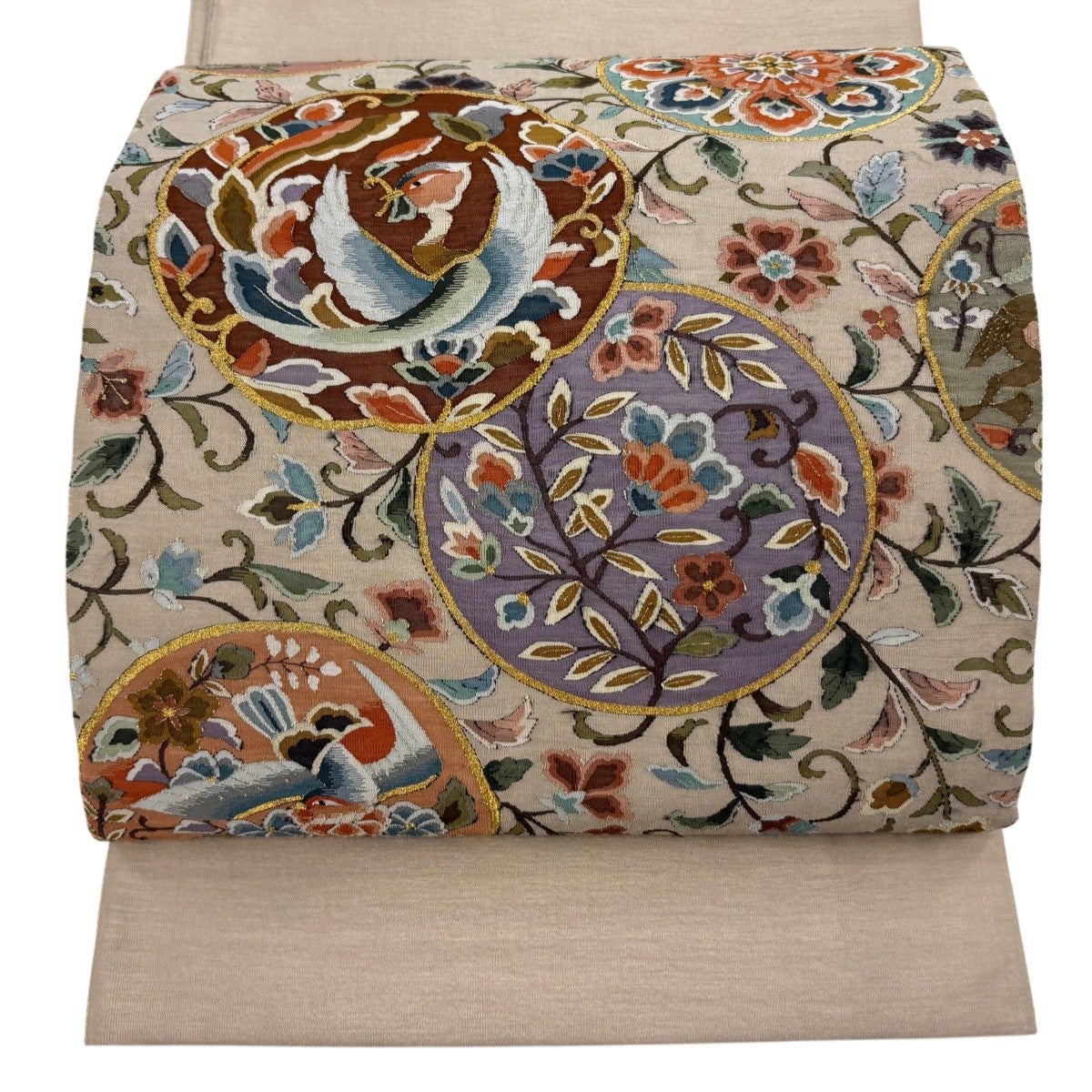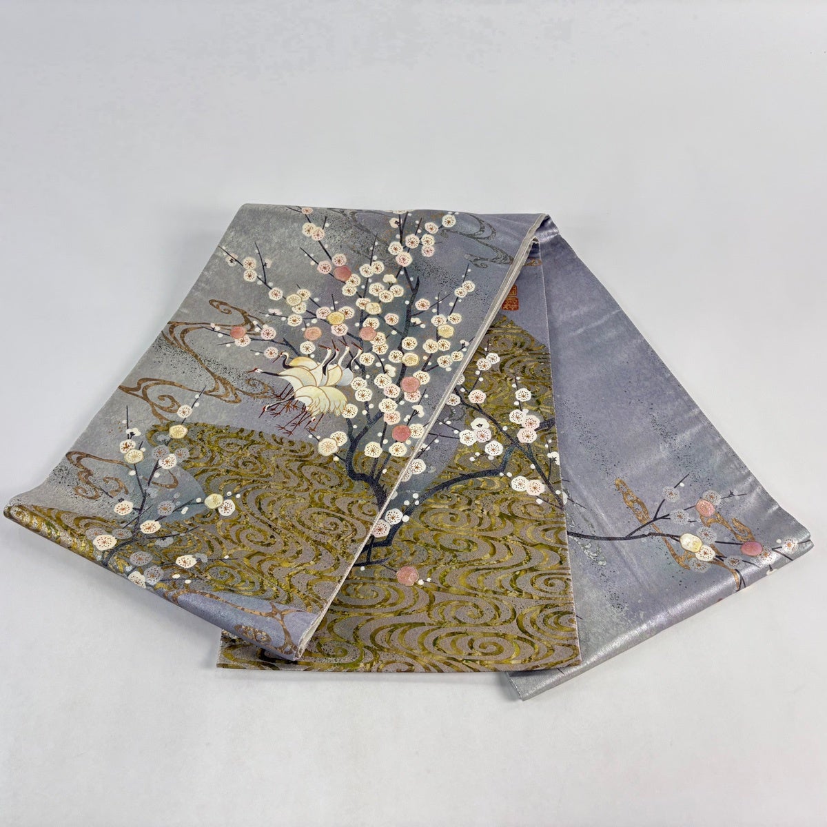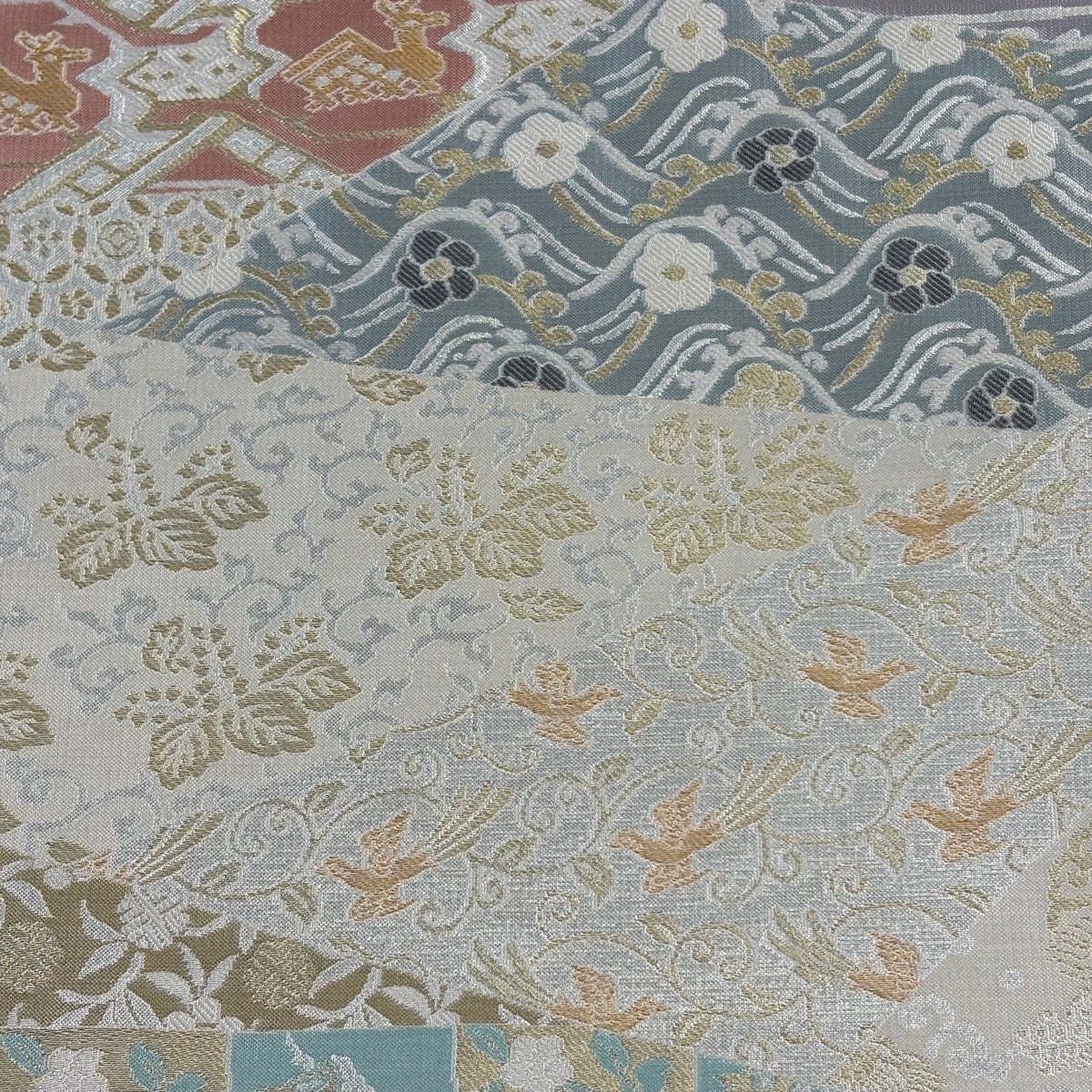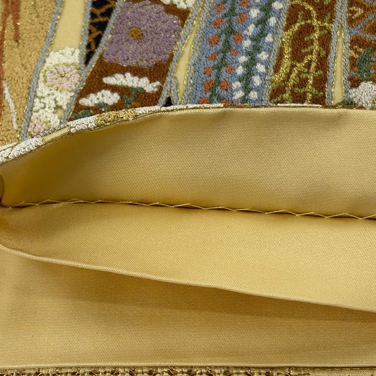 袋帯とは女性用の主にフォーマル用の帯で第一礼装として着用されることが多く、形状は表地にのみ柄があり裏地は無地になるように袋状に織って作成されたため袋帯という名が付きました。 帯を締める際にはおめでたいことが重なりますようにという願いが込められている二重太鼓や成人式の際に振袖に見かけるふくら雀や文庫結びなどの変わり結びを用いて着用します。
