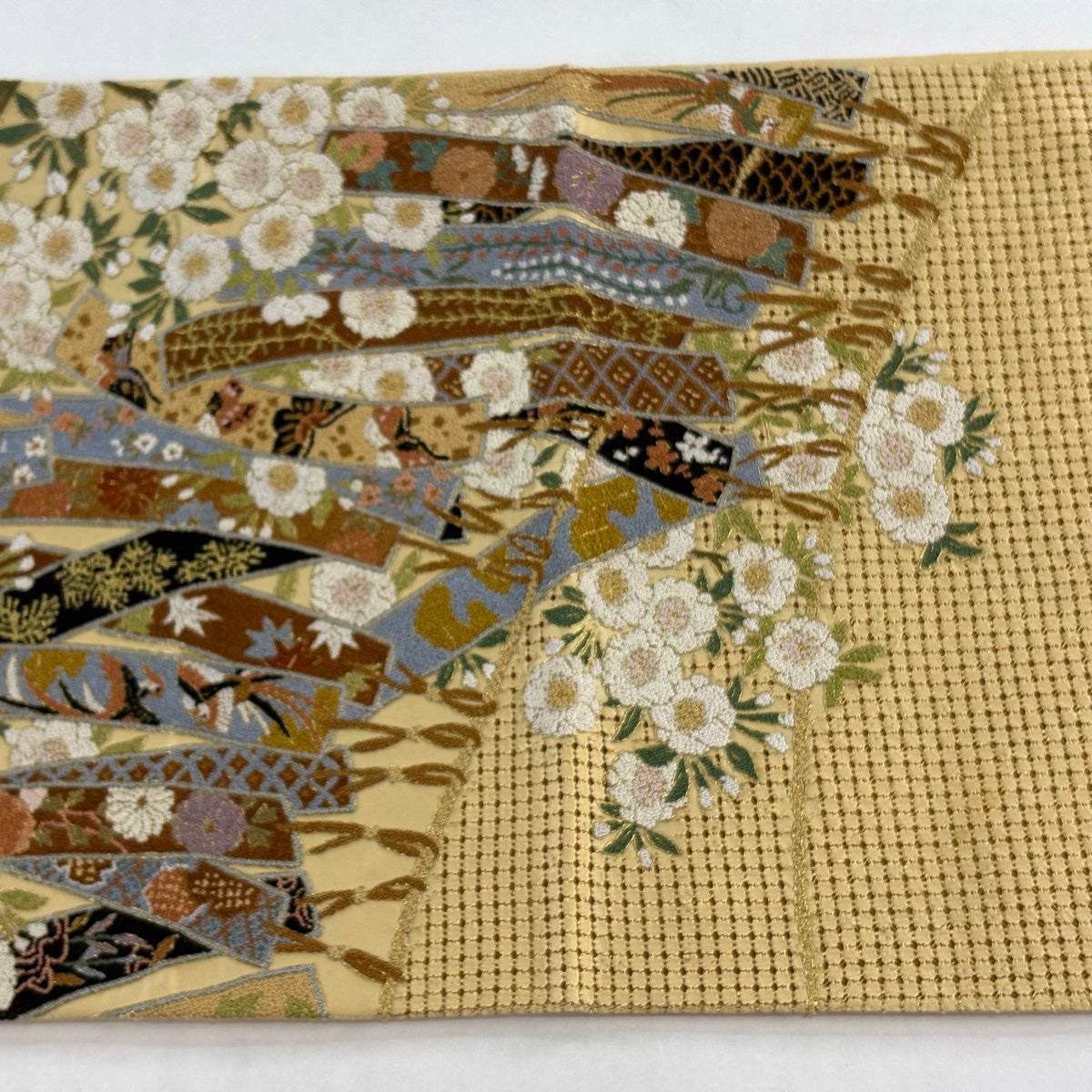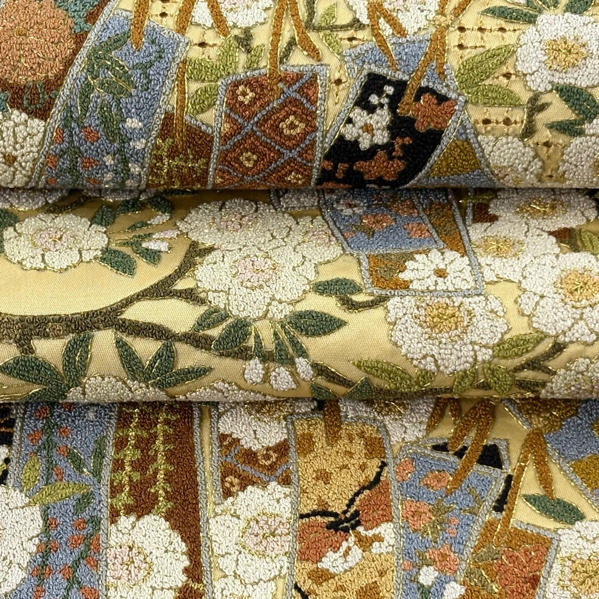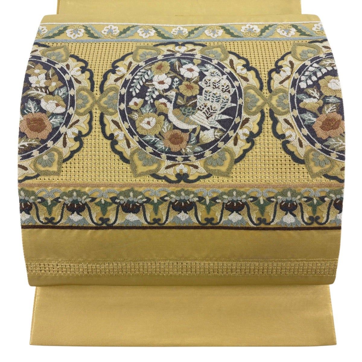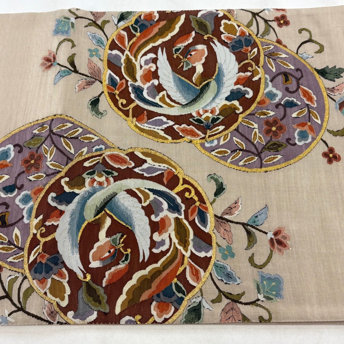 袋帯とは女性用の主にフォーマル用の帯で第一礼装として着用されることが多く、形状は表地にのみ柄があり裏地は無地になるように袋状に織って作成されたため袋帯という名が付きました。 帯を締める際にはおめでたいことが重なりますようにという願いが込められている二重太鼓や成人式の際に振袖に見かけるふくら雀や文庫結びなどの変わり結びを用いて着用します。