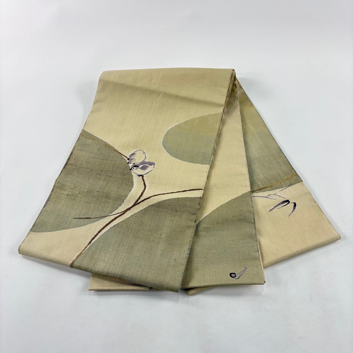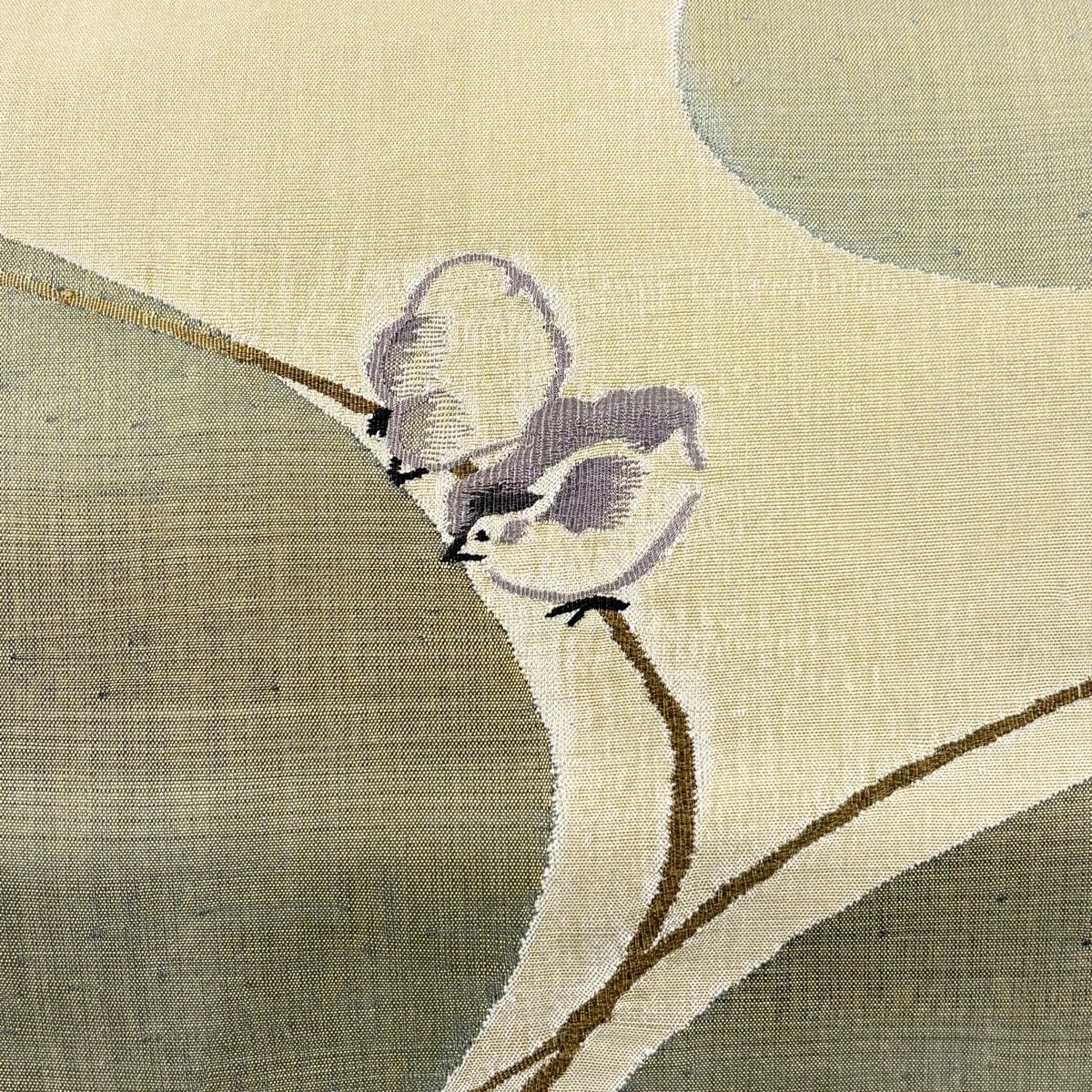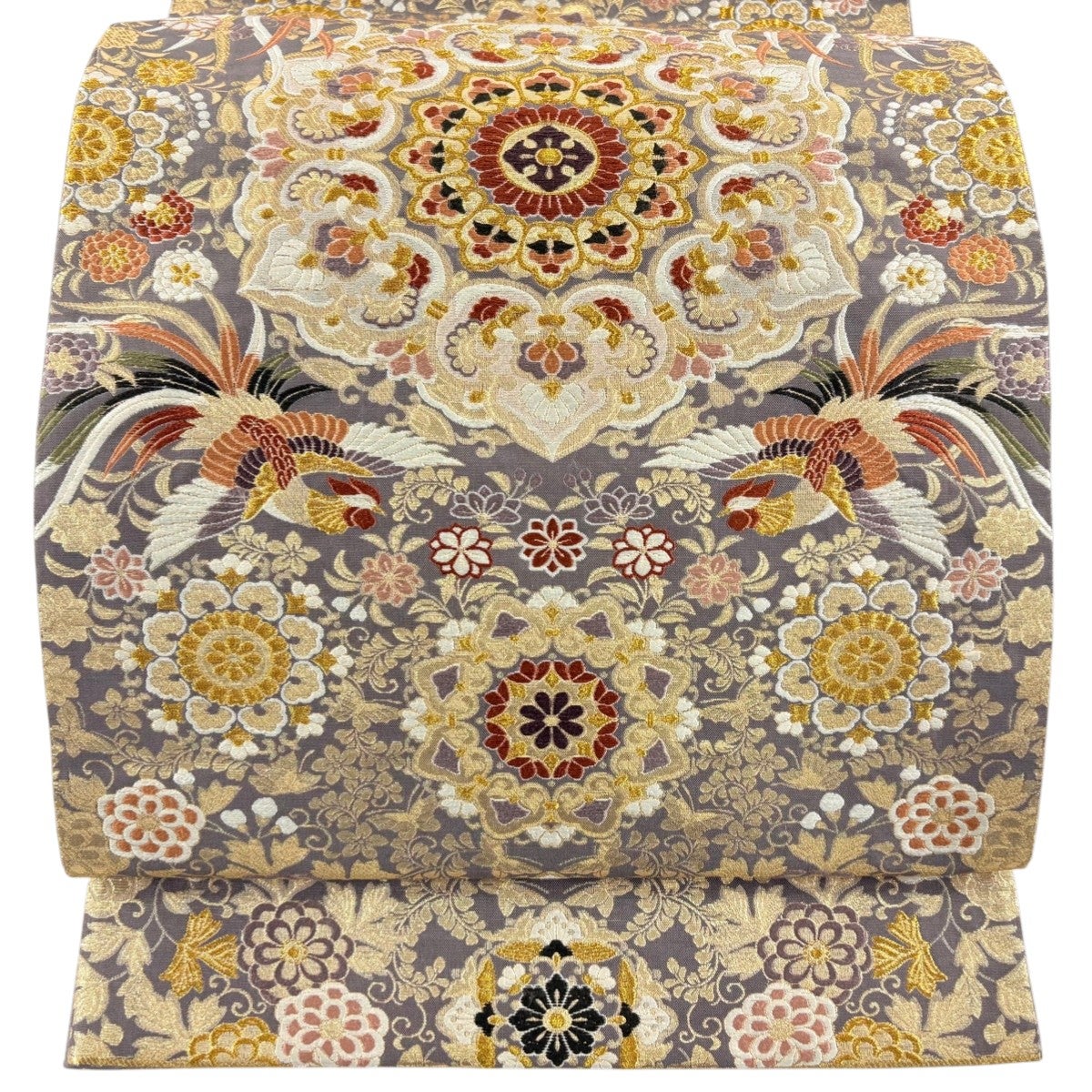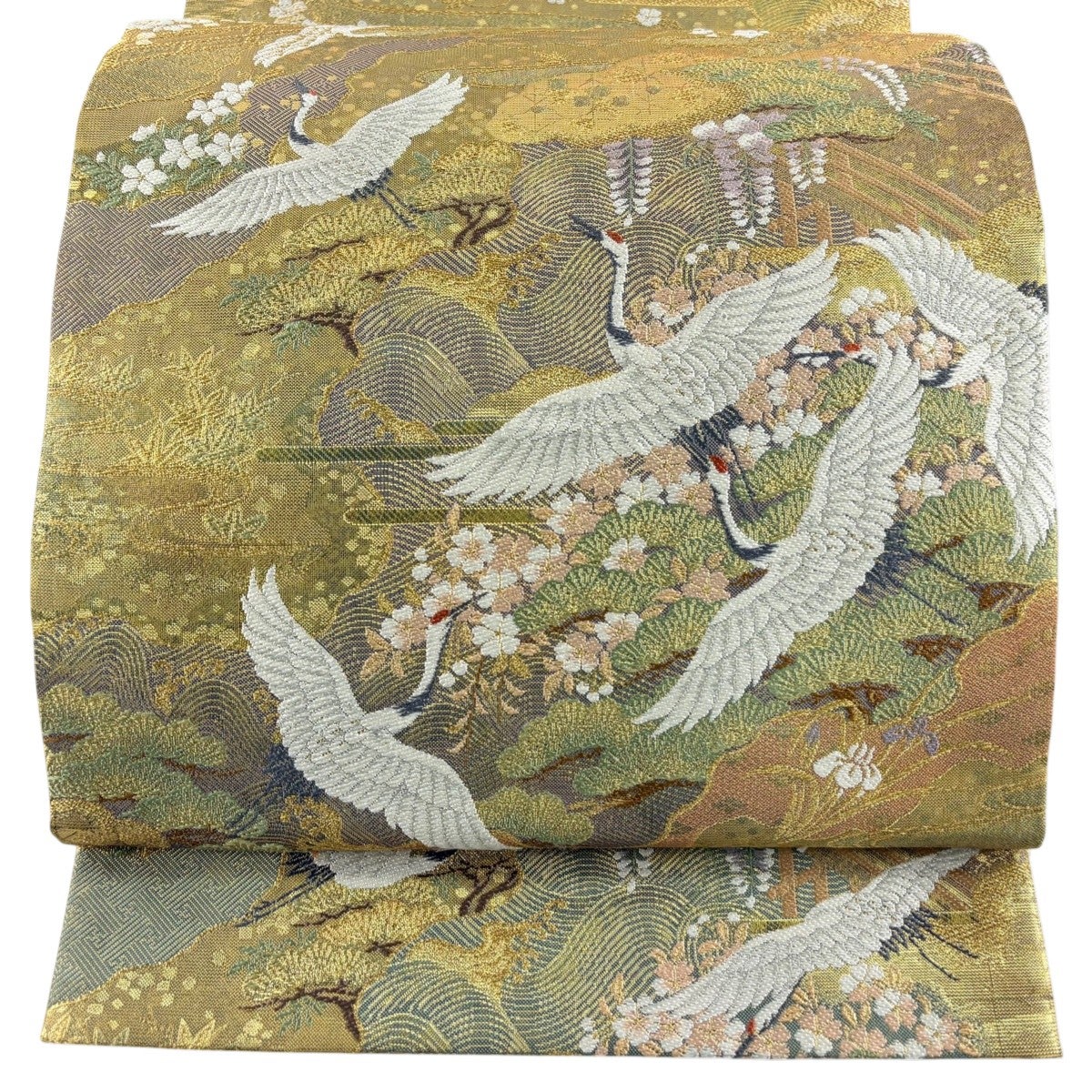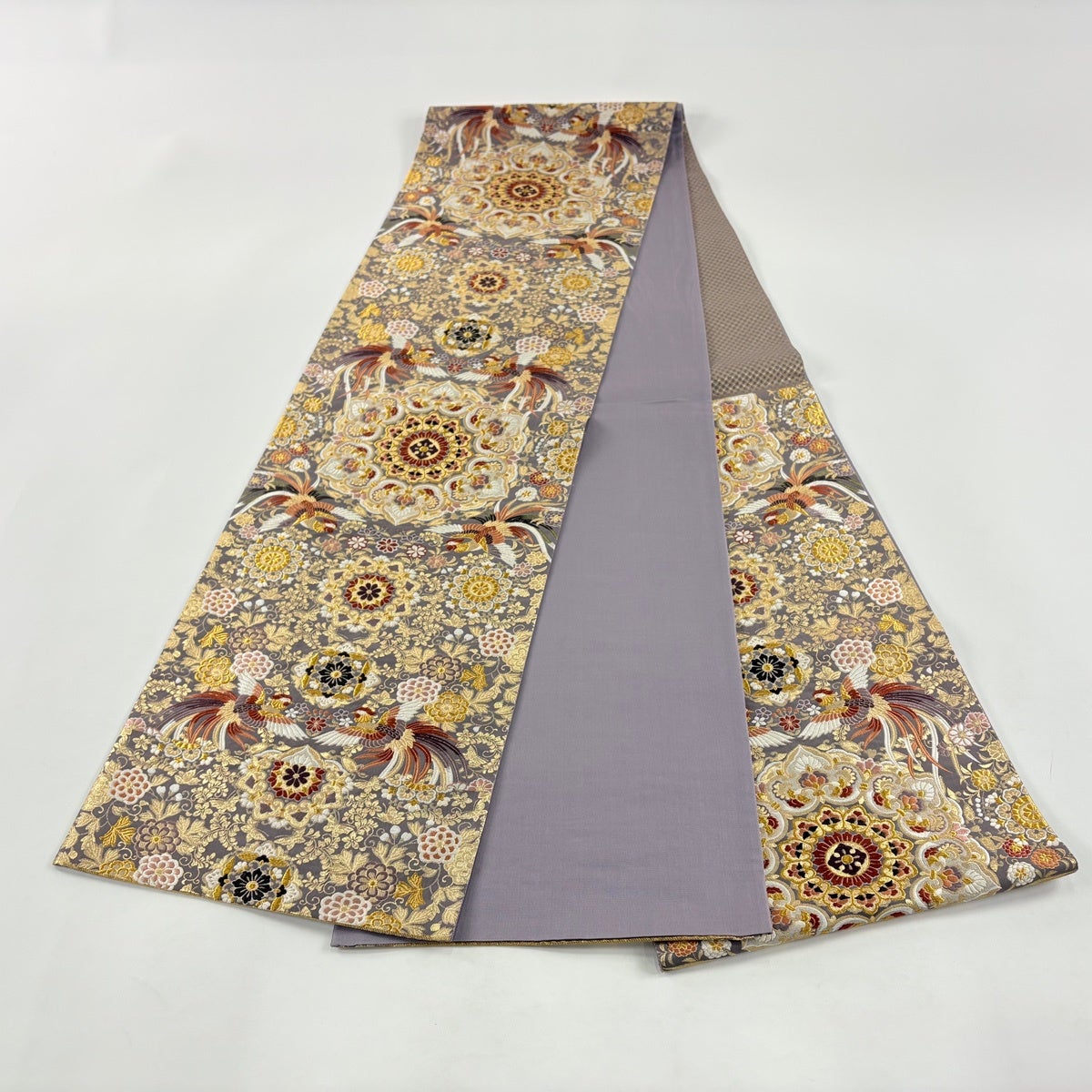 袋帯とは女性用の主にフォーマル用の帯で第一礼装として着用されることが多く、形状は表地にのみ柄があり裏地は無地になるように袋状に織って作成されたため袋帯という名が付きました。 帯を締める際にはおめでたいことが重なりますようにという願いが込められている二重太鼓や成人式の際に振袖に見かけるふくら雀や文庫結びなどの変わり結びを用いて着用します。
