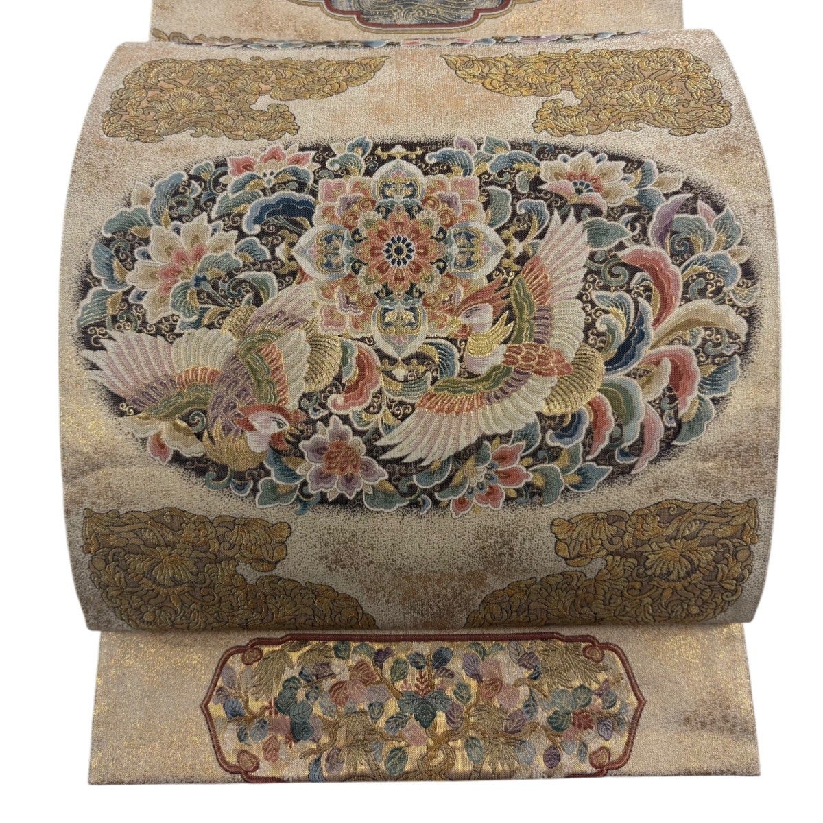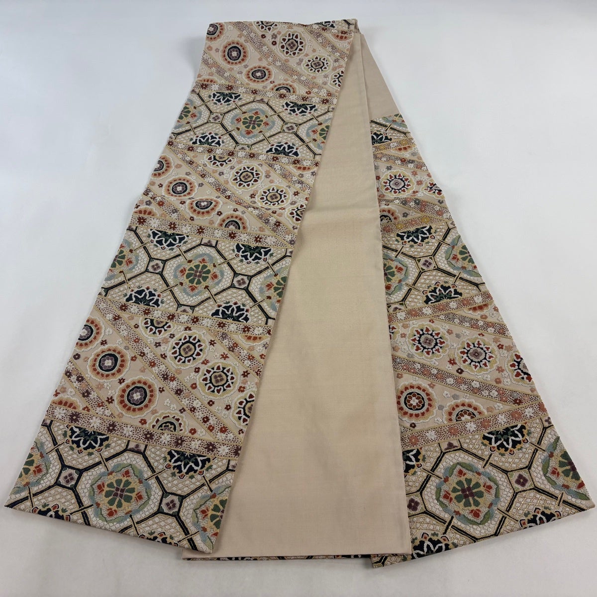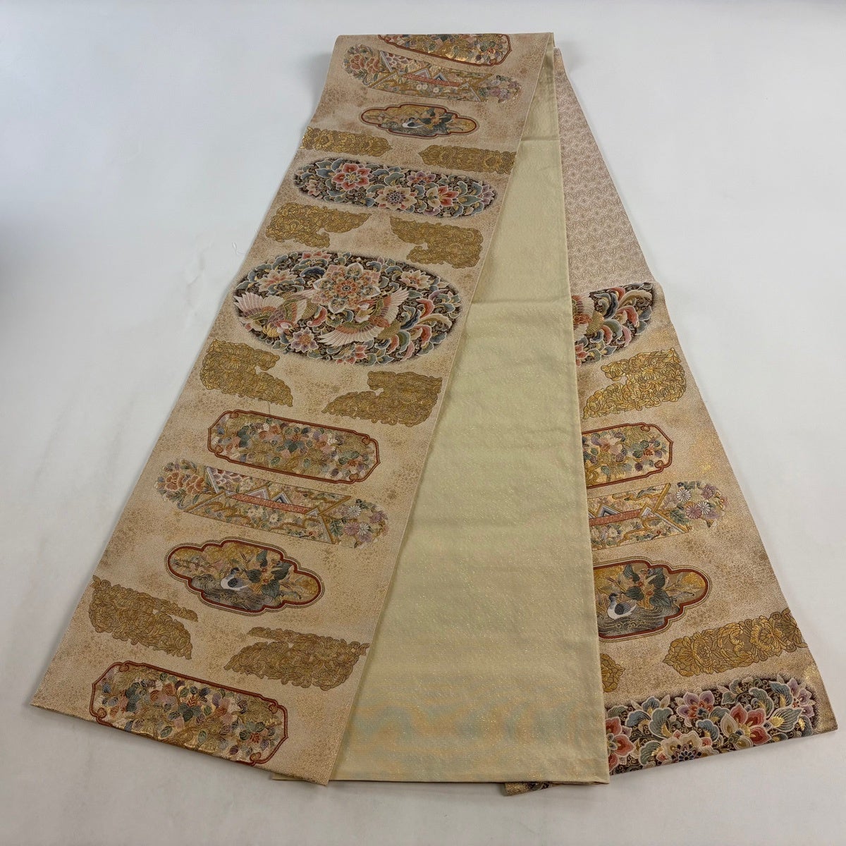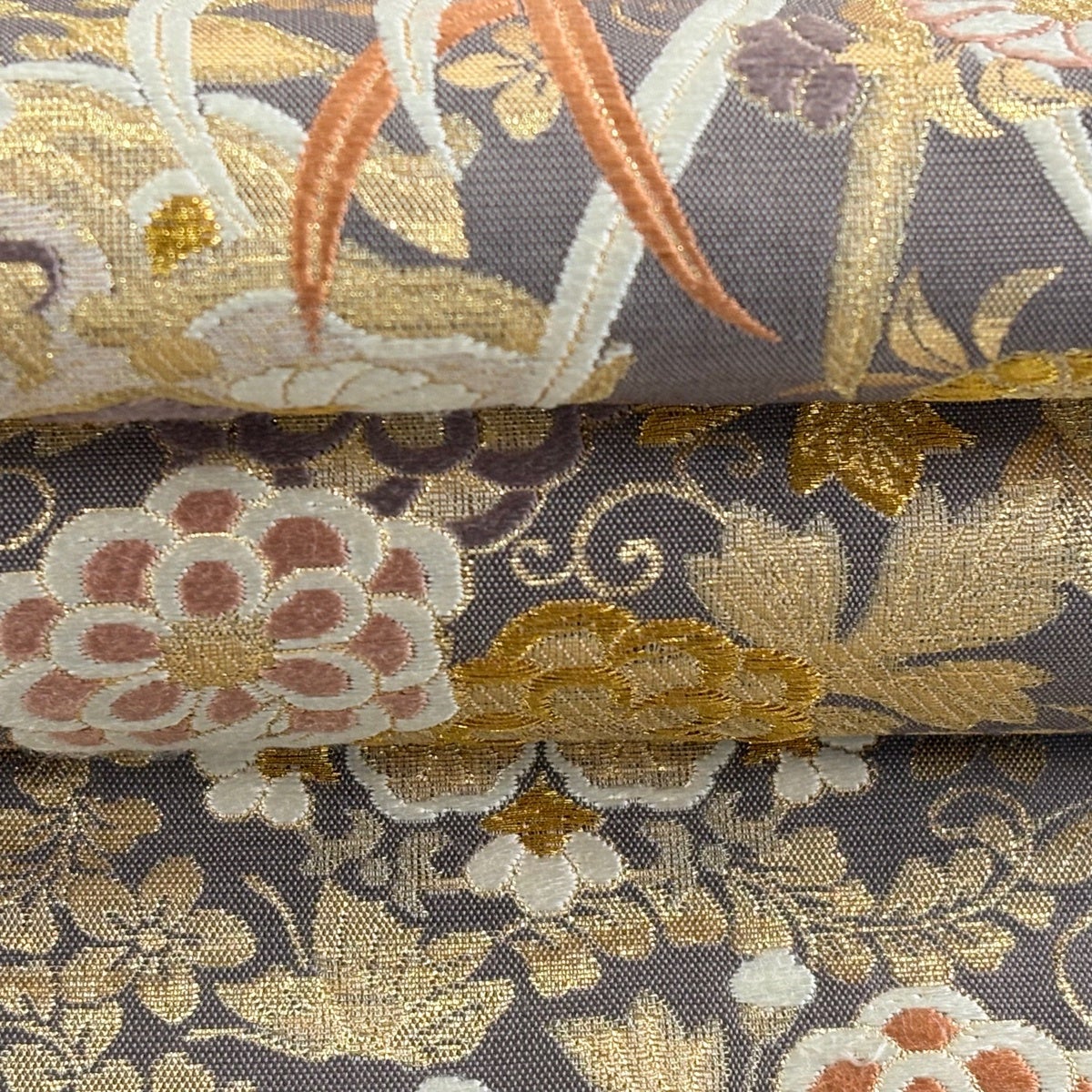 袋帯とは女性用の主にフォーマル用の帯で第一礼装として着用されることが多く、形状は表地にのみ柄があり裏地は無地になるように袋状に織って作成されたため袋帯という名が付きました。 帯を締める際にはおめでたいことが重なりますようにという願いが込められている二重太鼓や成人式の際に振袖に見かけるふくら雀や文庫結びなどの変わり結びを用いて着用します。