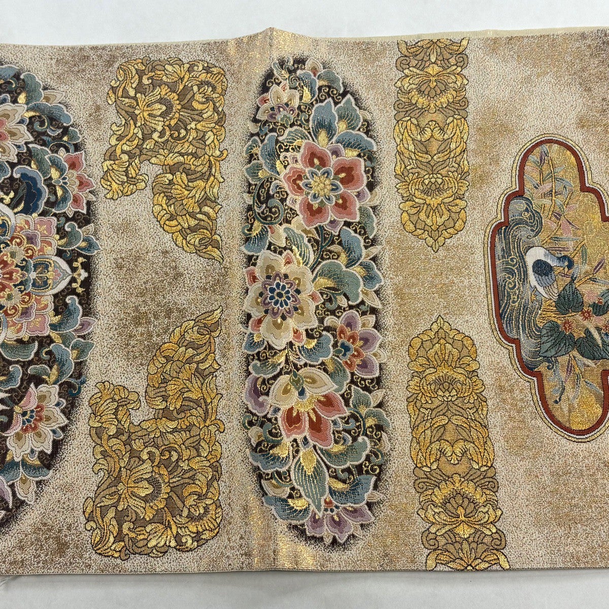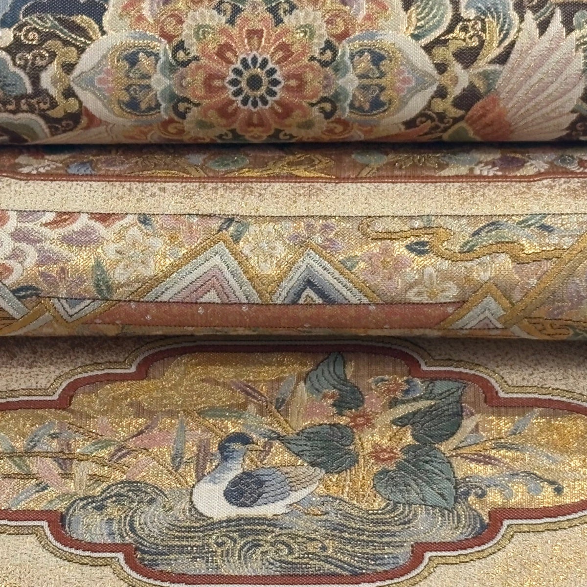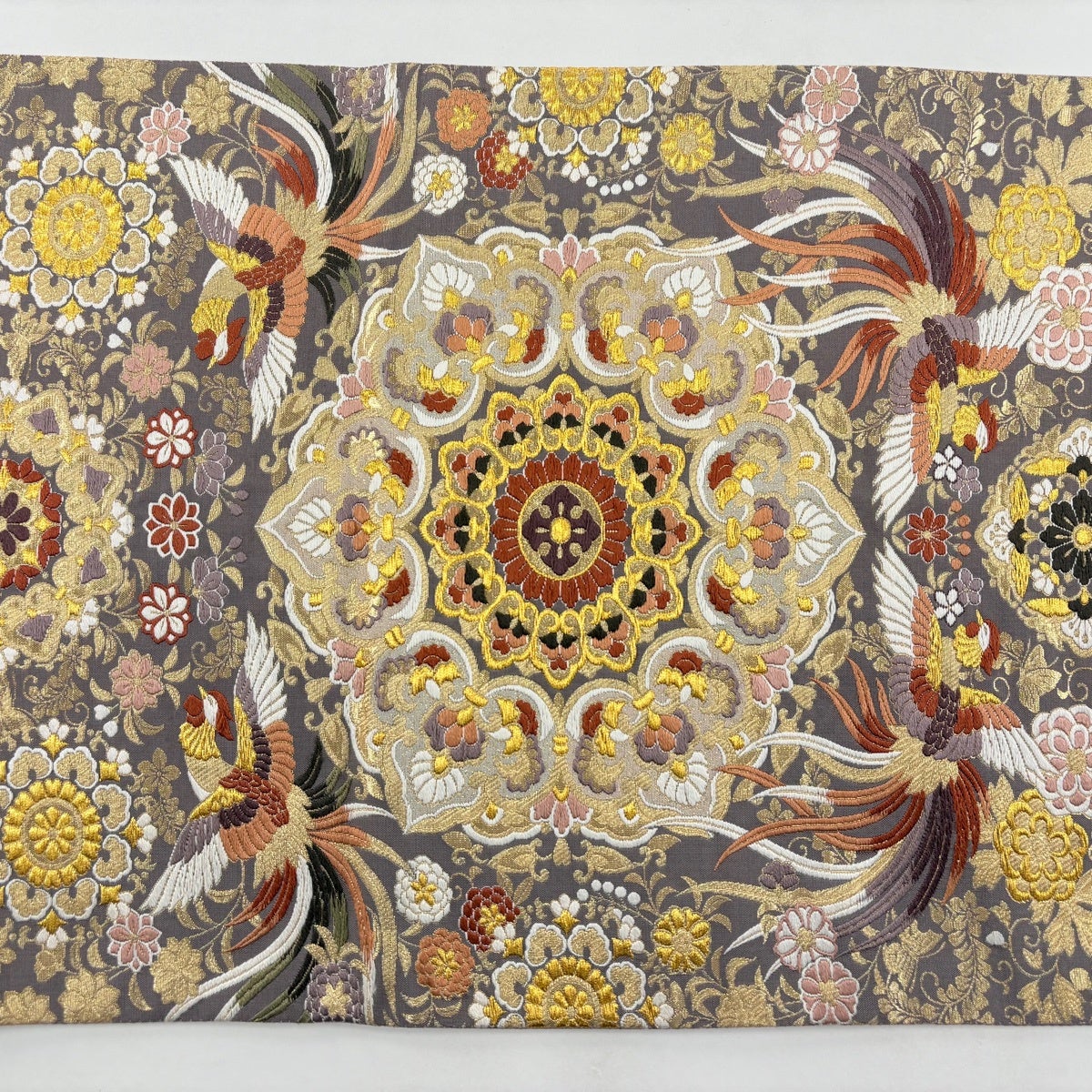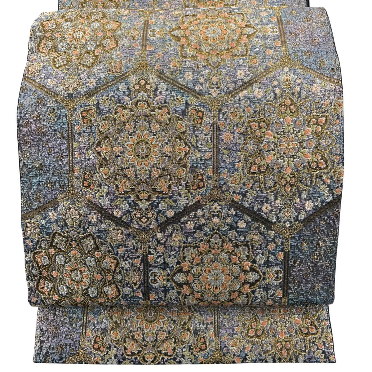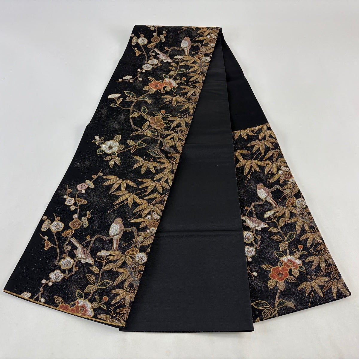袋帯とは女性用の主にフォーマル用の帯で第一礼装として着用されることが多く、形状は表地にのみ柄があり裏地は無地になるように袋状に織って作成されたため袋帯という名が付きました。 帯を締める際にはおめでたいことが重なりますようにという願いが込められている二重太鼓や成人式の際に振袖に見かけるふくら雀や文庫結びなどの変わり結びを用いて着用します。
