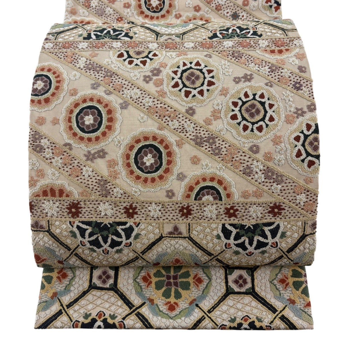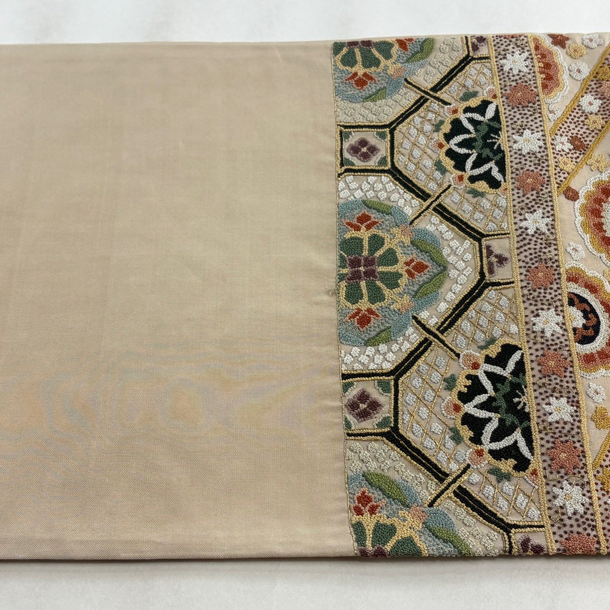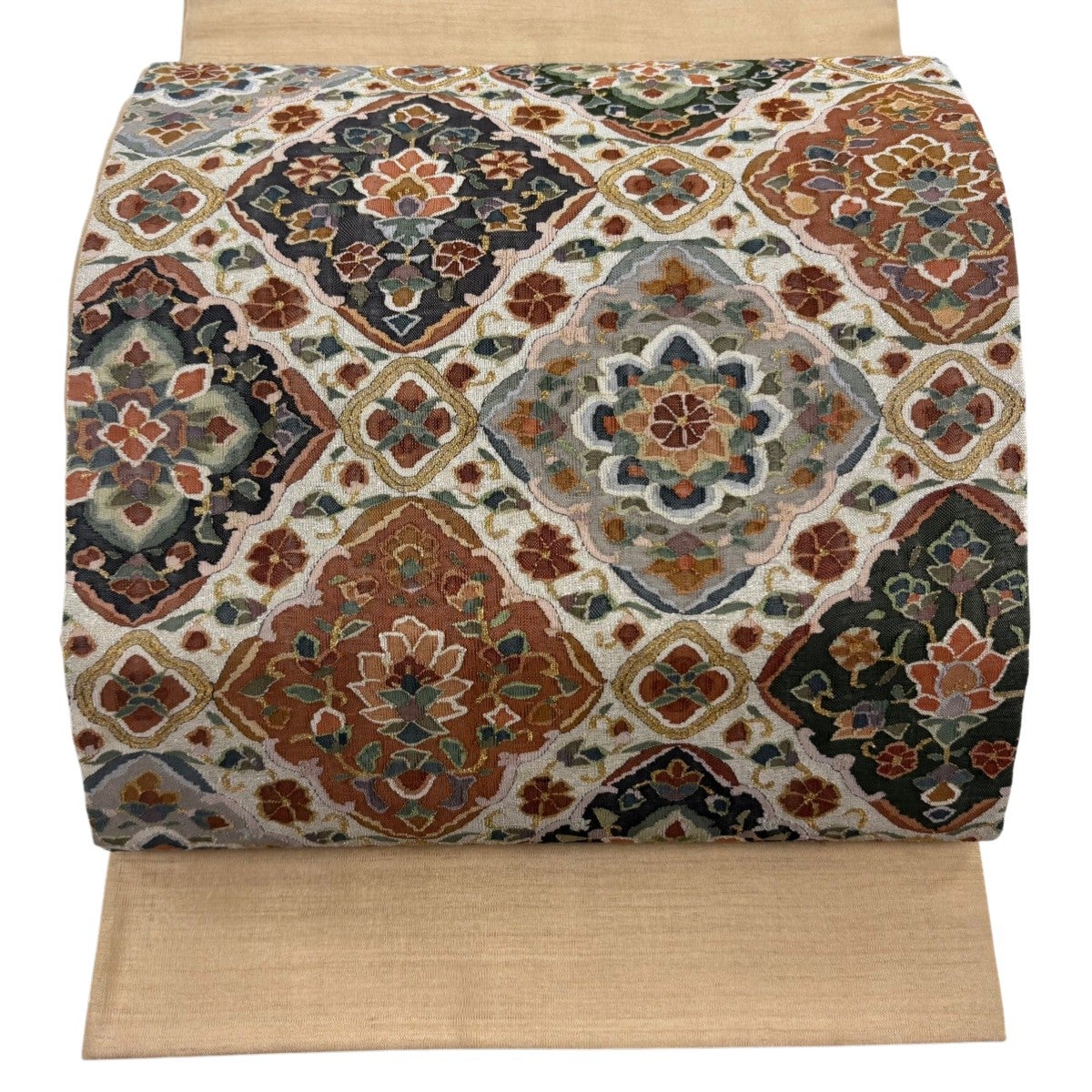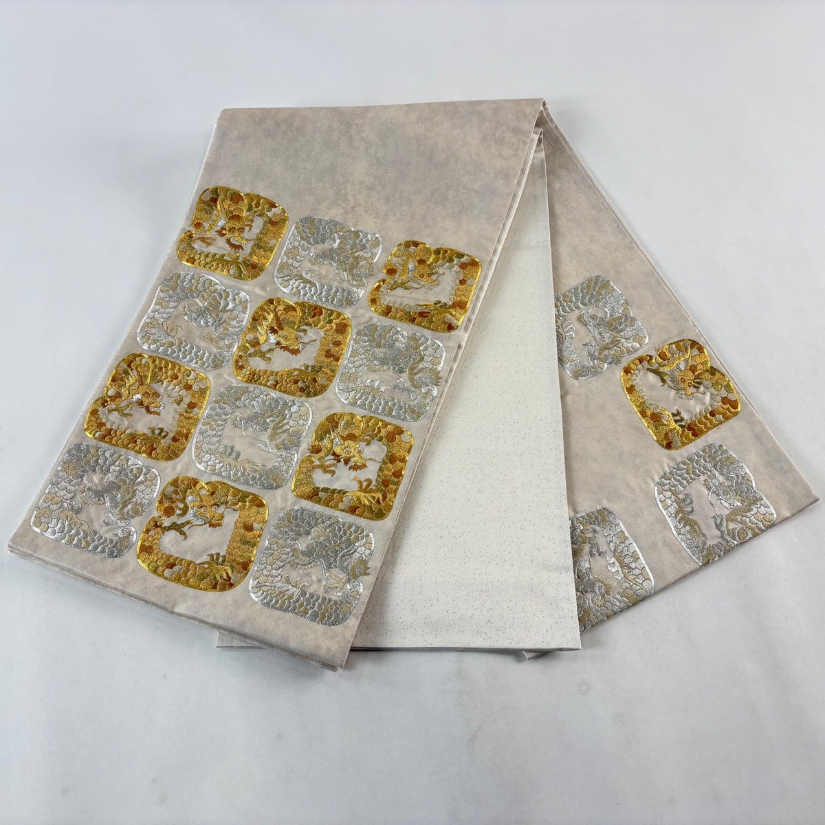 袋帯とは女性用の主にフォーマル用の帯で第一礼装として着用されることが多く、形状は表地にのみ柄があり裏地は無地になるように袋状に織って作成されたため袋帯という名が付きました。 帯を締める際にはおめでたいことが重なりますようにという願いが込められている二重太鼓や成人式の際に振袖に見かけるふくら雀や文庫結びなどの変わり結びを用いて着用します。