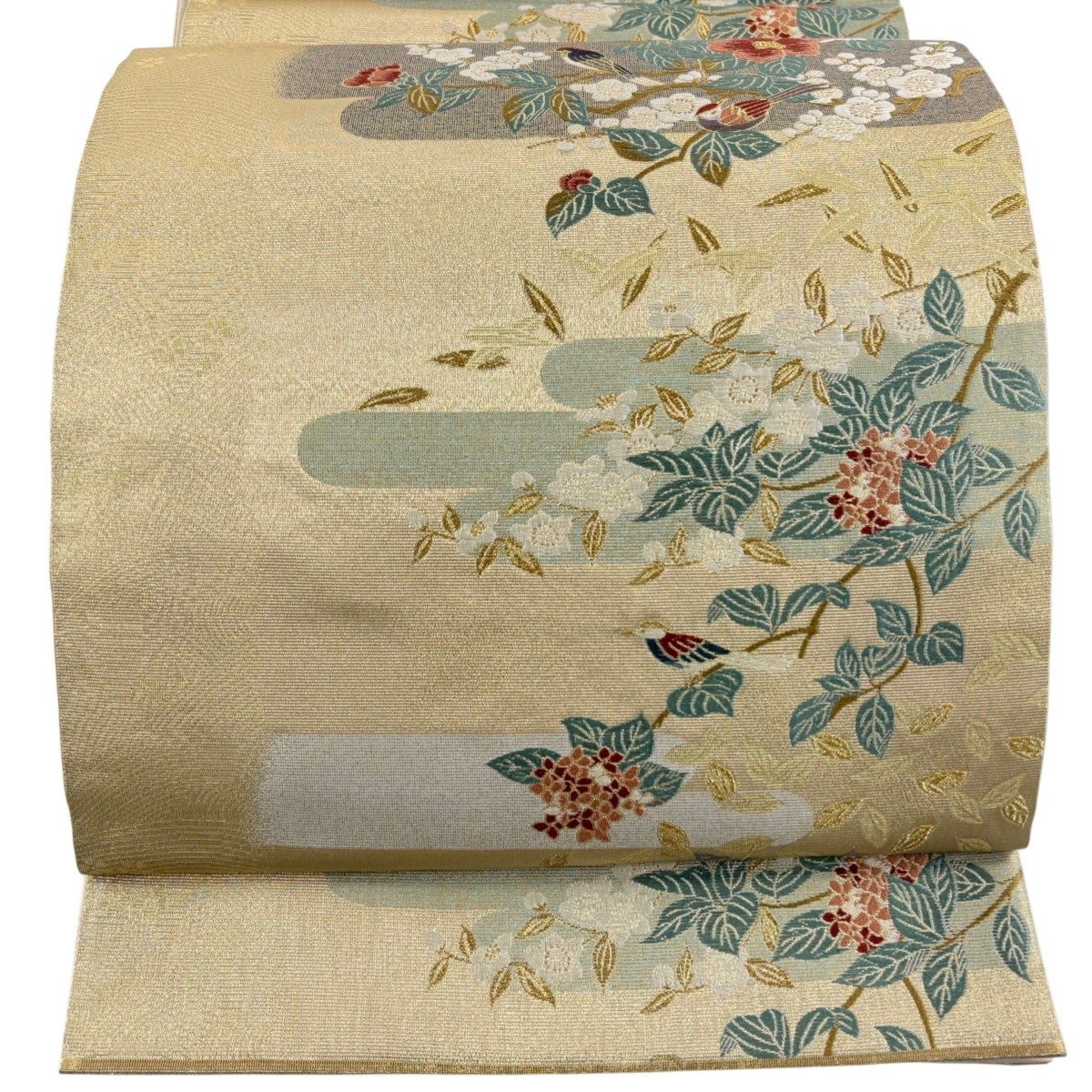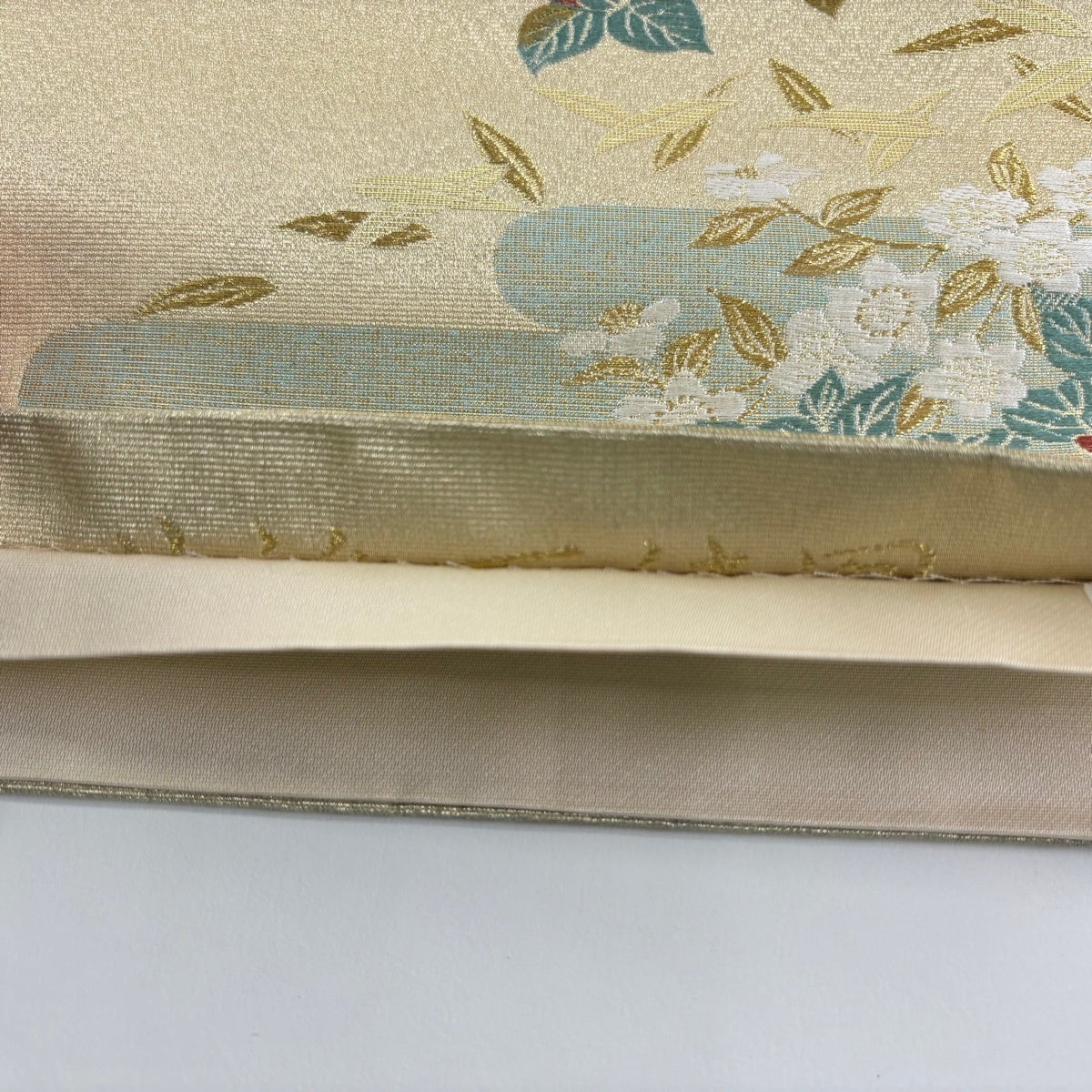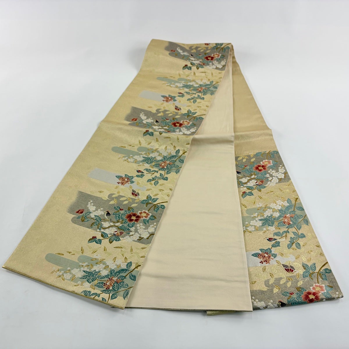 袋帯とは女性用の主にフォーマル用の帯で第一礼装として着用されることが多く、形状は表地にのみ柄があり裏地は無地になるように袋状に織って作成されたため袋帯という名が付きました。 帯を締める際にはおめでたいことが重なりますようにという願いが込められている二重太鼓や成人式の際に振袖に見かけるふくら雀や文庫結びなどの変わり結びを用いて着用します。