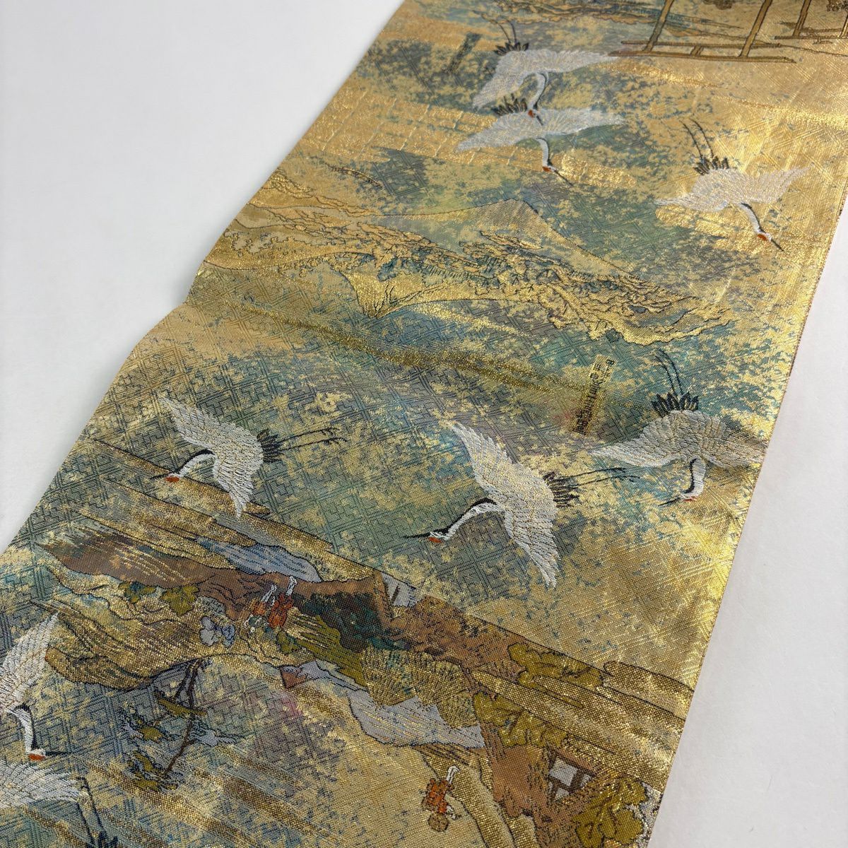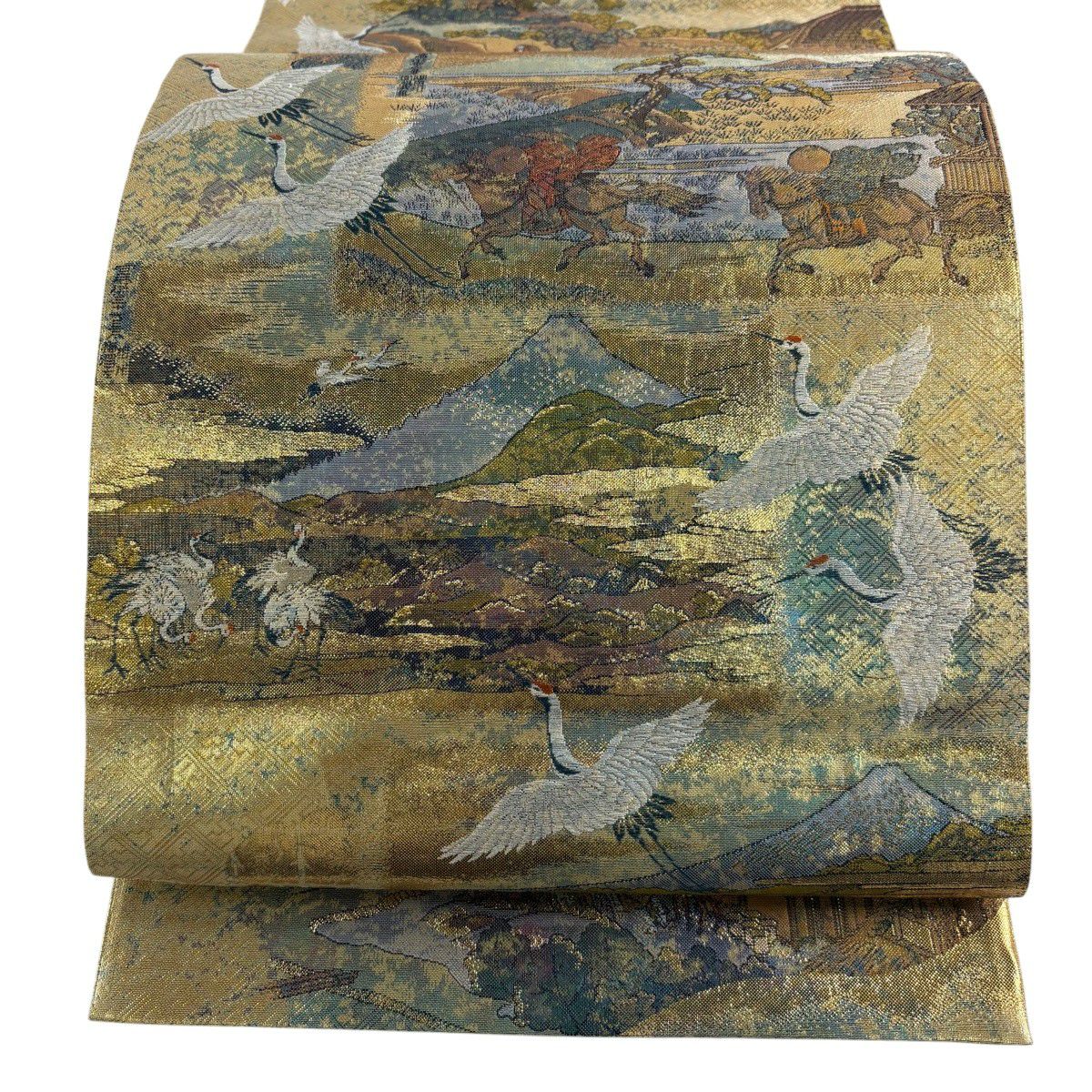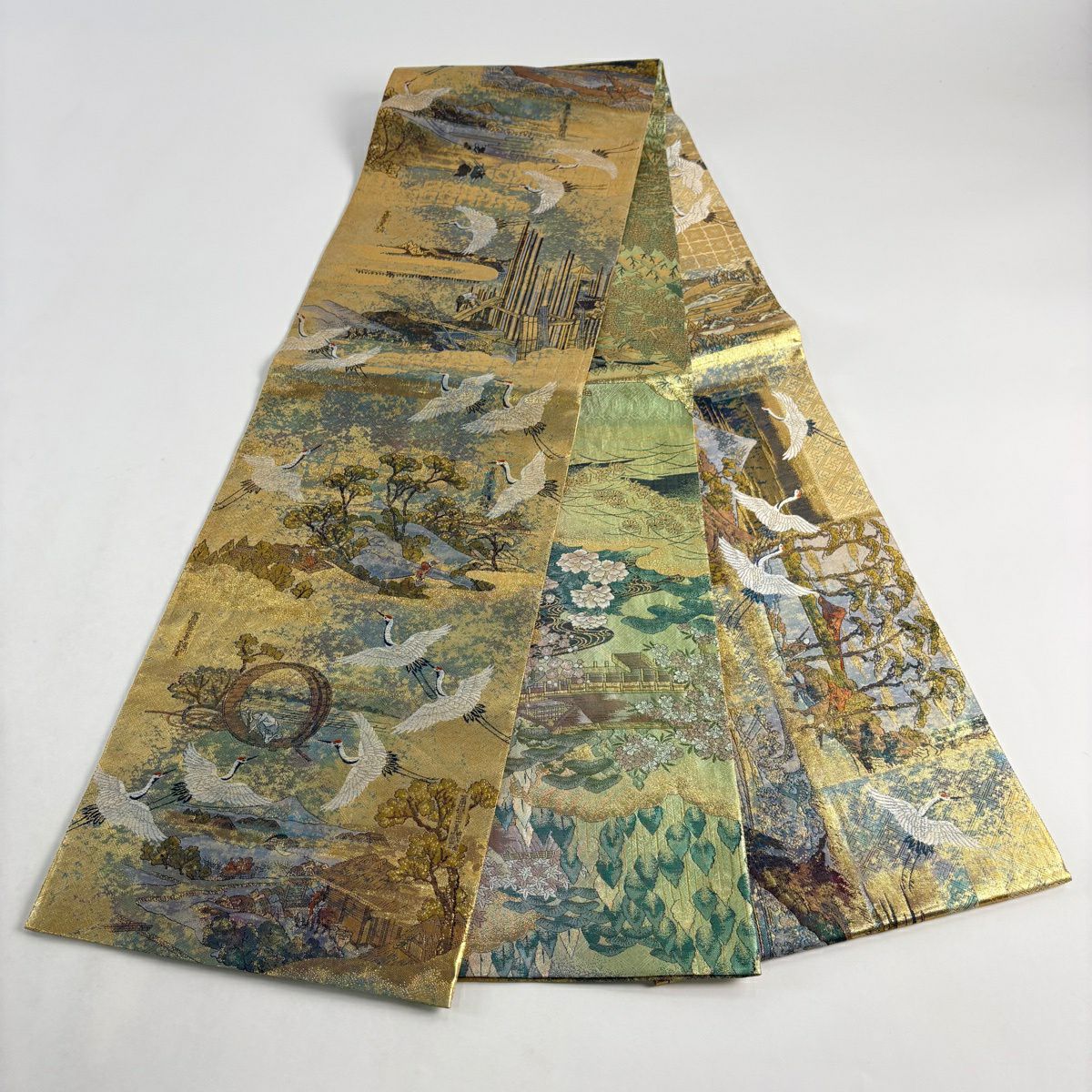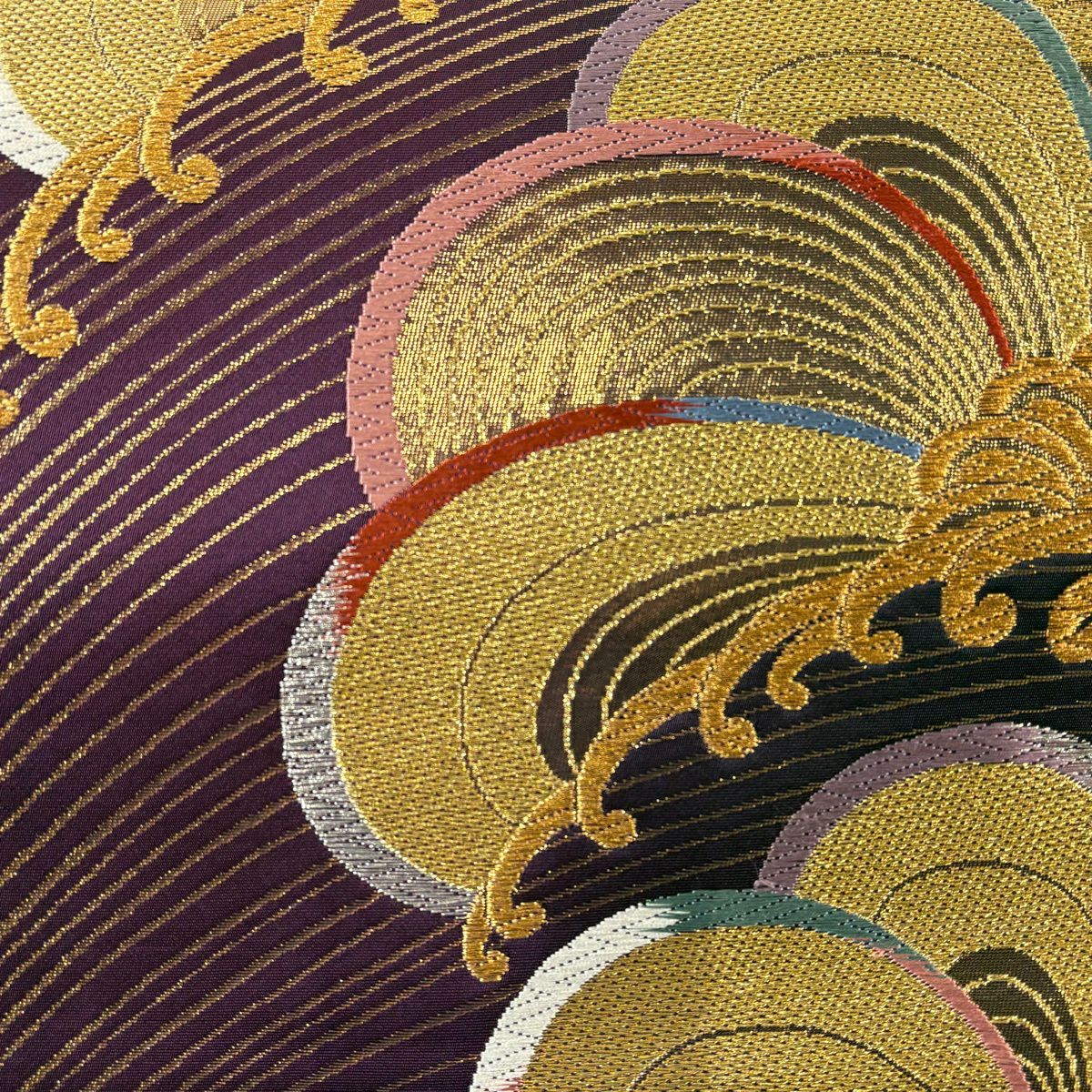 袋帯とは女性用の主にフォーマル用の帯で第一礼装として着用されることが多く、形状は表地にのみ柄があり裏地は無地になるように袋状に織って作成されたため袋帯という名が付きました。 帯を締める際にはおめでたいことが重なりますようにという願いが込められている二重太鼓や成人式の際に振袖に見かけるふくら雀や文庫結びなどの変わり結びを用いて着用します。
