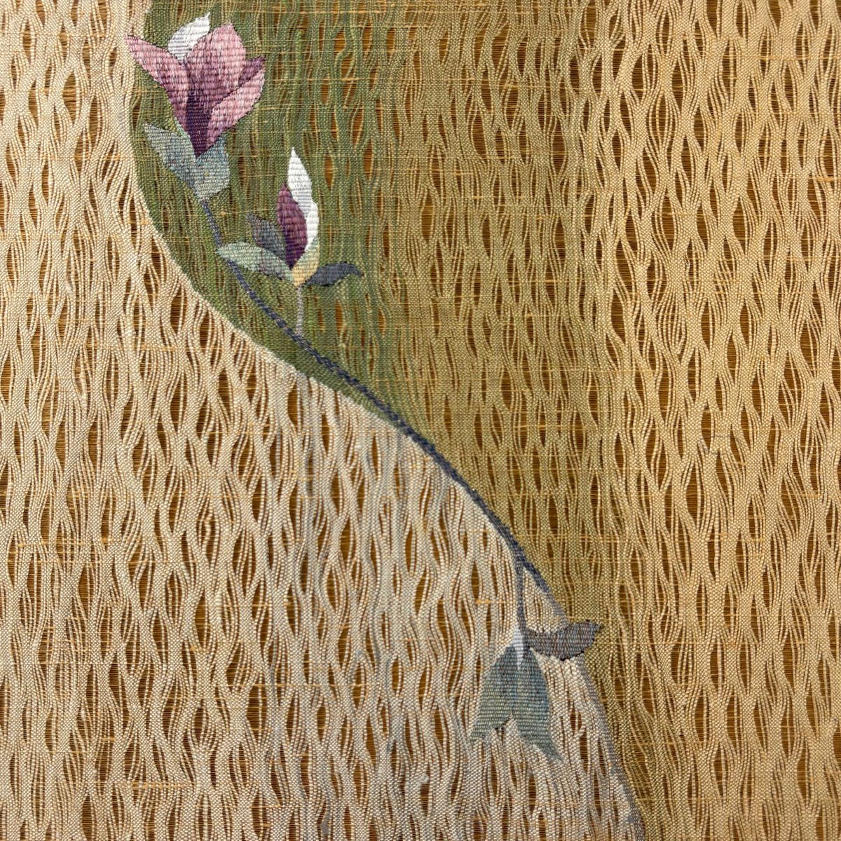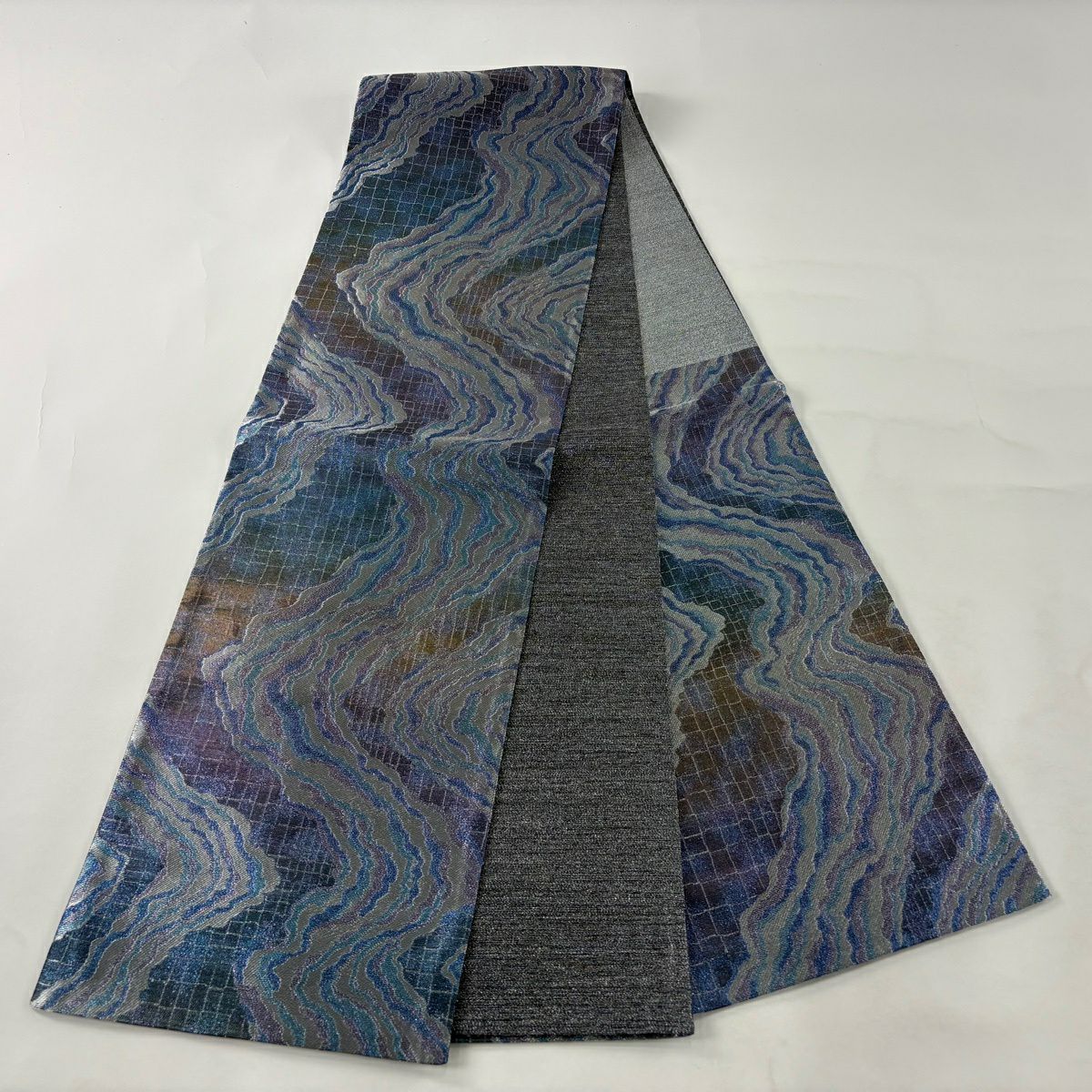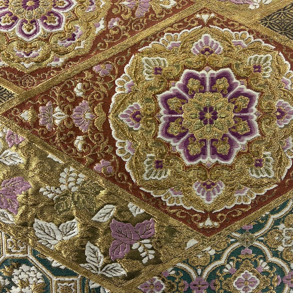 袋帯とは女性用の主にフォーマル用の帯で第一礼装として着用されることが多く、形状は表地にのみ柄があり裏地は無地になるように袋状に織って作成されたため袋帯という名が付きました。 帯を締める際にはおめでたいことが重なりますようにという願いが込められている二重太鼓や成人式の際に振袖に見かけるふくら雀や文庫結びなどの変わり結びを用いて着用します。