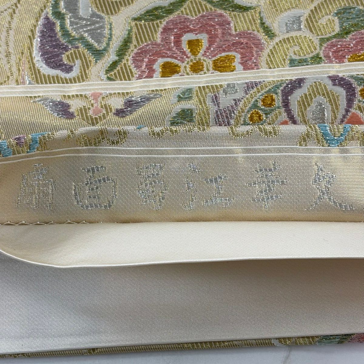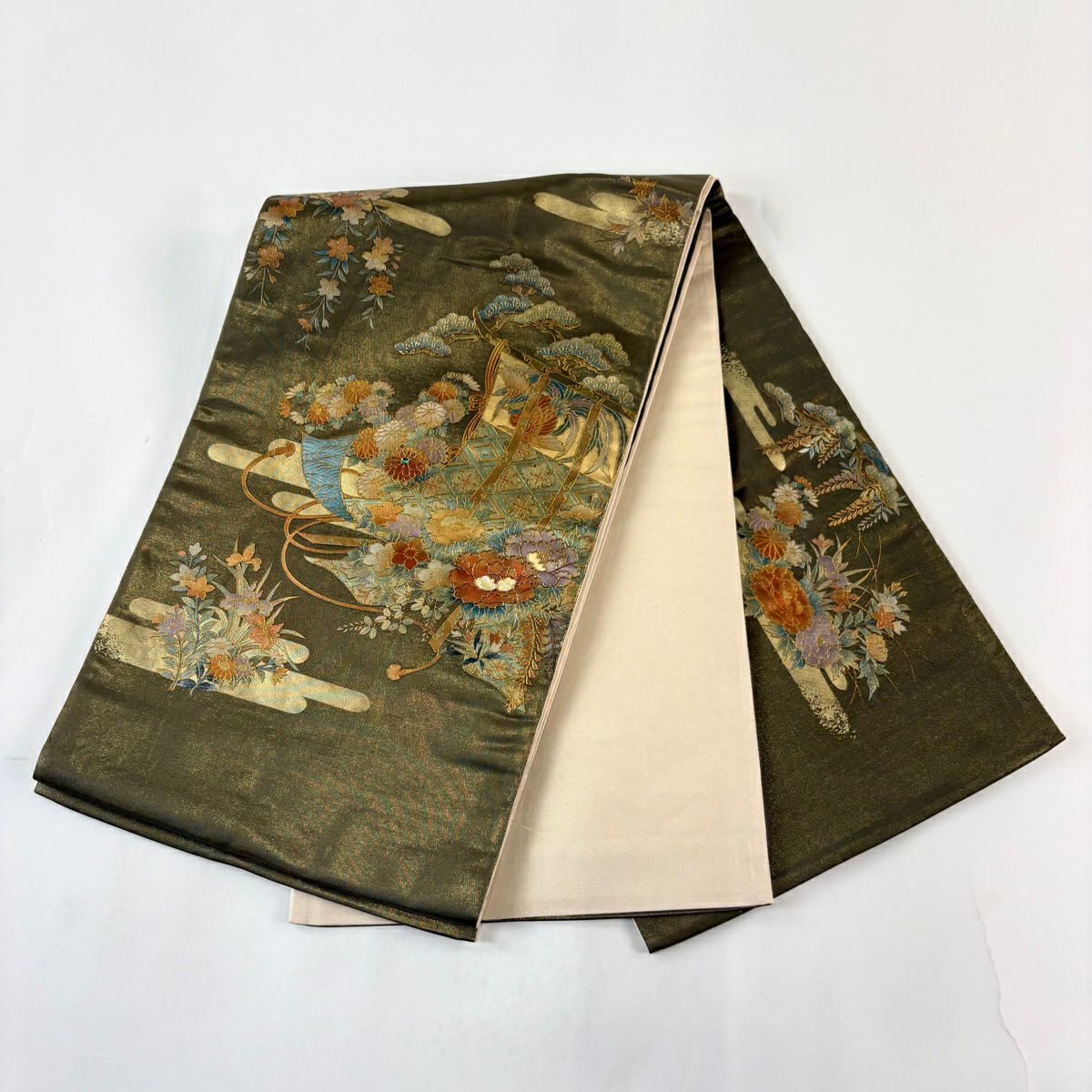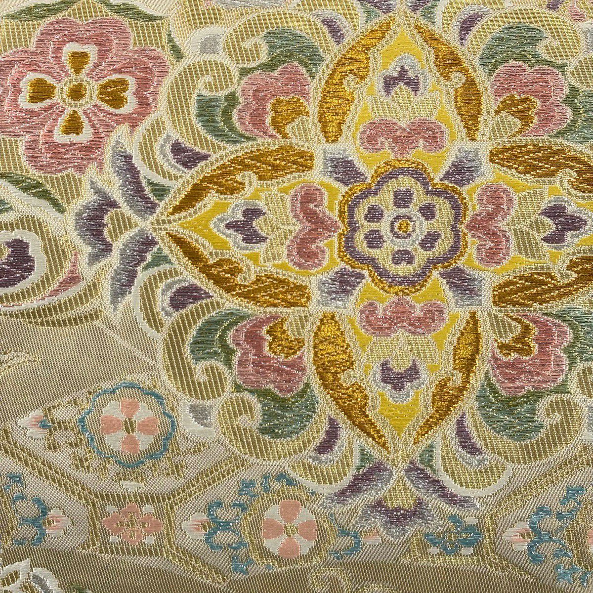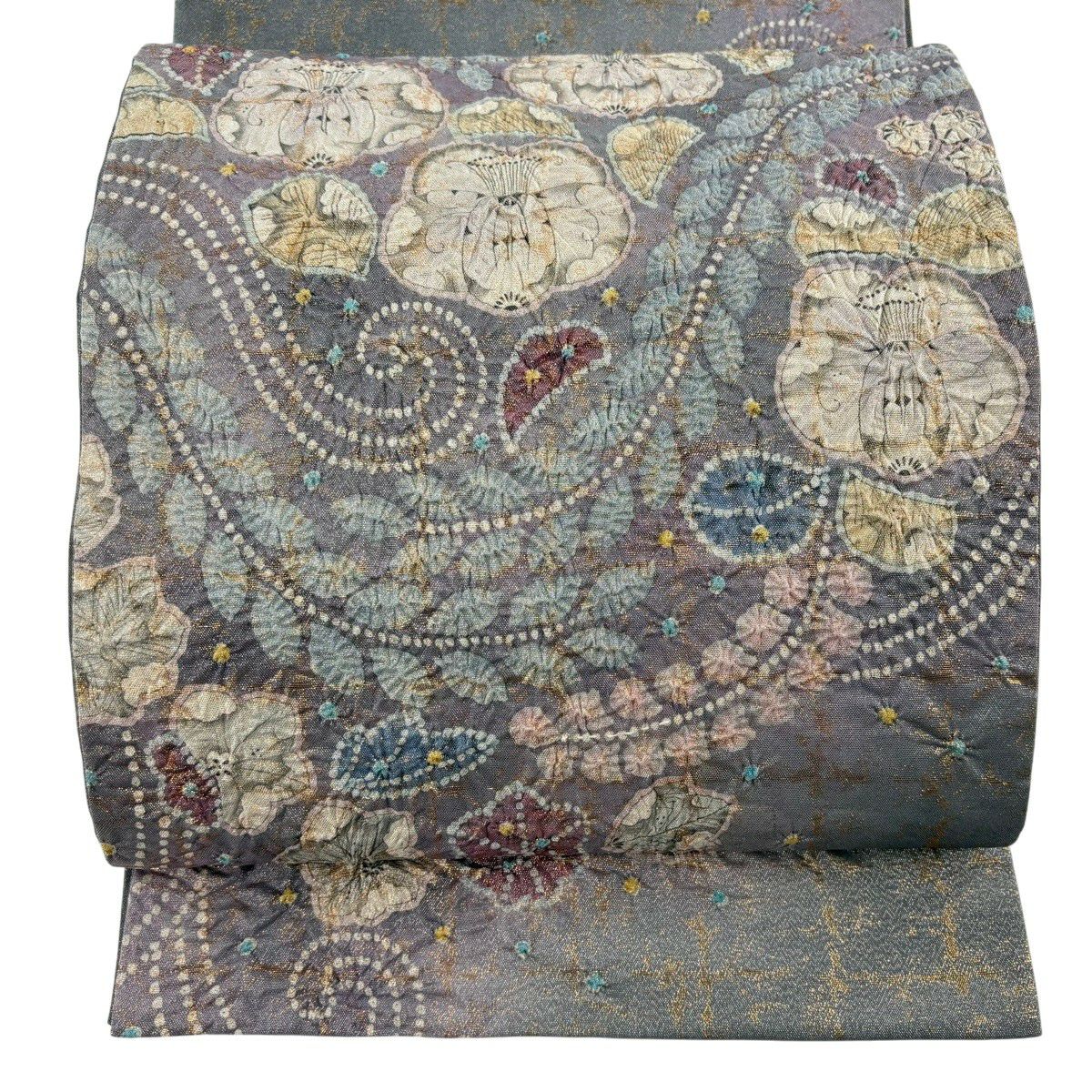 袋帯とは女性用の主にフォーマル用の帯で第一礼装として着用されることが多く、形状は表地にのみ柄があり裏地は無地になるように袋状に織って作成されたため袋帯という名が付きました。 帯を締める際にはおめでたいことが重なりますようにという願いが込められている二重太鼓や成人式の際に振袖に見かけるふくら雀や文庫結びなどの変わり結びを用いて着用します。