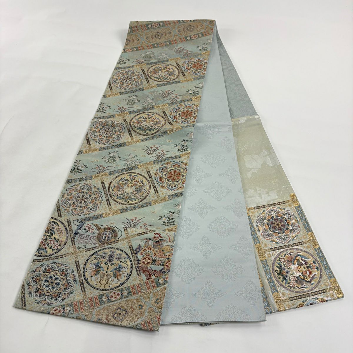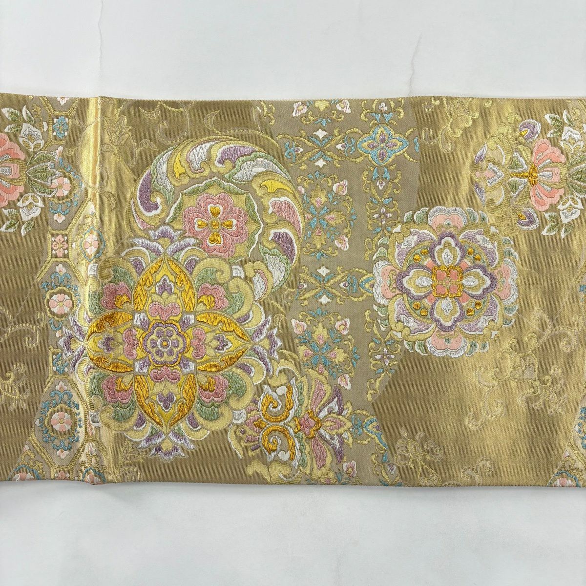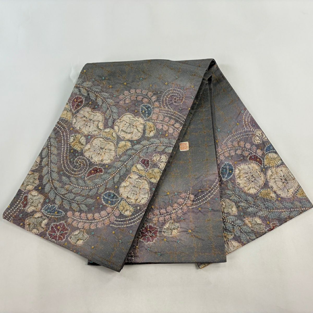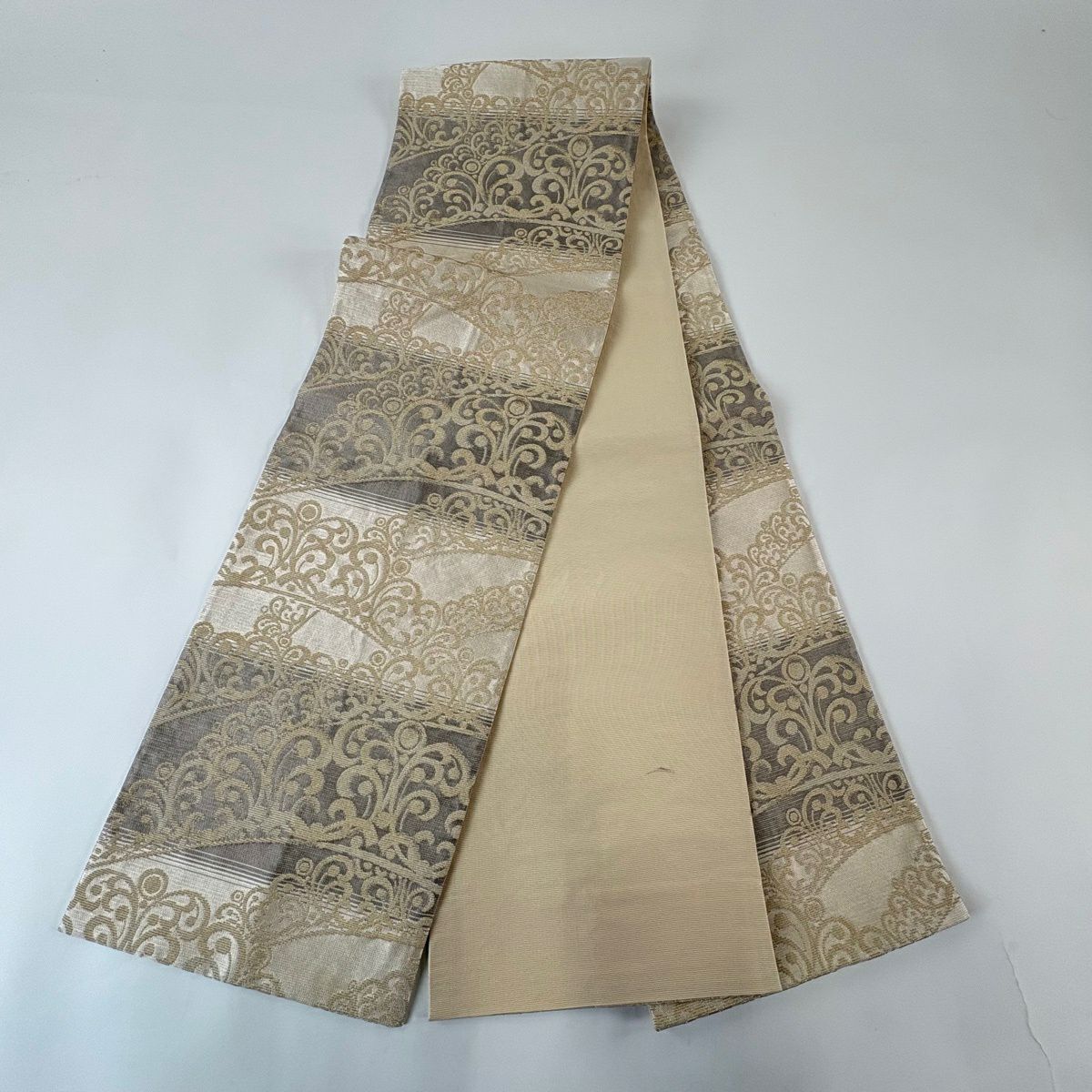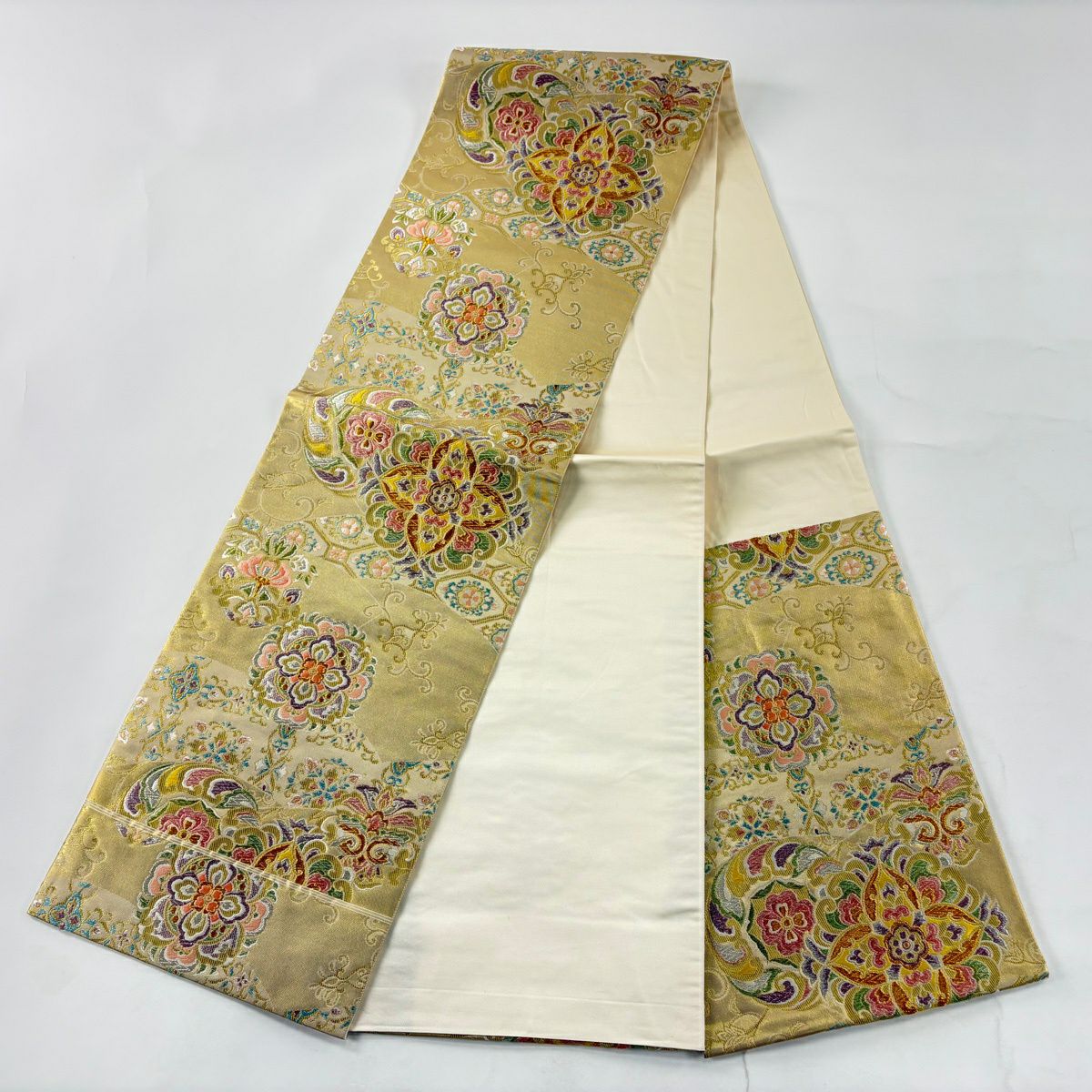 袋帯とは女性用の主にフォーマル用の帯で第一礼装として着用されることが多く、形状は表地にのみ柄があり裏地は無地になるように袋状に織って作成されたため袋帯という名が付きました。 帯を締める際にはおめでたいことが重なりますようにという願いが込められている二重太鼓や成人式の際に振袖に見かけるふくら雀や文庫結びなどの変わり結びを用いて着用します。