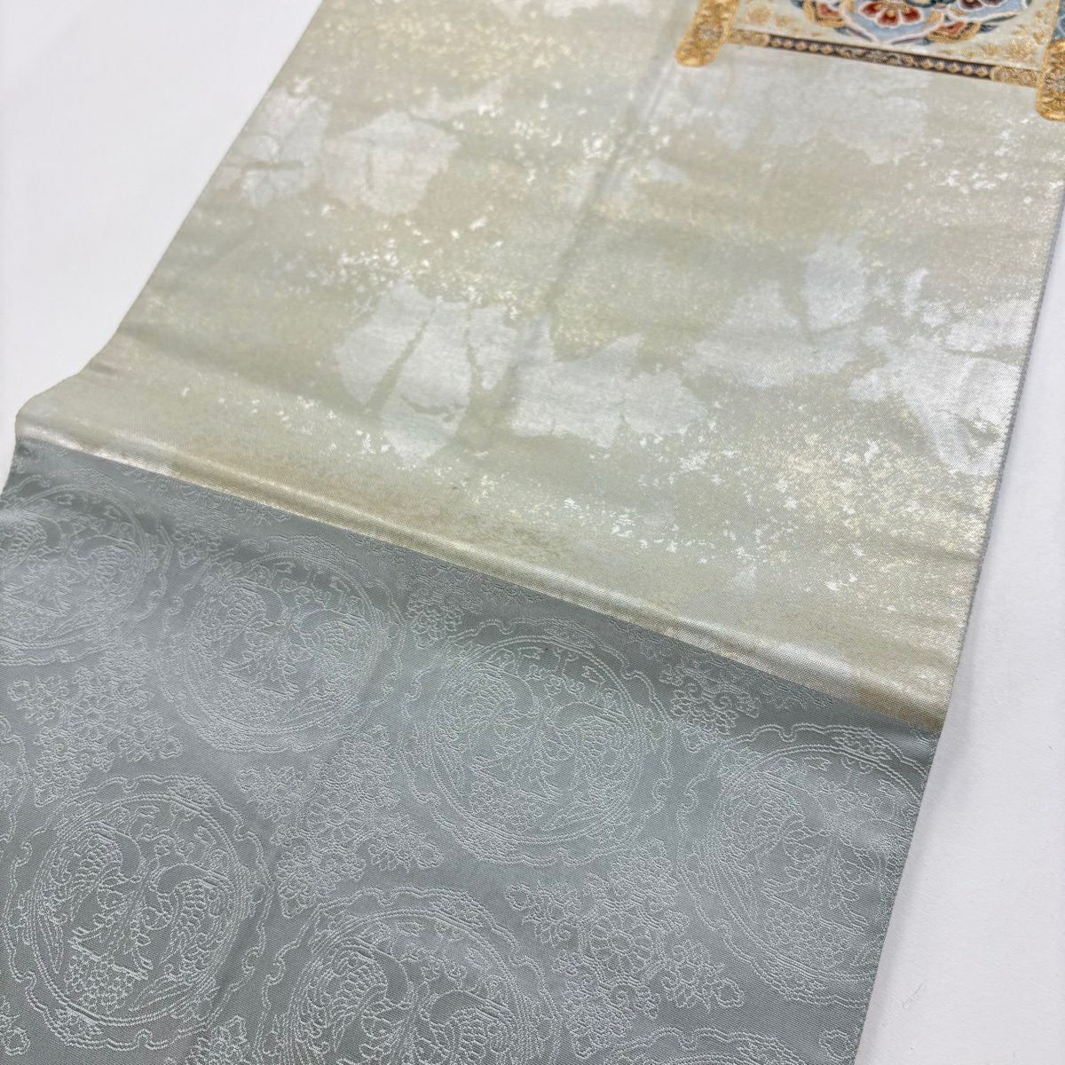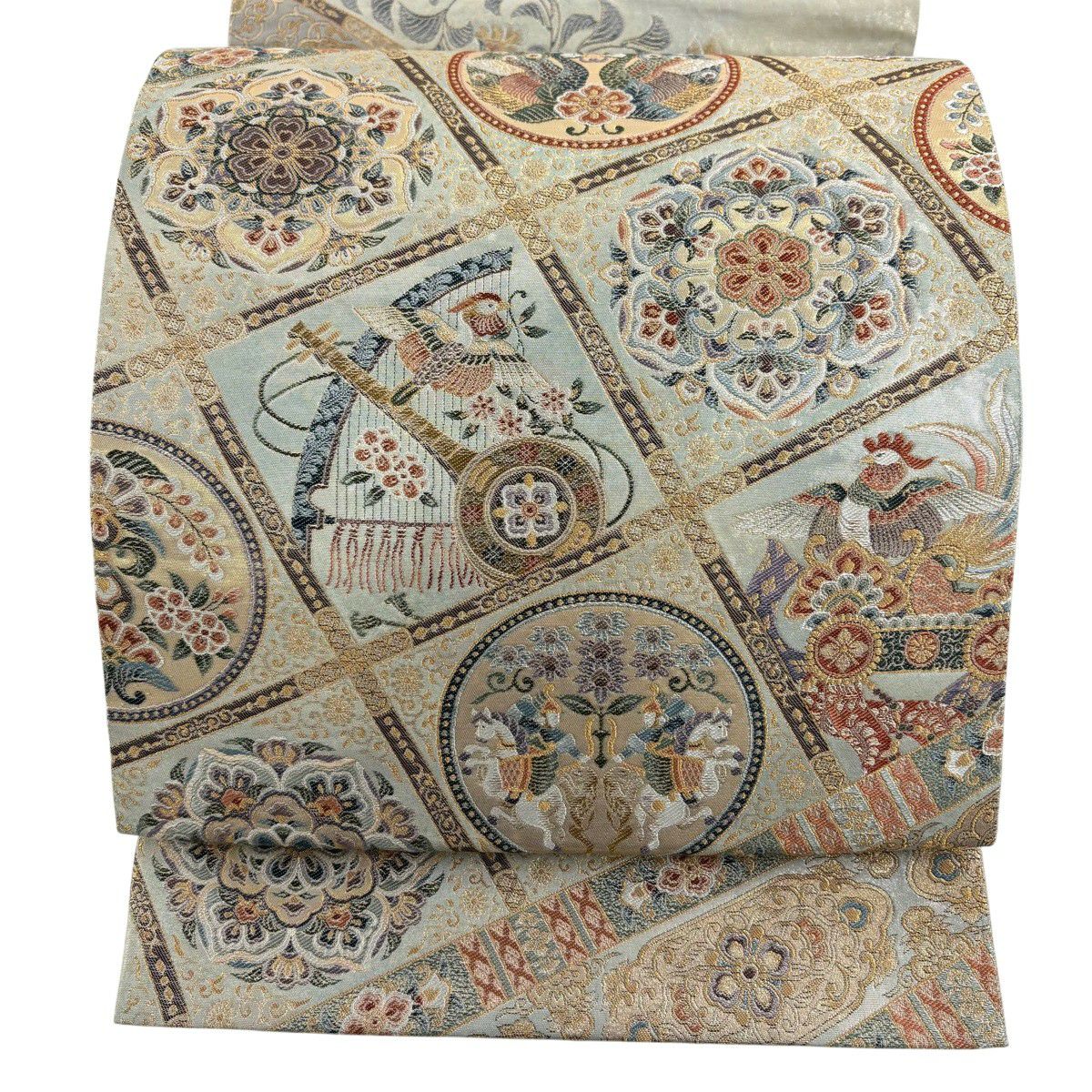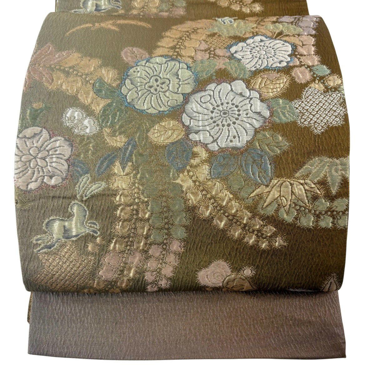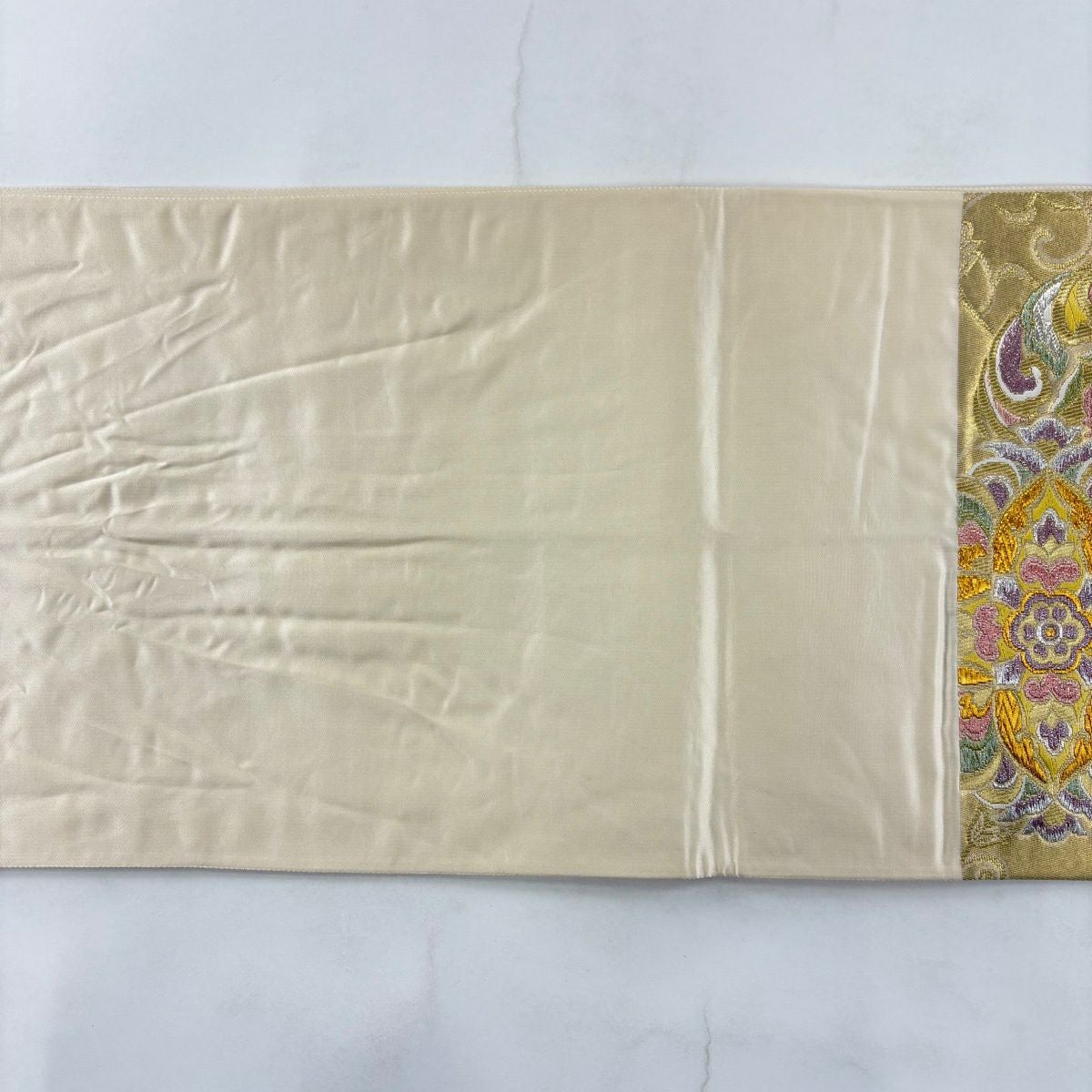 袋帯とは女性用の主にフォーマル用の帯で第一礼装として着用されることが多く、形状は表地にのみ柄があり裏地は無地になるように袋状に織って作成されたため袋帯という名が付きました。 帯を締める際にはおめでたいことが重なりますようにという願いが込められている二重太鼓や成人式の際に振袖に見かけるふくら雀や文庫結びなどの変わり結びを用いて着用します。