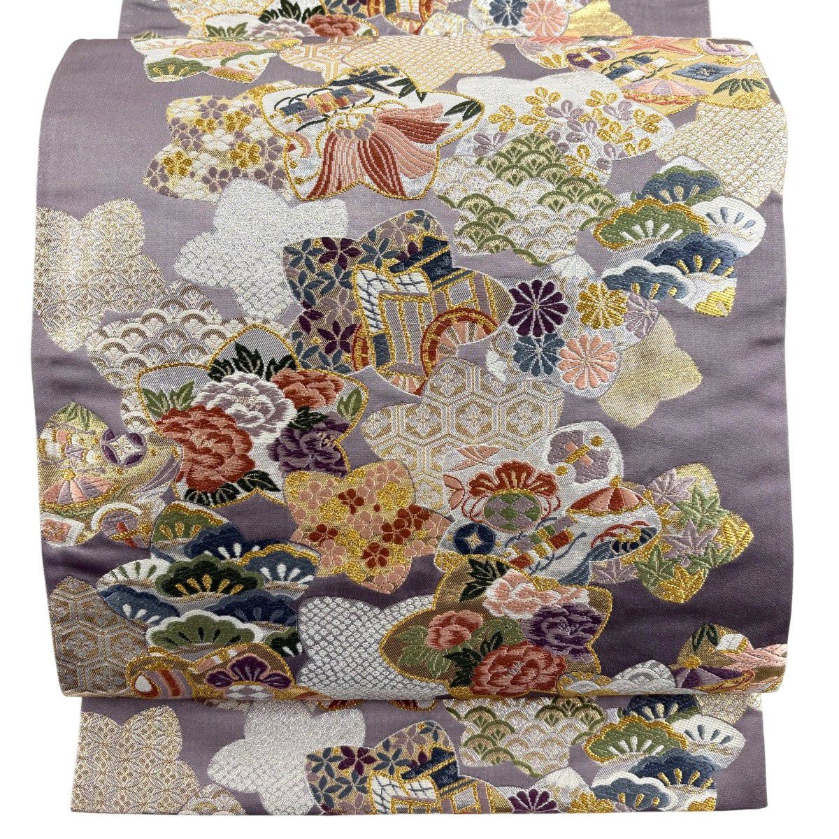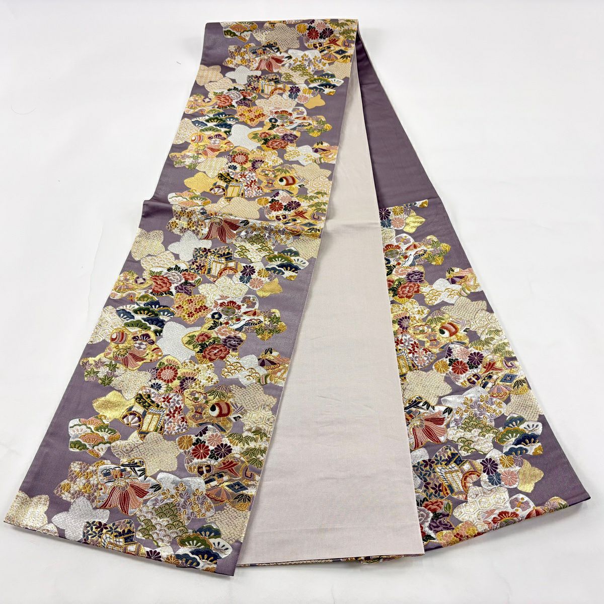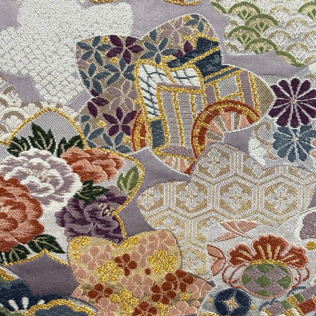 袋帯とは女性用の主にフォーマル用の帯で第一礼装として着用されることが多く、形状は表地にのみ柄があり裏地は無地になるように袋状に織って作成されたため袋帯という名が付きました。 帯を締める際にはおめでたいことが重なりますようにという願いが込められている二重太鼓や成人式の際に振袖に見かけるふくら雀や文庫結びなどの変わり結びを用いて着用します。