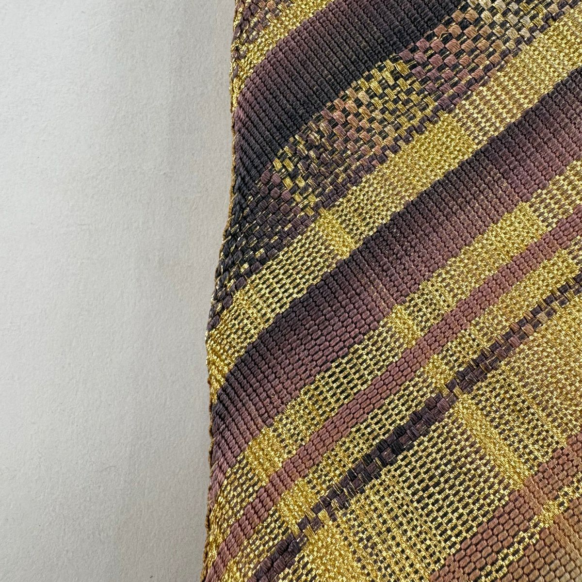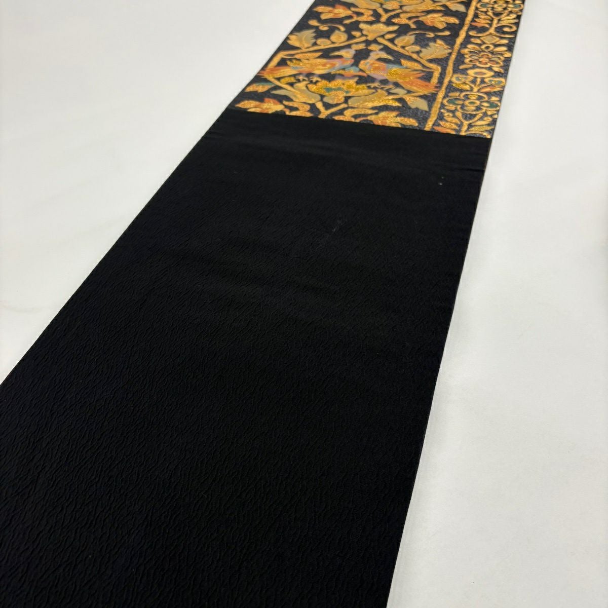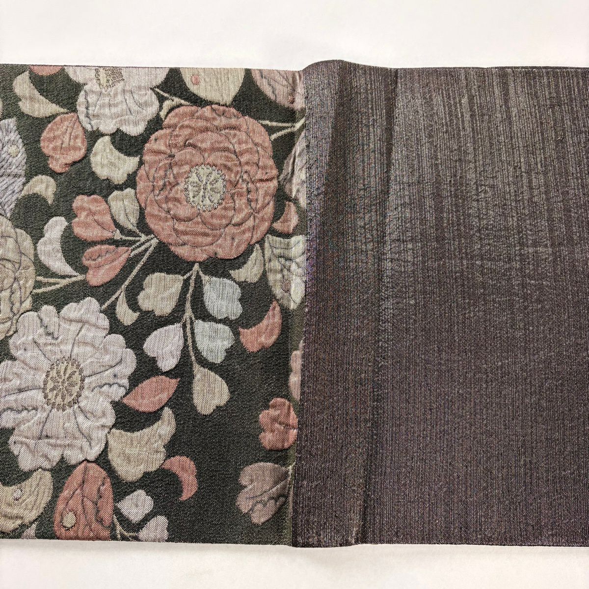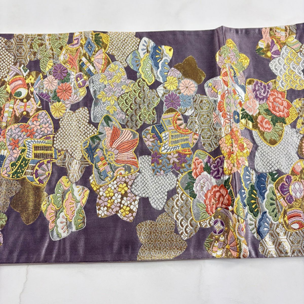袋帯とは女性用の主にフォーマル用の帯で第一礼装として着用されることが多く、形状は表地にのみ柄があり裏地は無地になるように袋状に織って作成されたため袋帯という名が付きました。 帯を締める際にはおめでたいことが重なりますようにという願いが込められている二重太鼓や成人式の際に振袖に見かけるふくら雀や文庫結びなどの変わり結びを用いて着用します。