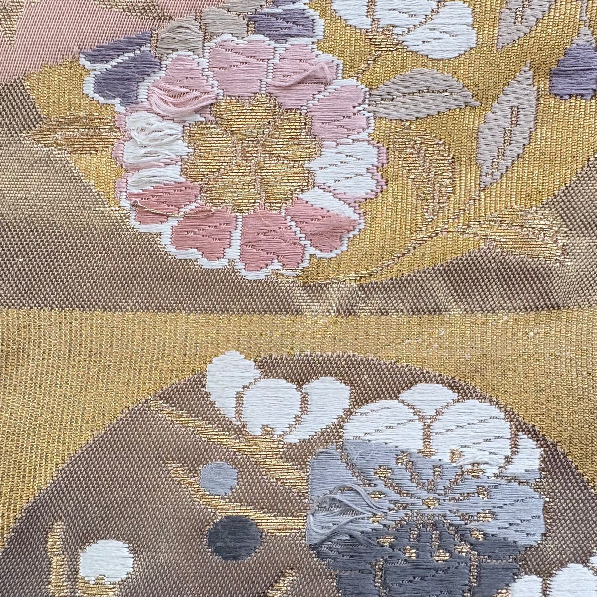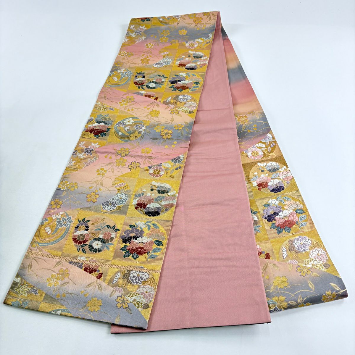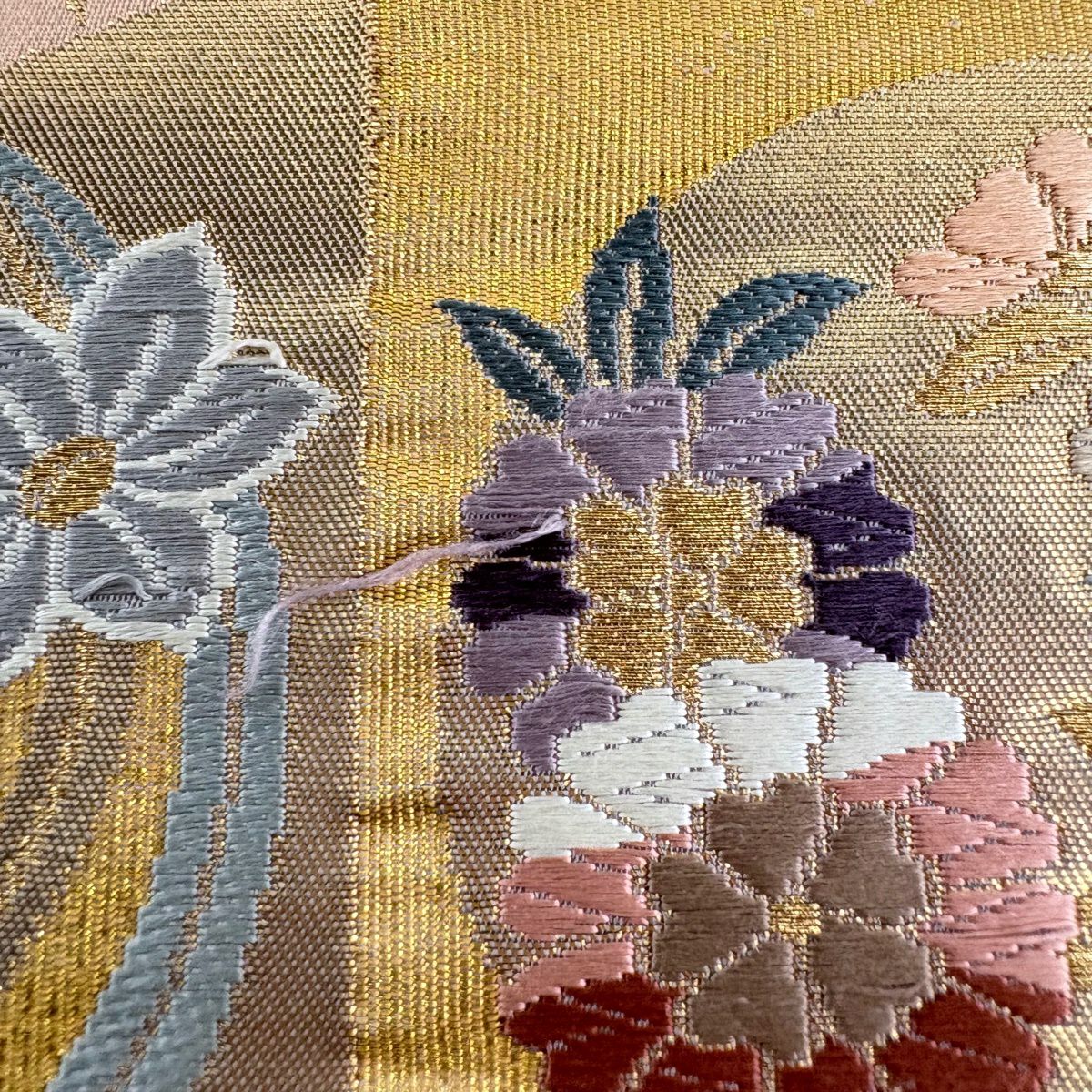 袋帯とは女性用の主にフォーマル用の帯で第一礼装として着用されることが多く、形状は表地にのみ柄があり裏地は無地になるように袋状に織って作成されたため袋帯という名が付きました。 帯を締める際にはおめでたいことが重なりますようにという願いが込められている二重太鼓や成人式の際に振袖に見かけるふくら雀や文庫結びなどの変わり結びを用いて着用します。