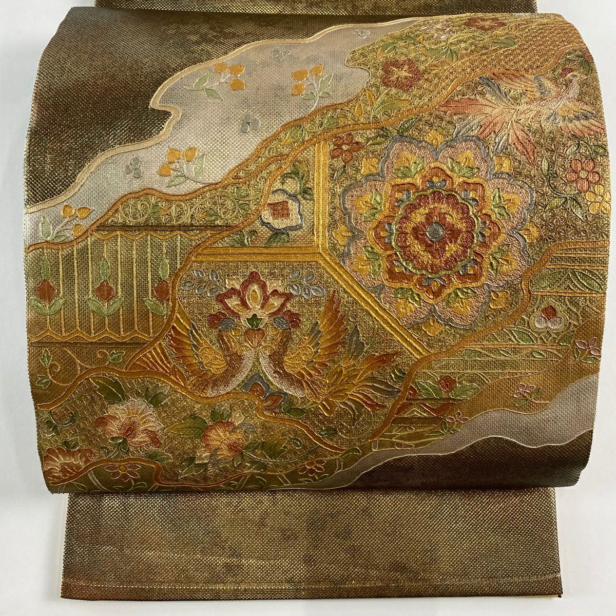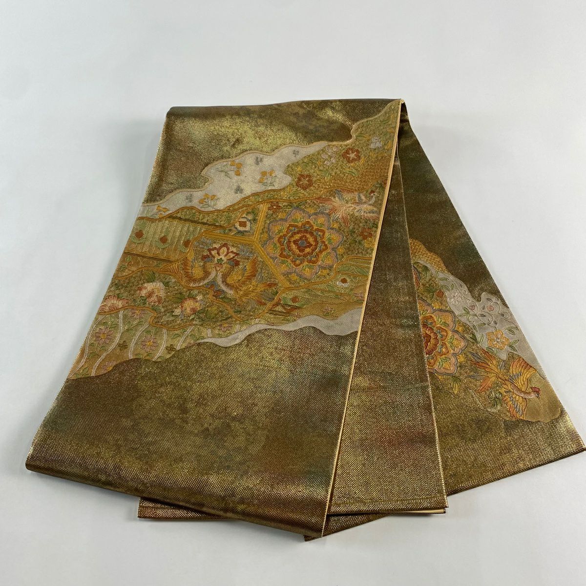 袋帯とは女性用の主にフォーマル用の帯で第一礼装として着用されることが多く、形状は表地にのみ柄があり裏地は無地になるように袋状に織って作成されたため袋帯という名が付きました。 帯を締める際にはおめでたいことが重なりますようにという願いが込められている二重太鼓や成人式の際に振袖に見かけるふくら雀や文庫結びなどの変わり結びを用いて着用します。