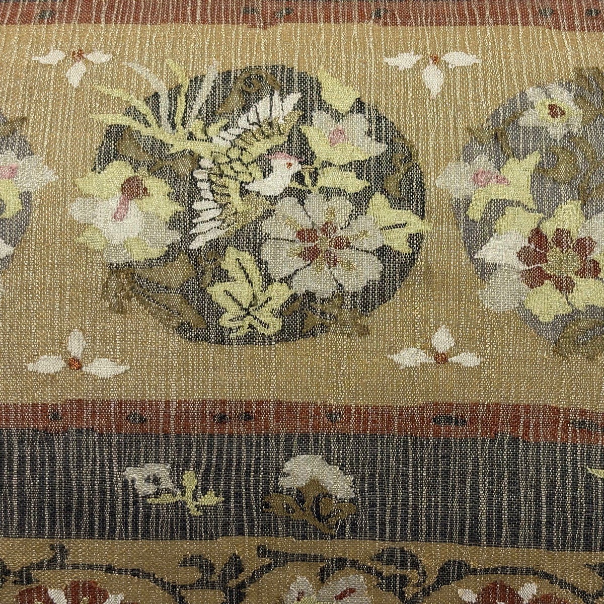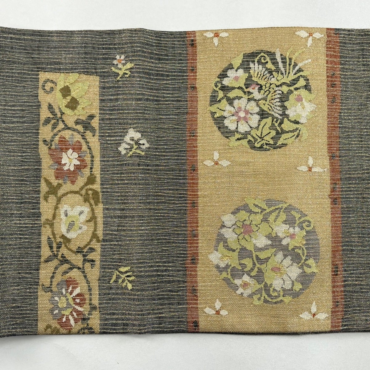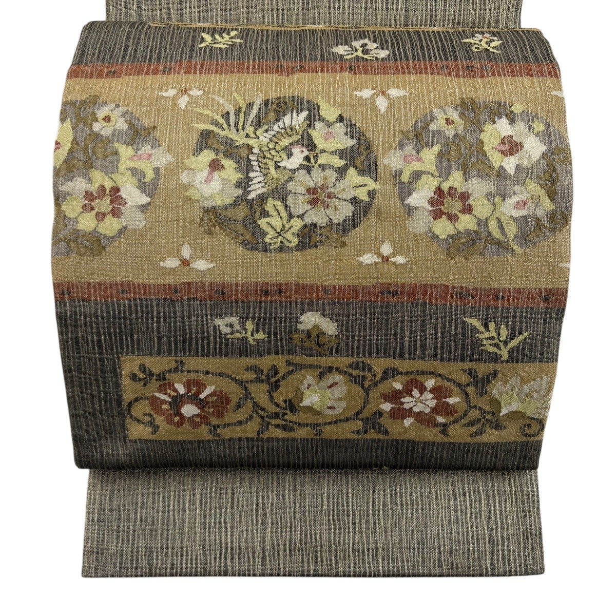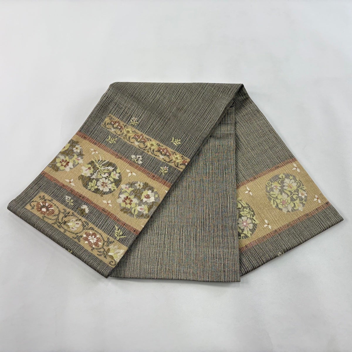 袋帯とは女性用の主にフォーマル用の帯で第一礼装として着用されることが多く、形状は表地にのみ柄があり裏地は無地になるように袋状に織って作成されたため袋帯という名が付きました。 帯を締める際にはおめでたいことが重なりますようにという願いが込められている二重太鼓や成人式の際に振袖に見かけるふくら雀や文庫結びなどの変わり結びを用いて着用します。