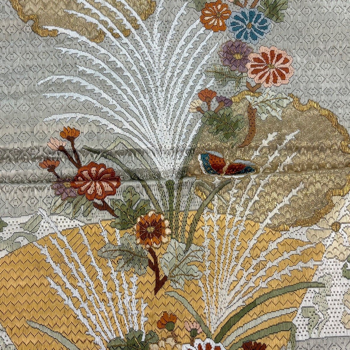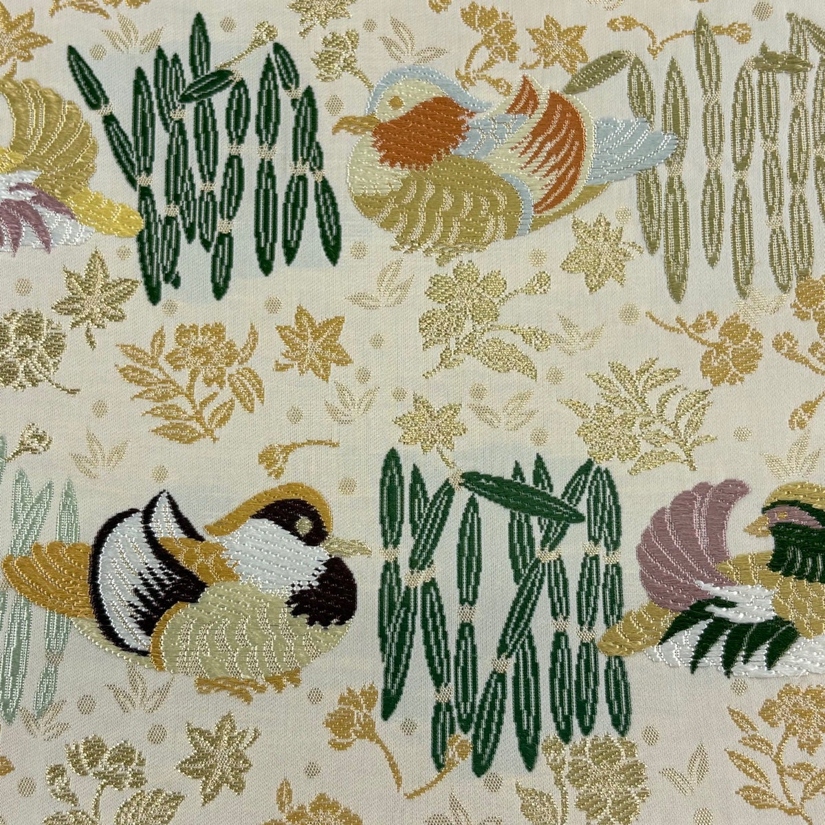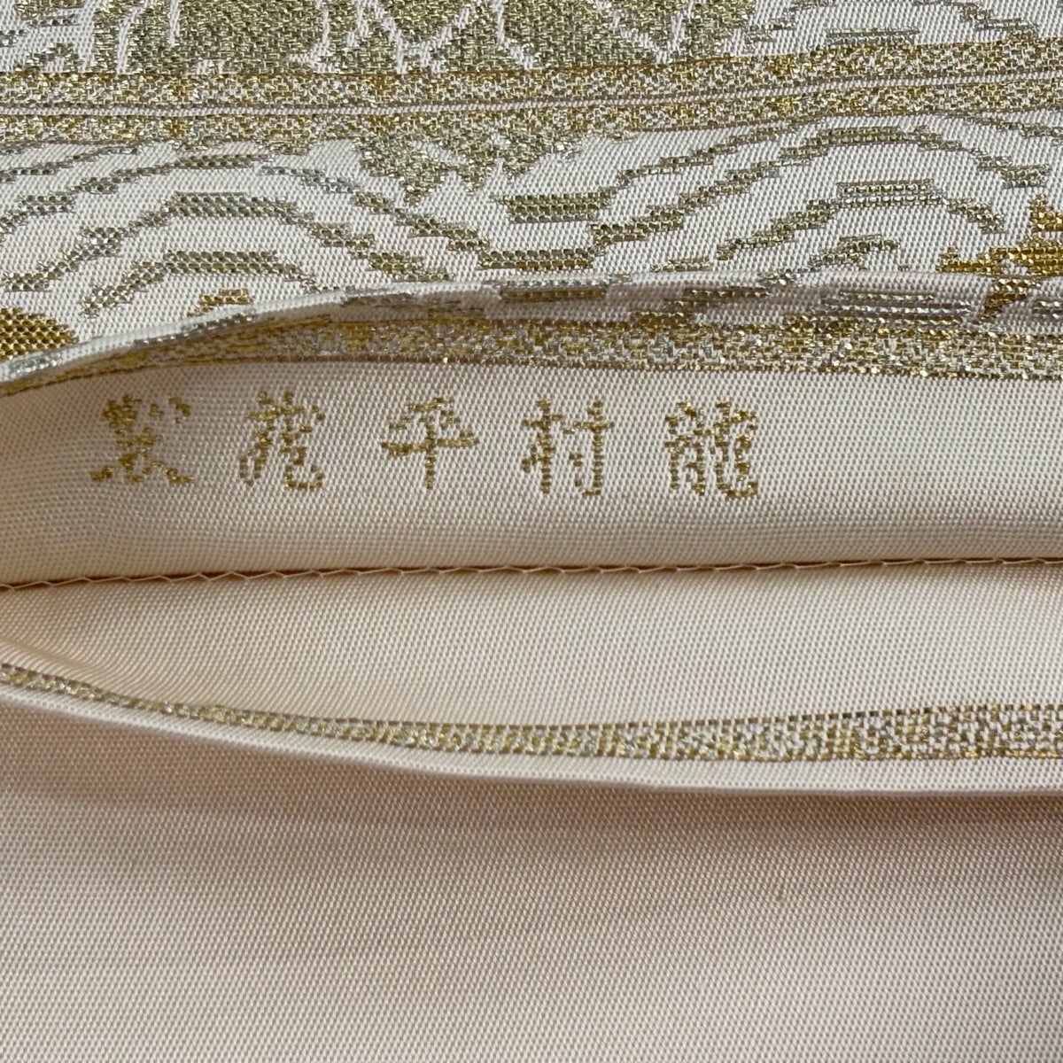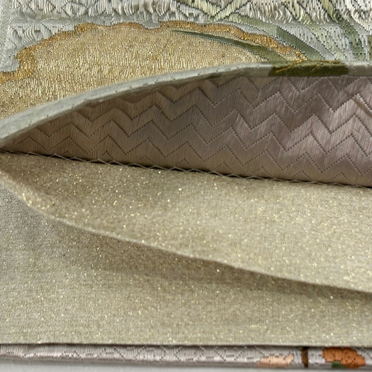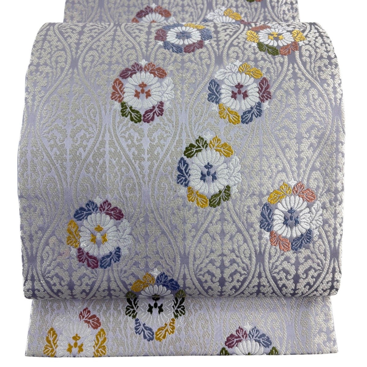 袋帯とは女性用の主にフォーマル用の帯で第一礼装として着用されることが多く、形状は表地にのみ柄があり裏地は無地になるように袋状に織って作成されたため袋帯という名が付きました。 帯を締める際にはおめでたいことが重なりますようにという願いが込められている二重太鼓や成人式の際に振袖に見かけるふくら雀や文庫結びなどの変わり結びを用いて着用します。