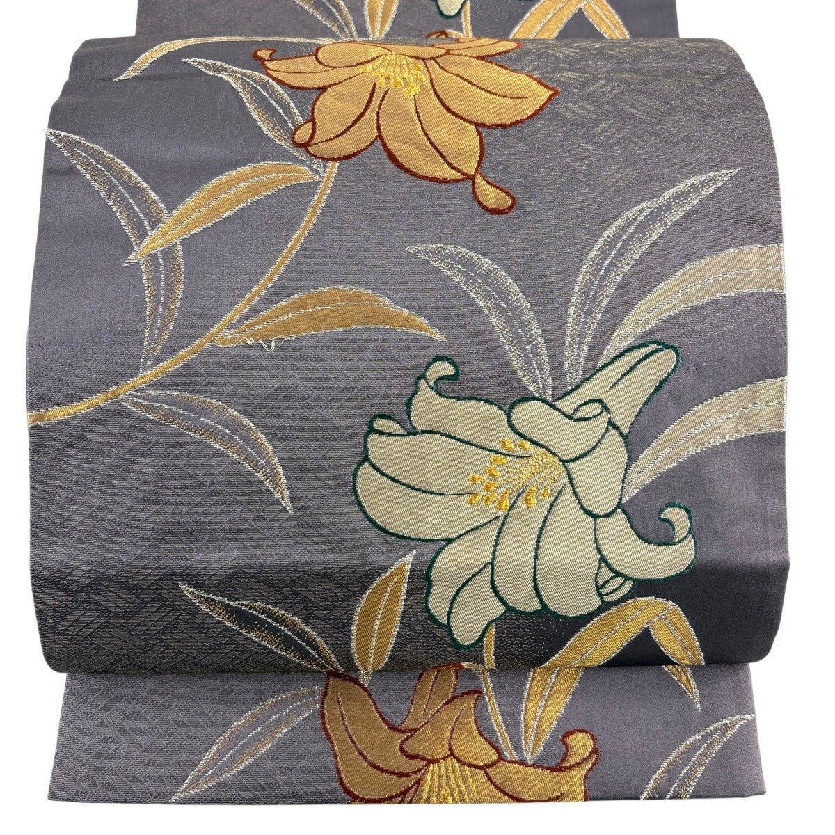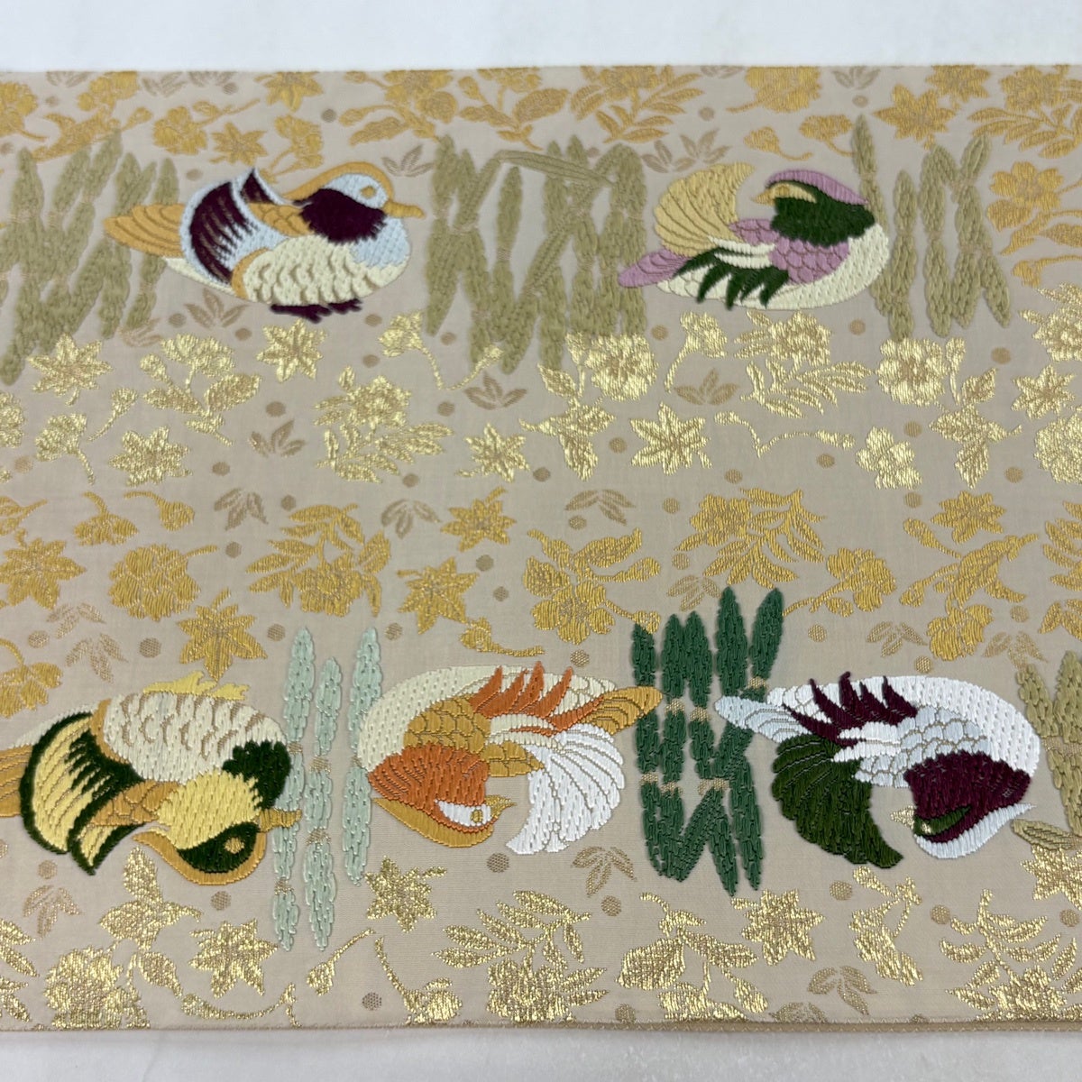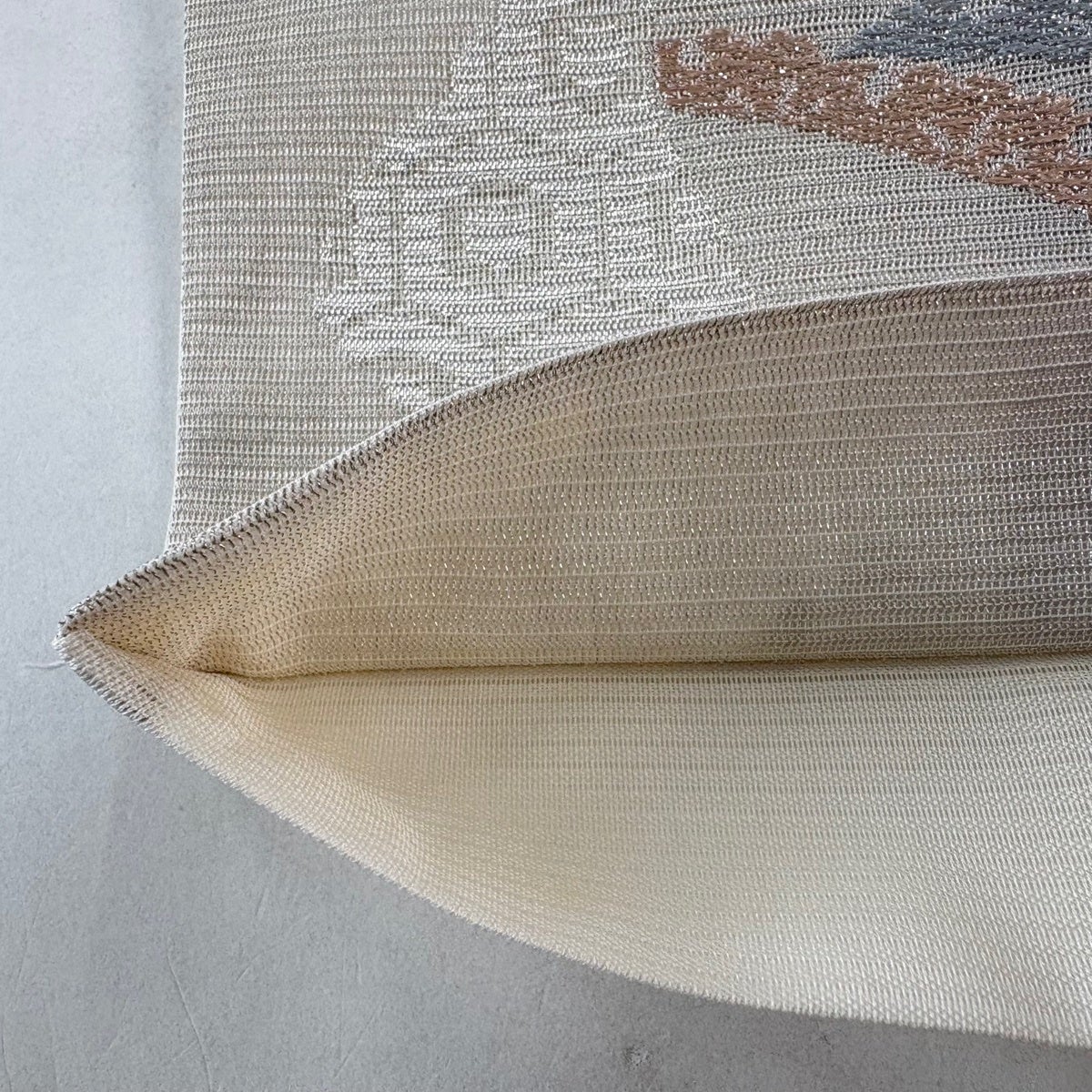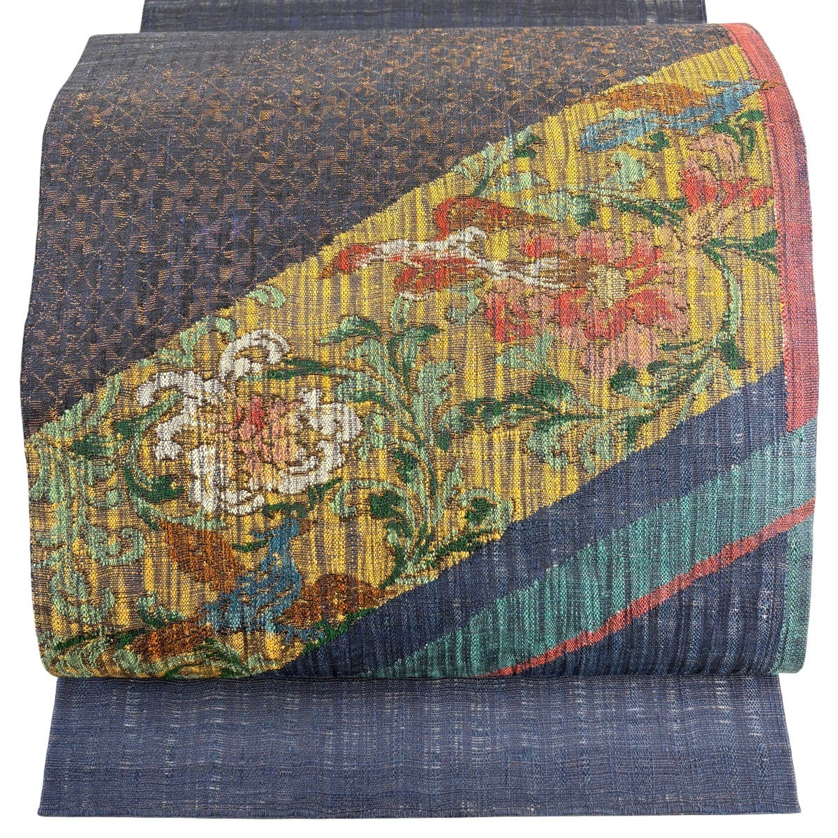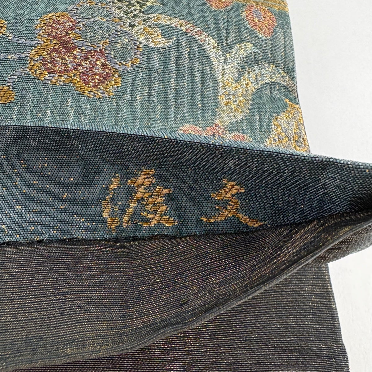 袋帯とは女性用の主にフォーマル用の帯で第一礼装として着用されることが多く、形状は表地にのみ柄があり裏地は無地になるように袋状に織って作成されたため袋帯という名が付きました。 帯を締める際にはおめでたいことが重なりますようにという願いが込められている二重太鼓や成人式の際に振袖に見かけるふくら雀や文庫結びなどの変わり結びを用いて着用します。