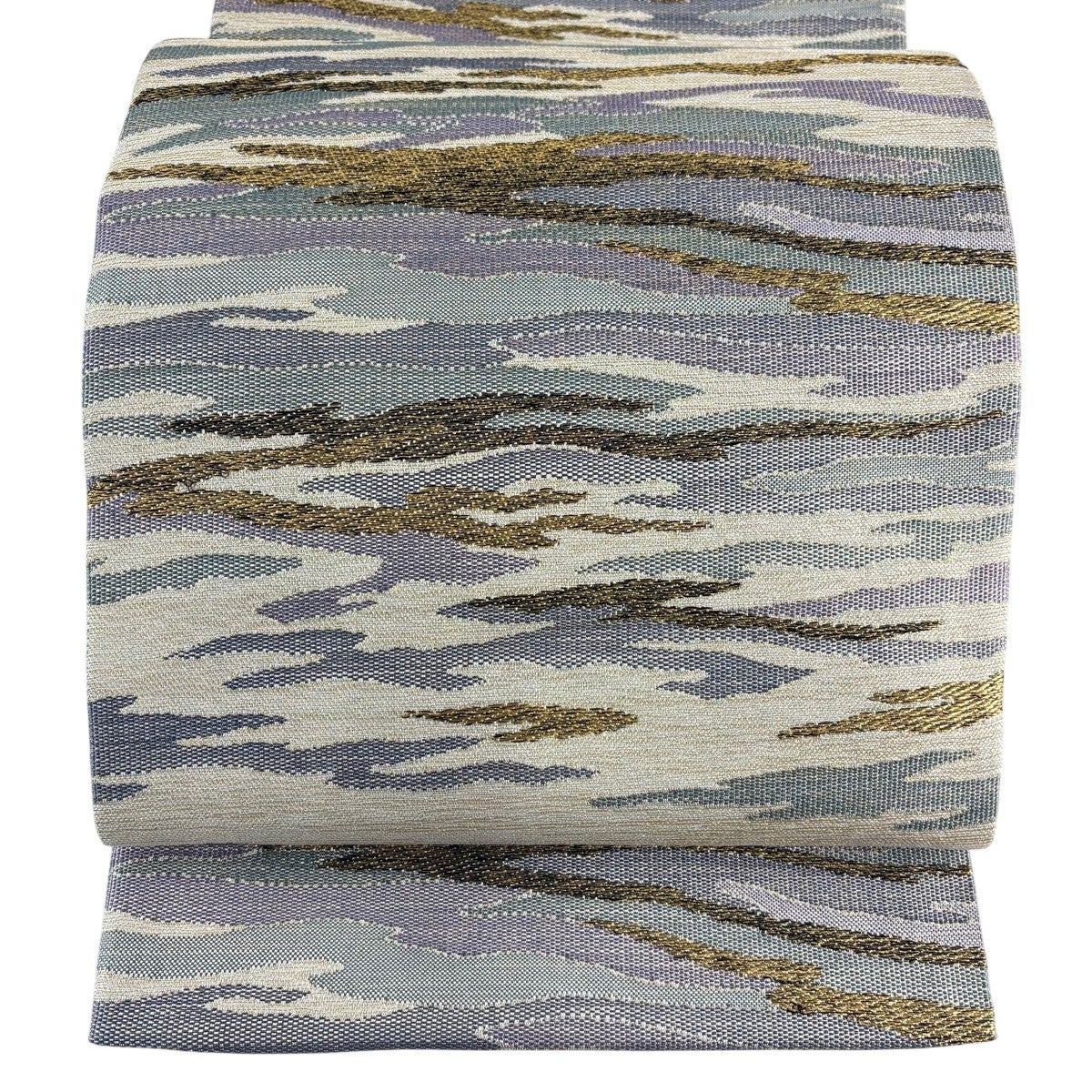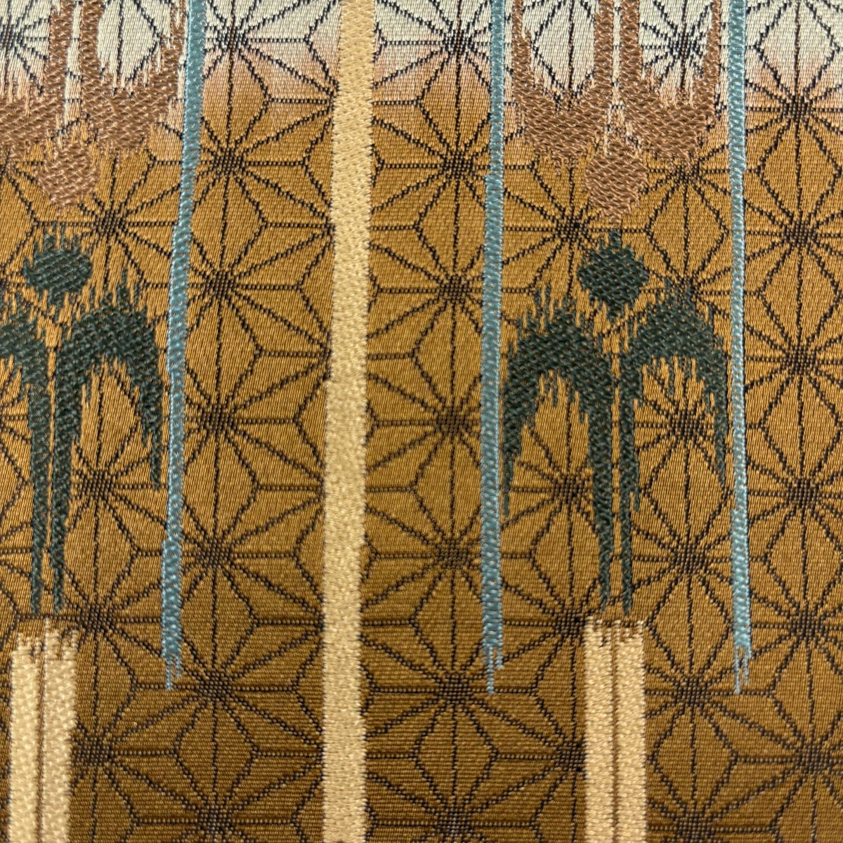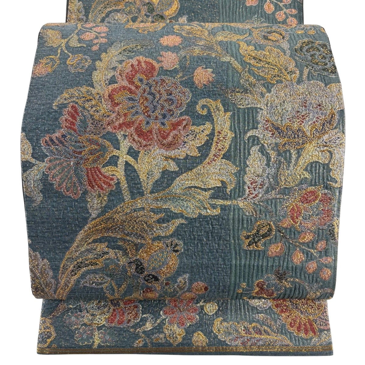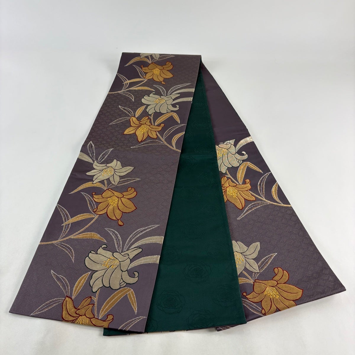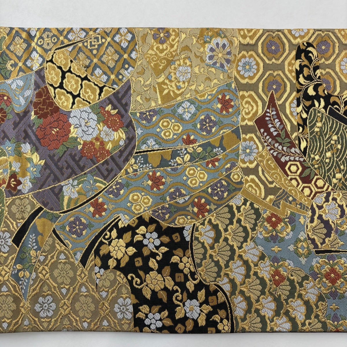 袋帯とは女性用の主にフォーマル用の帯で第一礼装として着用されることが多く、形状は表地にのみ柄があり裏地は無地になるように袋状に織って作成されたため袋帯という名が付きました。 帯を締める際にはおめでたいことが重なりますようにという願いが込められている二重太鼓や成人式の際に振袖に見かけるふくら雀や文庫結びなどの変わり結びを用いて着用します。