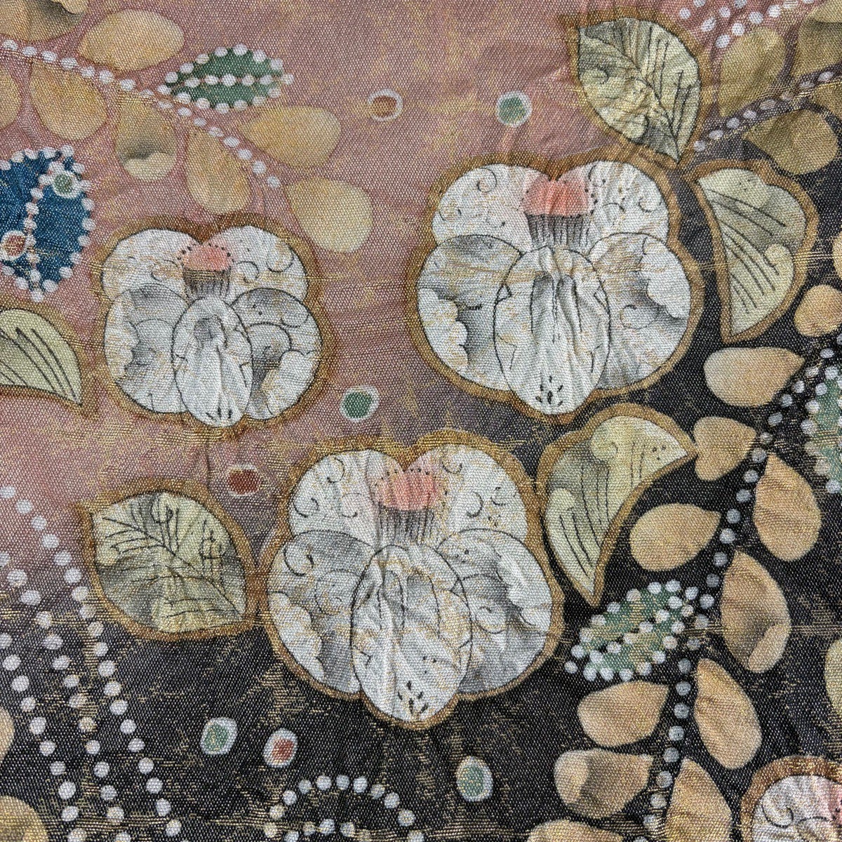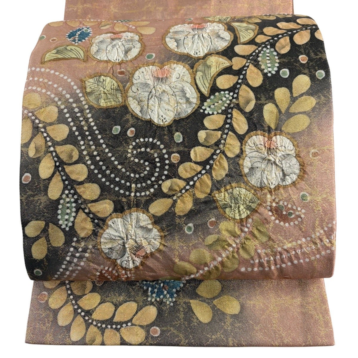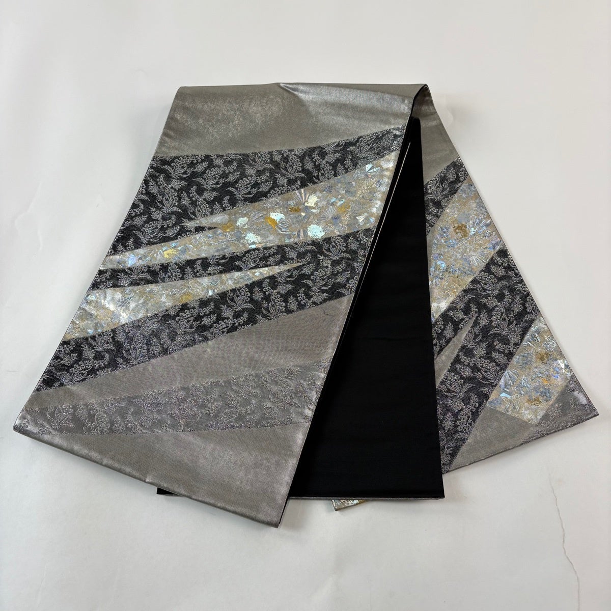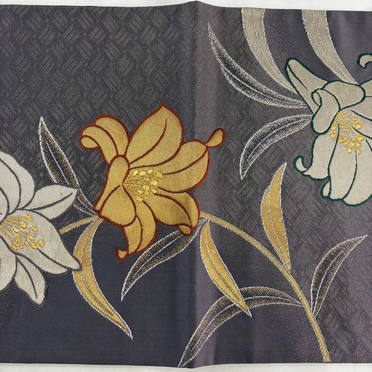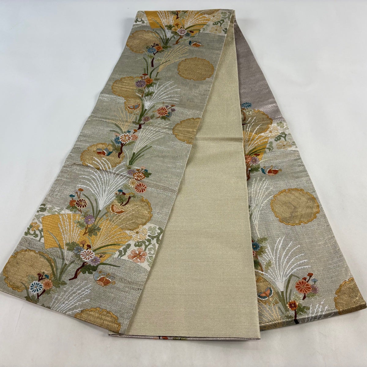 袋帯とは女性用の主にフォーマル用の帯で第一礼装として着用されることが多く、形状は表地にのみ柄があり裏地は無地になるように袋状に織って作成されたため袋帯という名が付きました。 帯を締める際にはおめでたいことが重なりますようにという願いが込められている二重太鼓や成人式の際に振袖に見かけるふくら雀や文庫結びなどの変わり結びを用いて着用します。