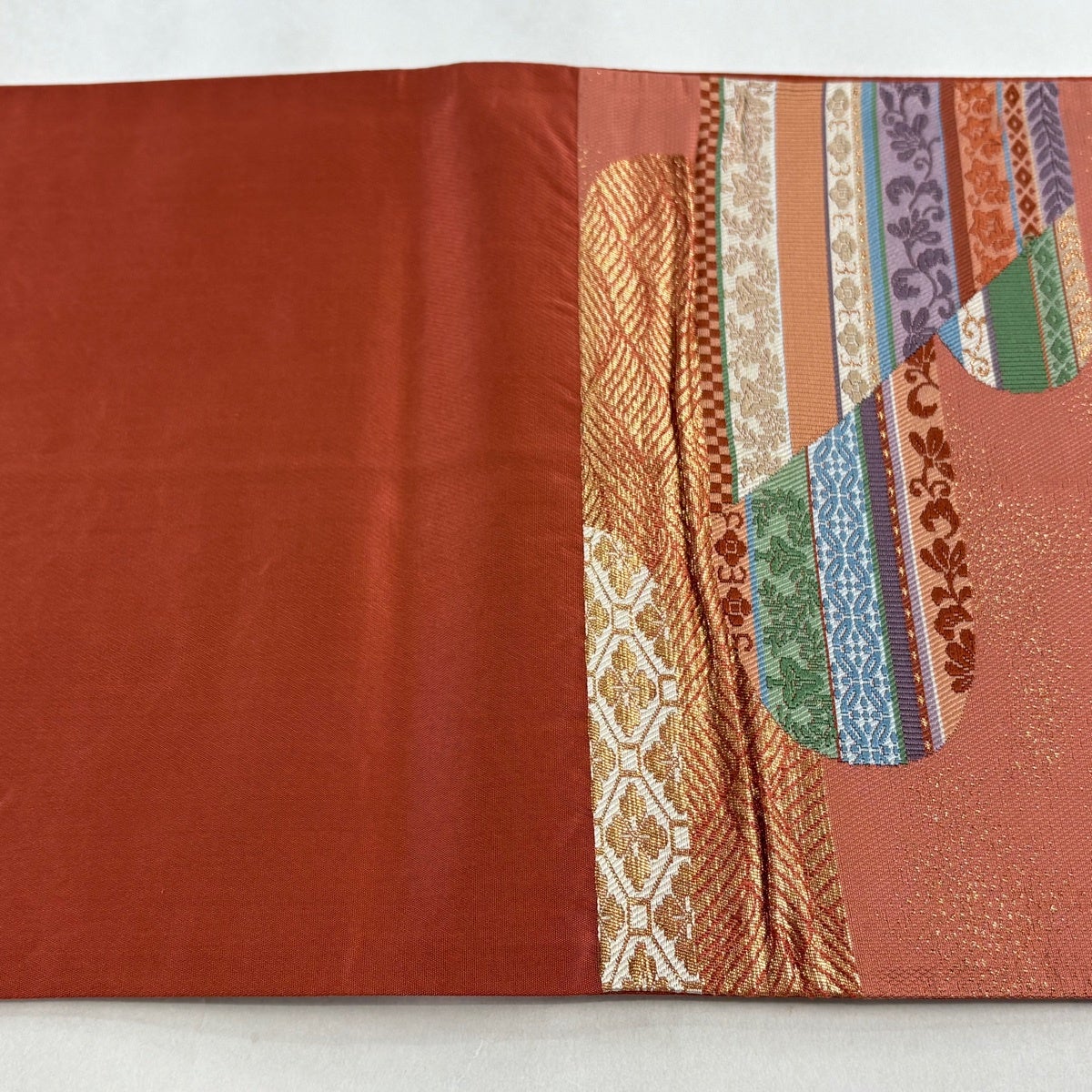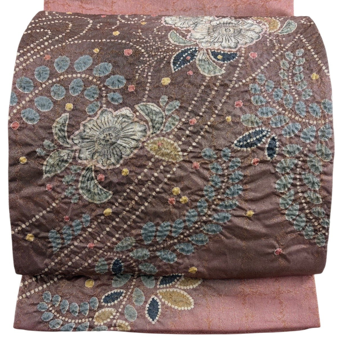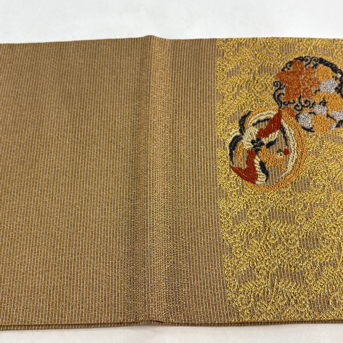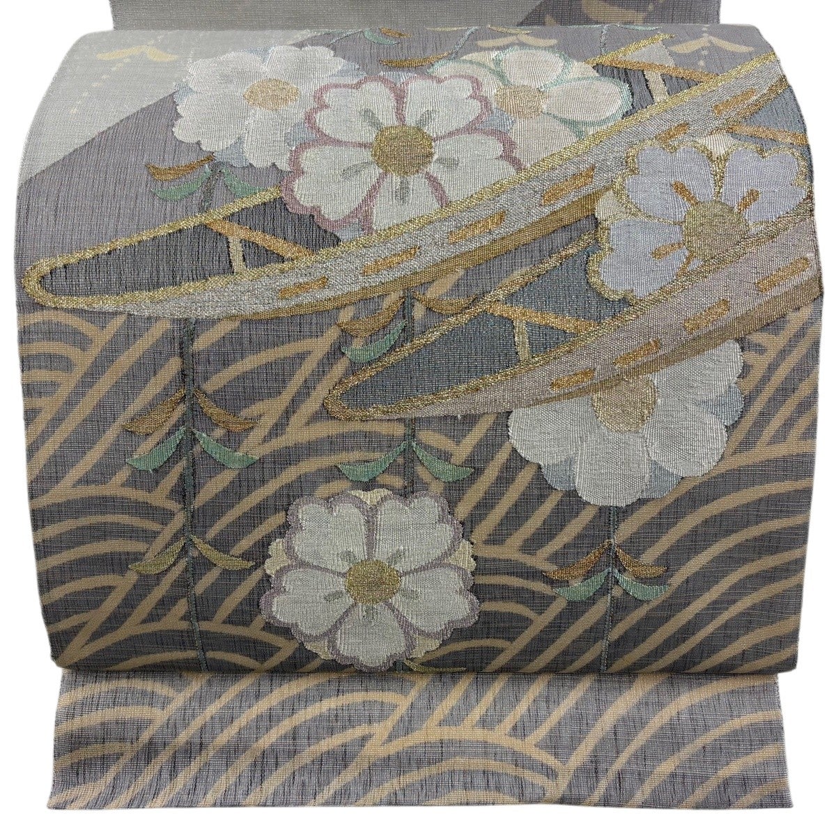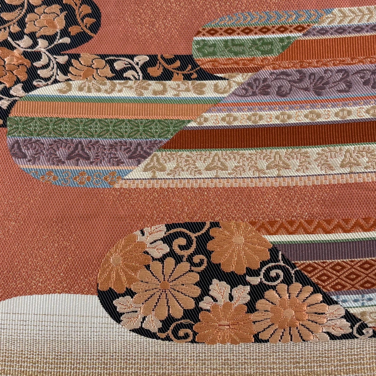 袋帯とは女性用の主にフォーマル用の帯で第一礼装として着用されることが多く、形状は表地にのみ柄があり裏地は無地になるように袋状に織って作成されたため袋帯という名が付きました。 帯を締める際にはおめでたいことが重なりますようにという願いが込められている二重太鼓や成人式の際に振袖に見かけるふくら雀や文庫結びなどの変わり結びを用いて着用します。