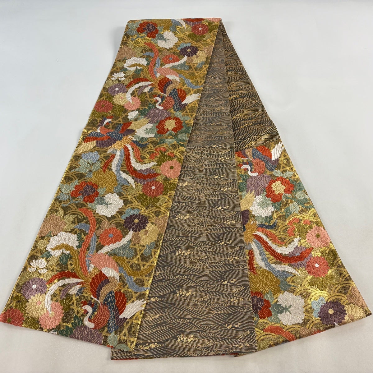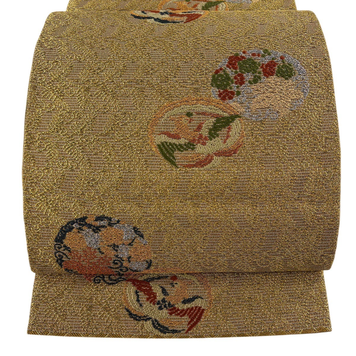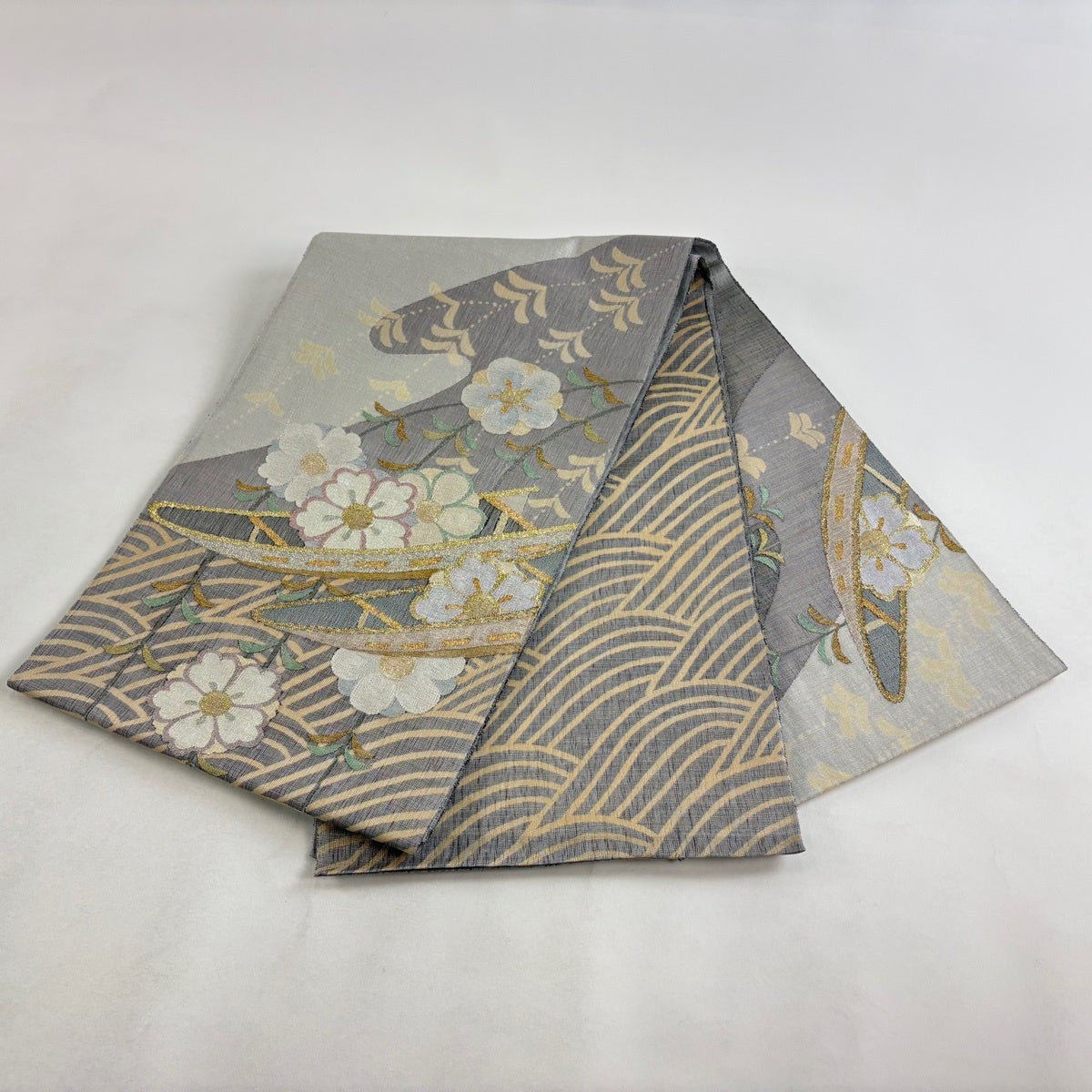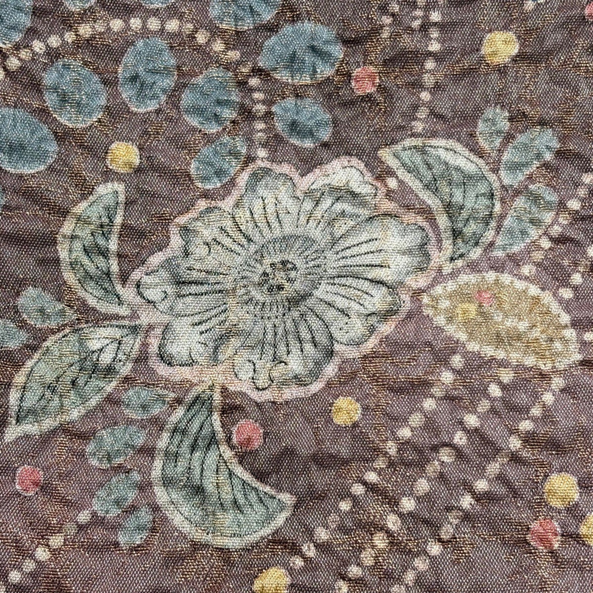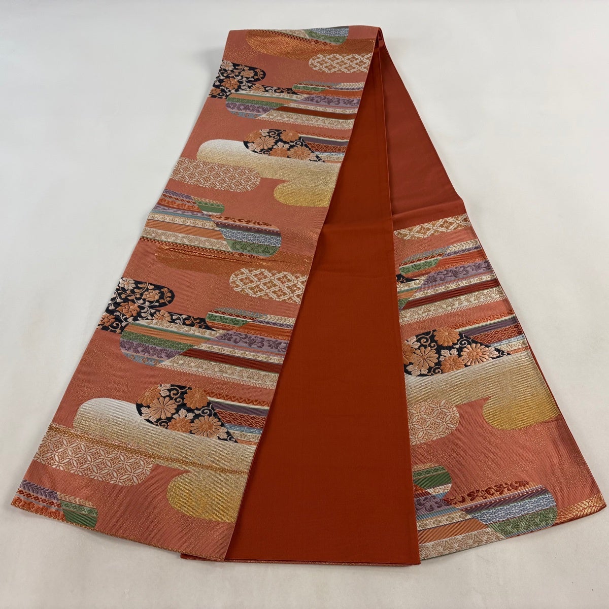 袋帯とは女性用の主にフォーマル用の帯で第一礼装として着用されることが多く、形状は表地にのみ柄があり裏地は無地になるように袋状に織って作成されたため袋帯という名が付きました。 帯を締める際にはおめでたいことが重なりますようにという願いが込められている二重太鼓や成人式の際に振袖に見かけるふくら雀や文庫結びなどの変わり結びを用いて着用します。
