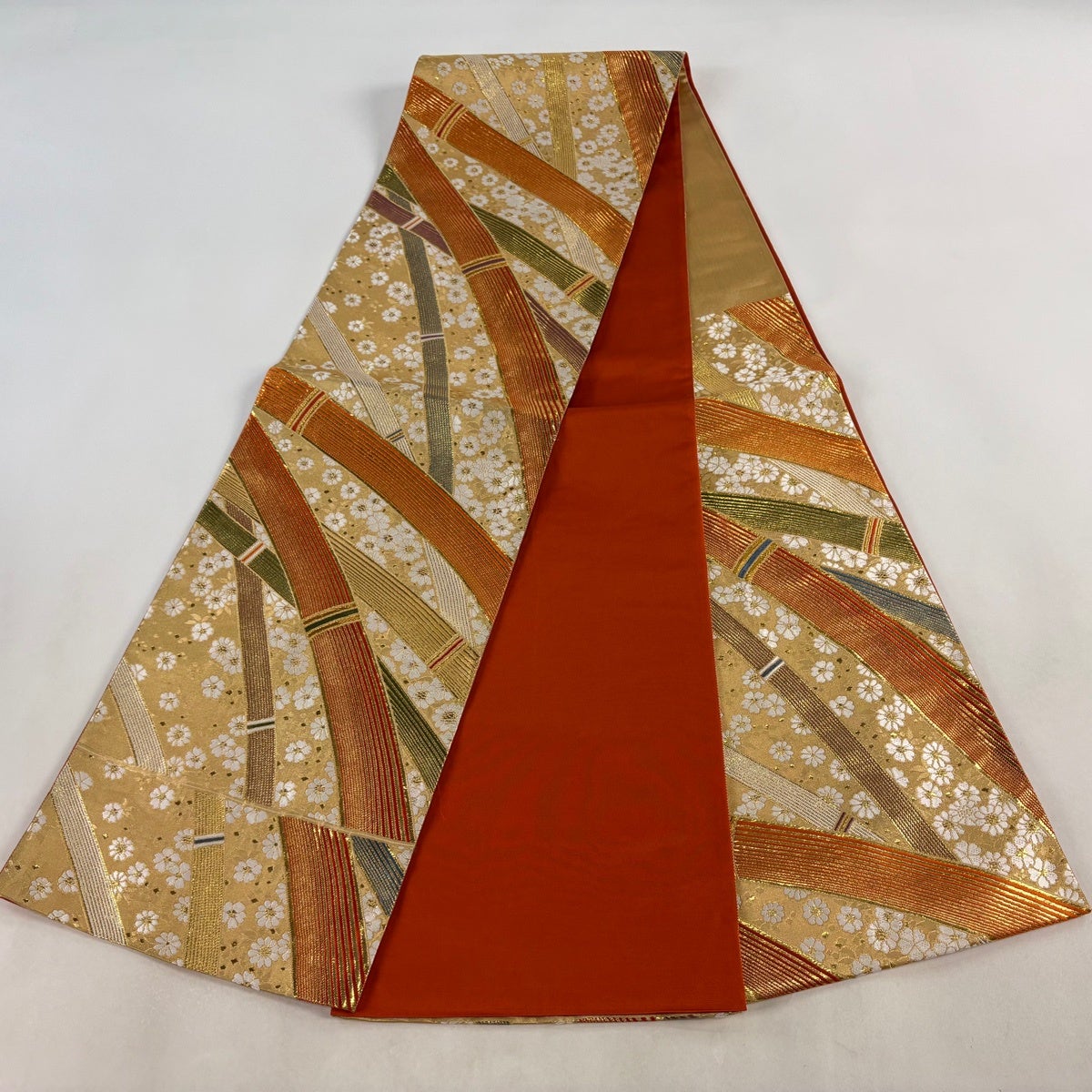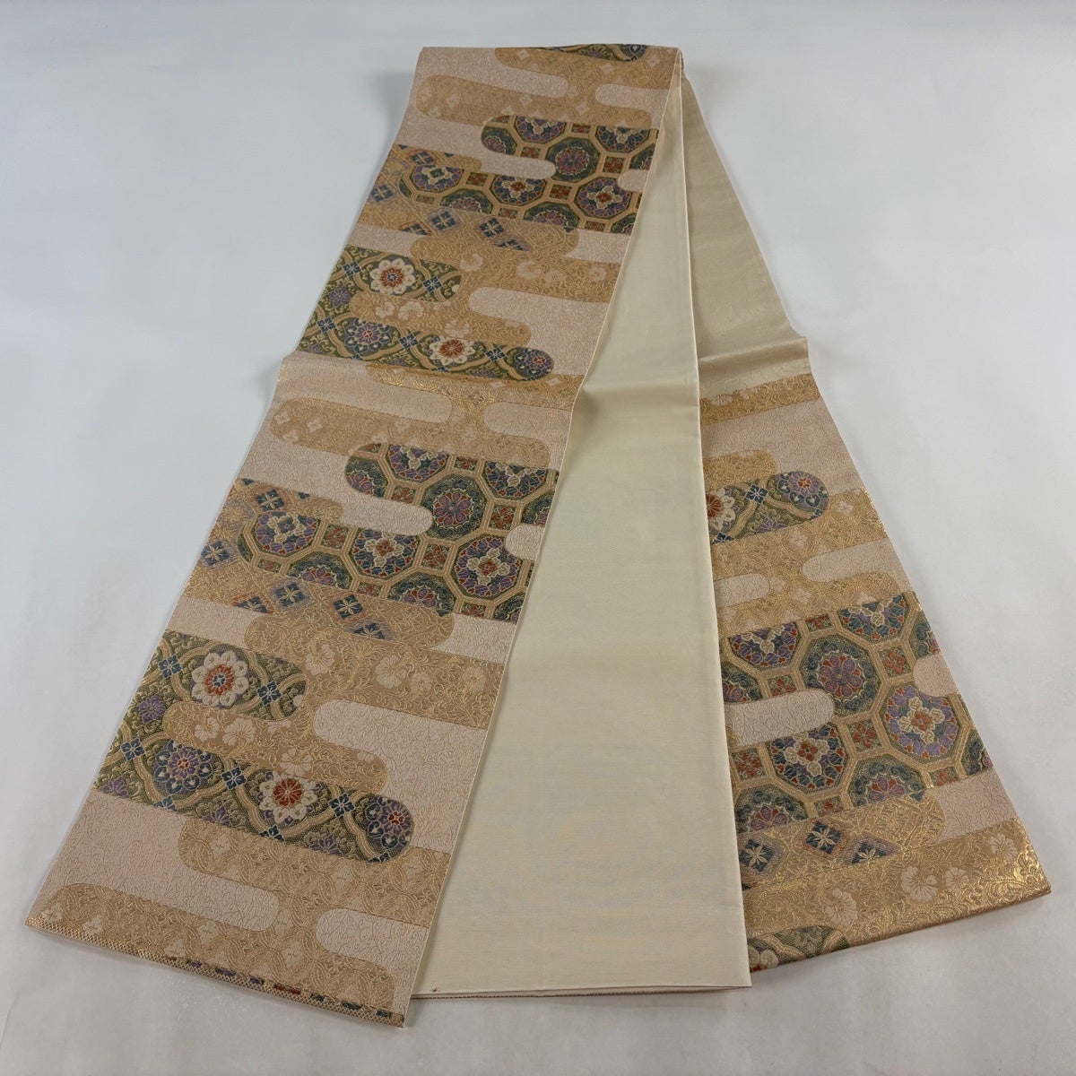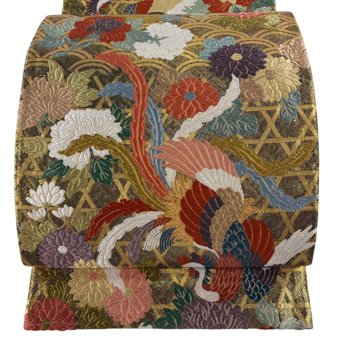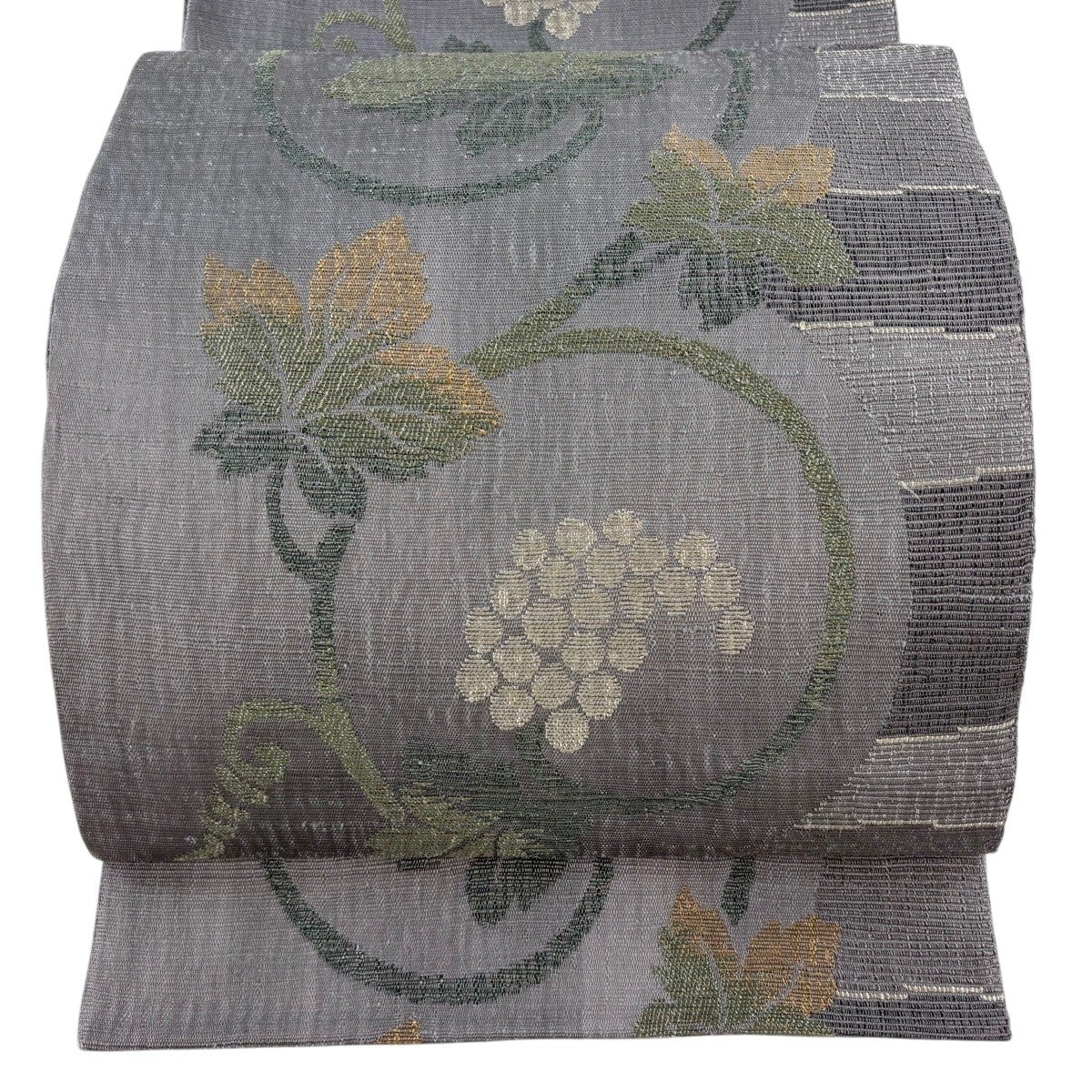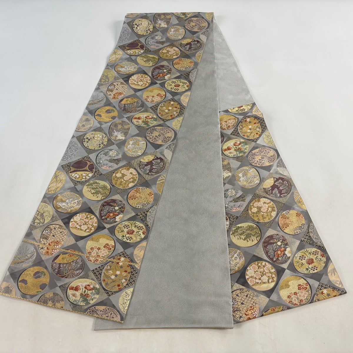 袋帯とは女性用の主にフォーマル用の帯で第一礼装として着用されることが多く、形状は表地にのみ柄があり裏地は無地になるように袋状に織って作成されたため袋帯という名が付きました。 帯を締める際にはおめでたいことが重なりますようにという願いが込められている二重太鼓や成人式の際に振袖に見かけるふくら雀や文庫結びなどの変わり結びを用いて着用します。