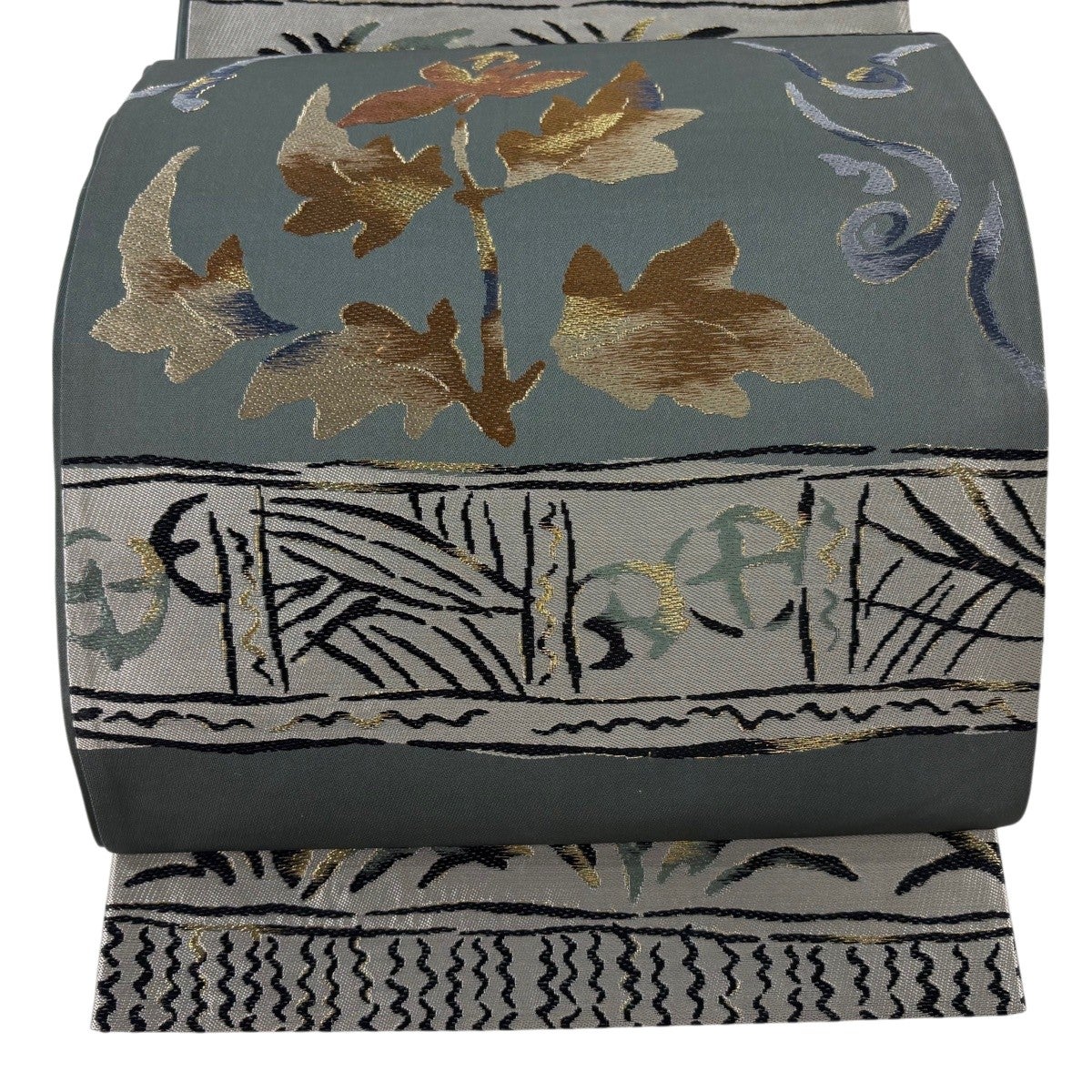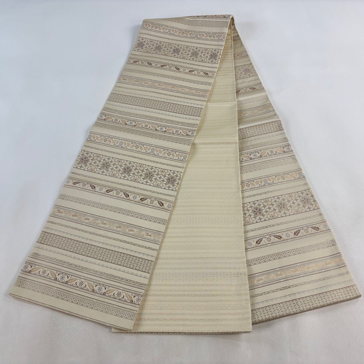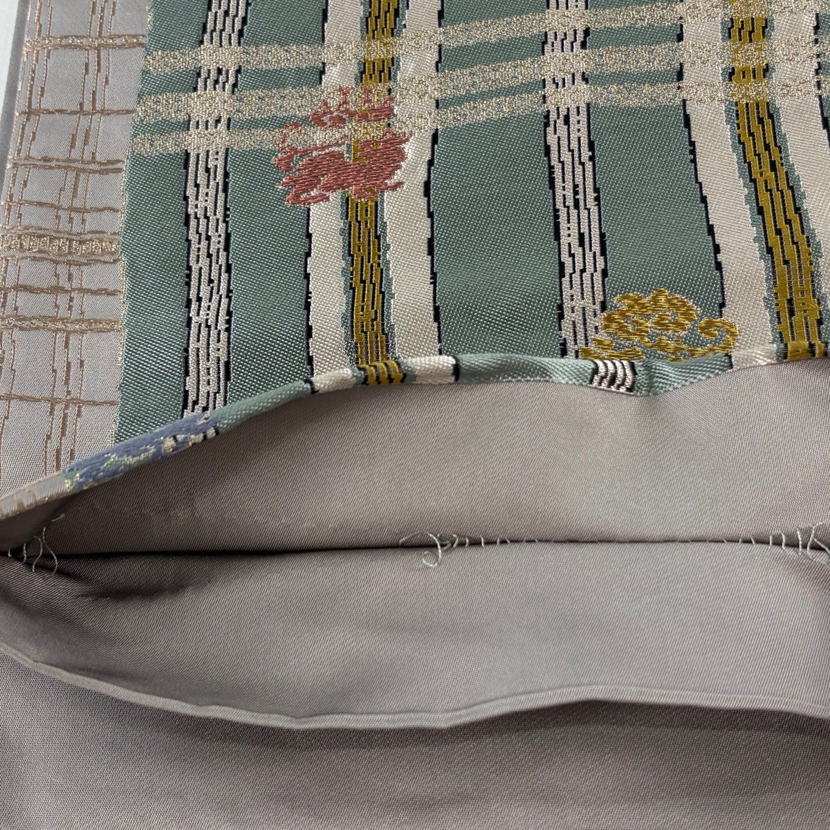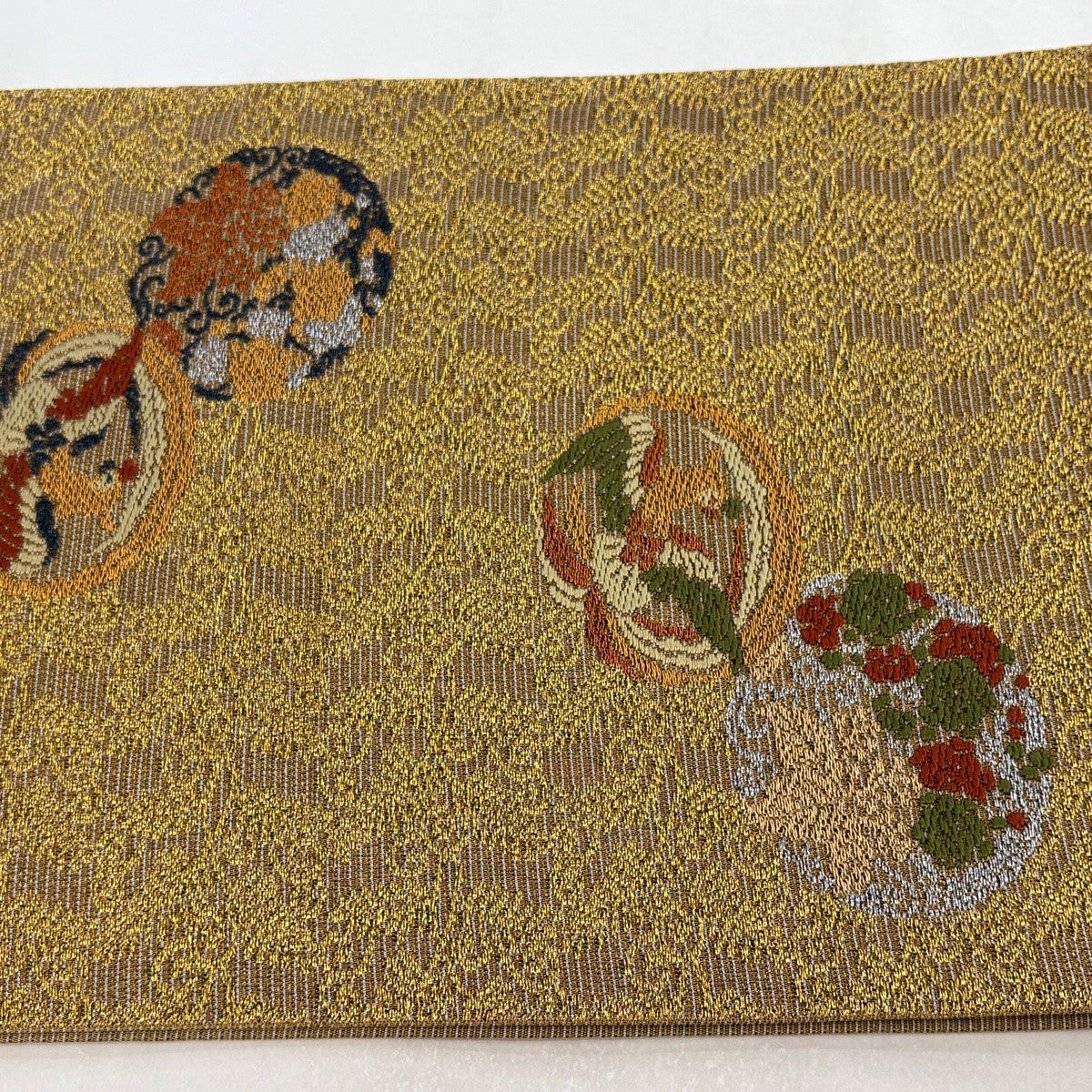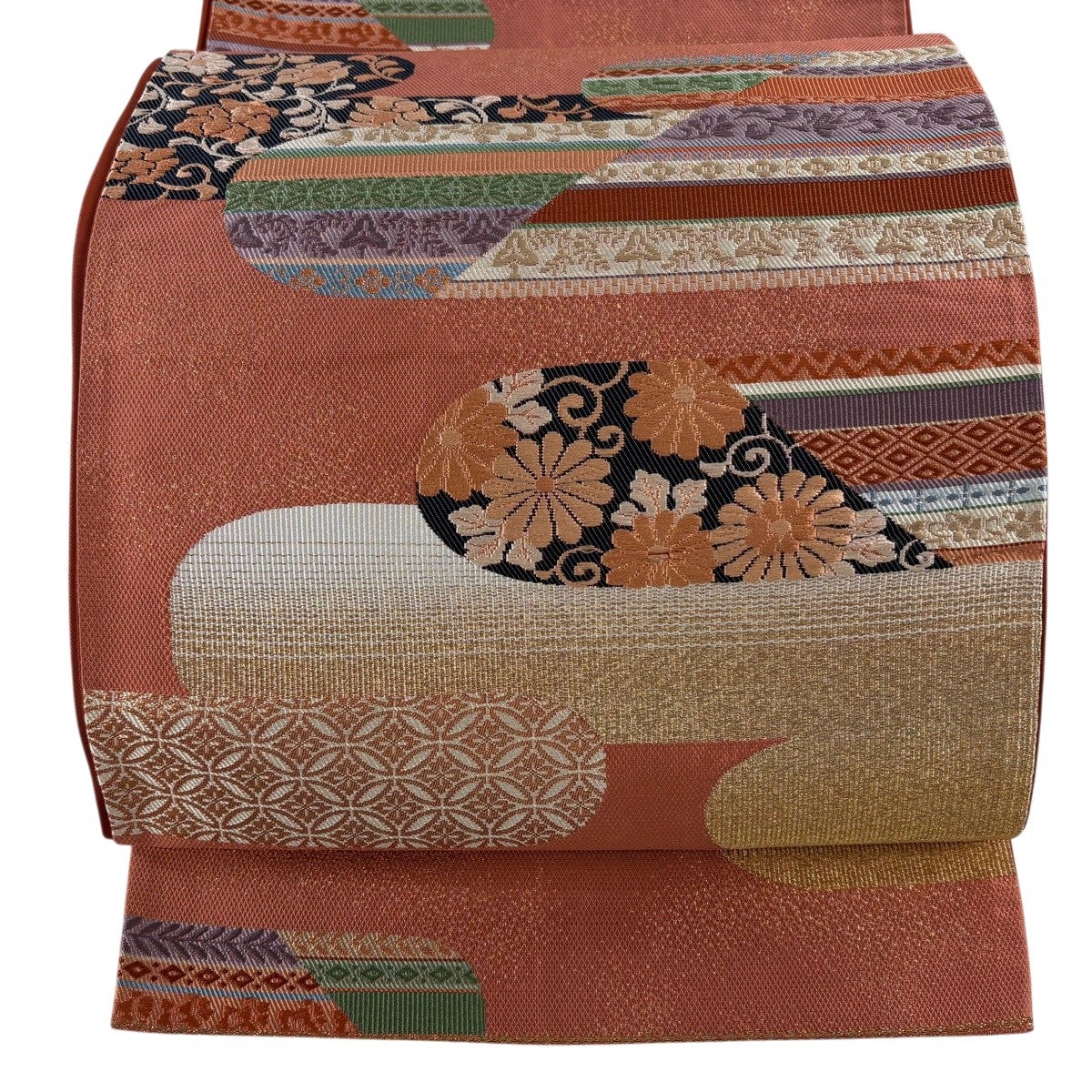 袋帯とは女性用の主にフォーマル用の帯で第一礼装として着用されることが多く、形状は表地にのみ柄があり裏地は無地になるように袋状に織って作成されたため袋帯という名が付きました。 帯を締める際にはおめでたいことが重なりますようにという願いが込められている二重太鼓や成人式の際に振袖に見かけるふくら雀や文庫結びなどの変わり結びを用いて着用します。