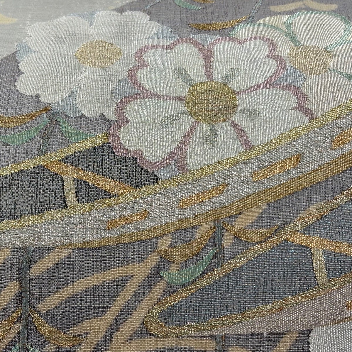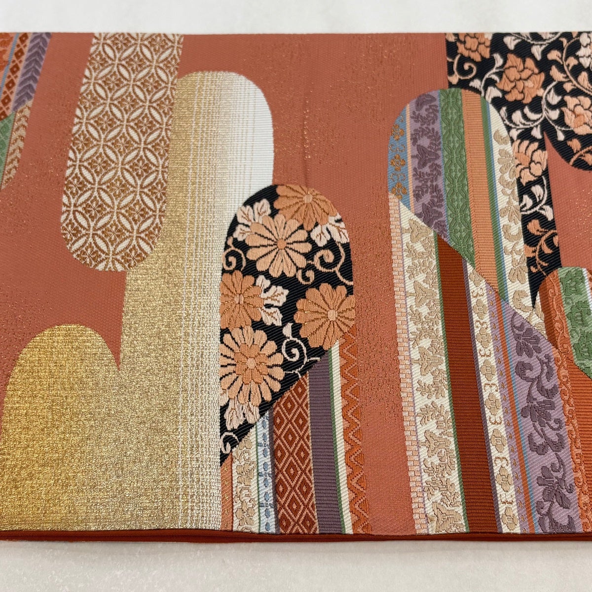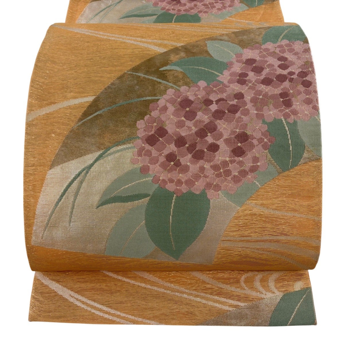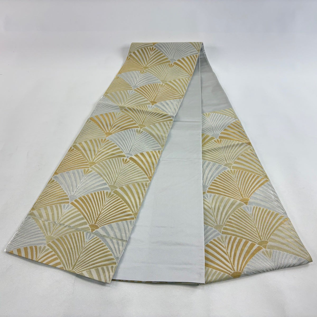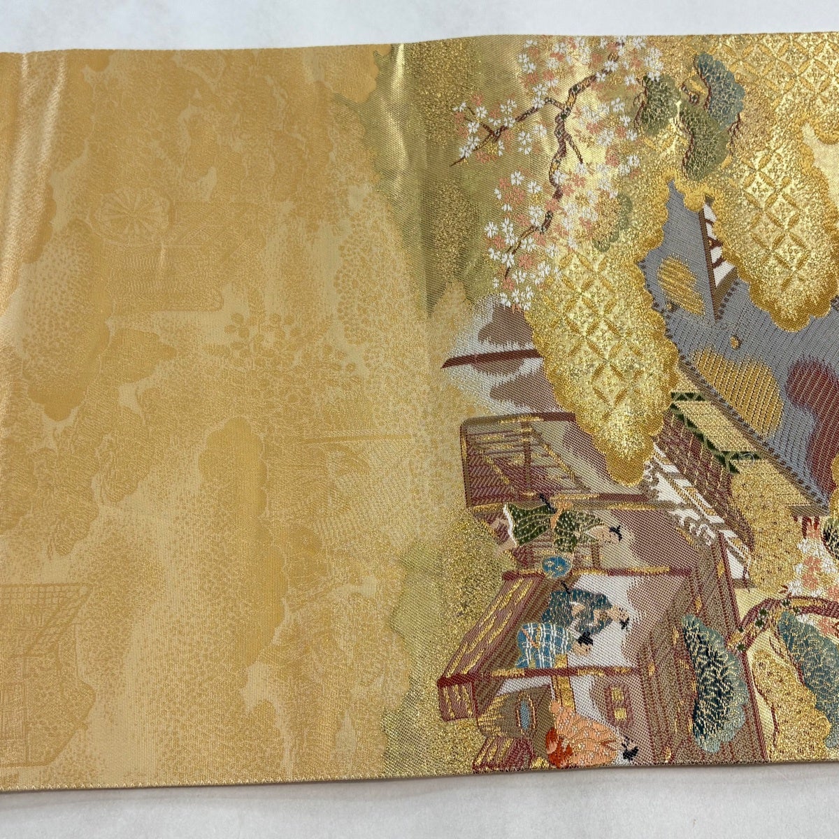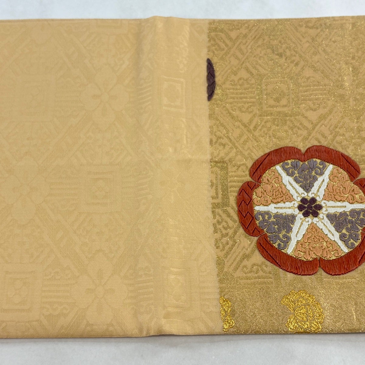 袋帯とは女性用の主にフォーマル用の帯で第一礼装として着用されることが多く、形状は表地にのみ柄があり裏地は無地になるように袋状に織って作成されたため袋帯という名が付きました。 帯を締める際にはおめでたいことが重なりますようにという願いが込められている二重太鼓や成人式の際に振袖に見かけるふくら雀や文庫結びなどの変わり結びを用いて着用します。