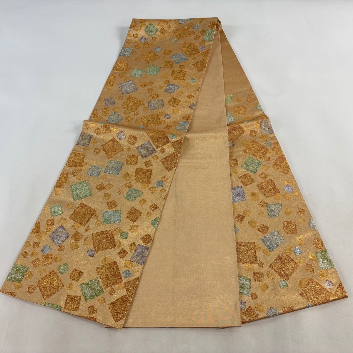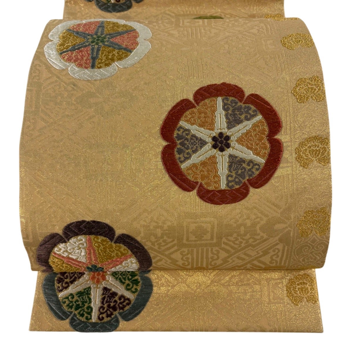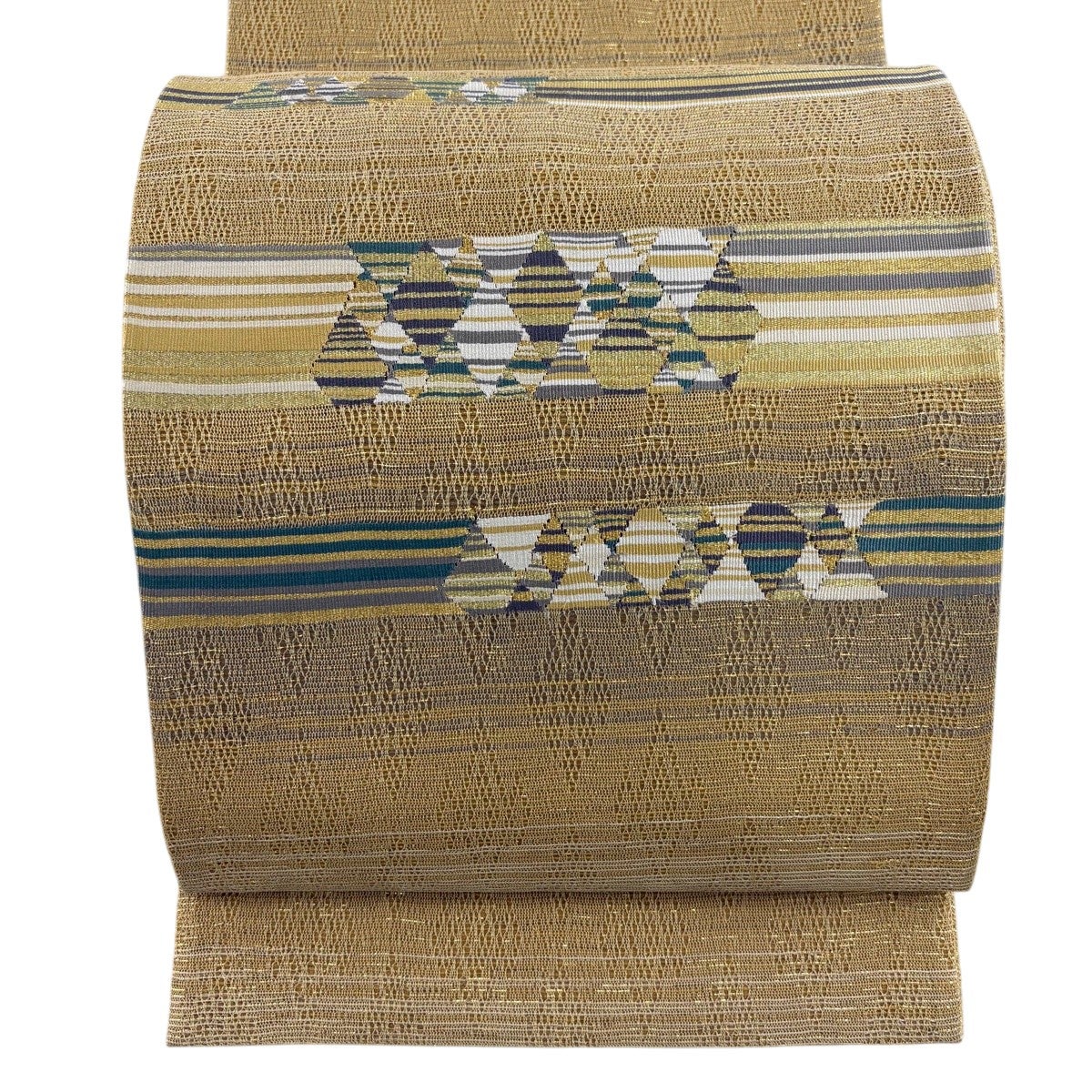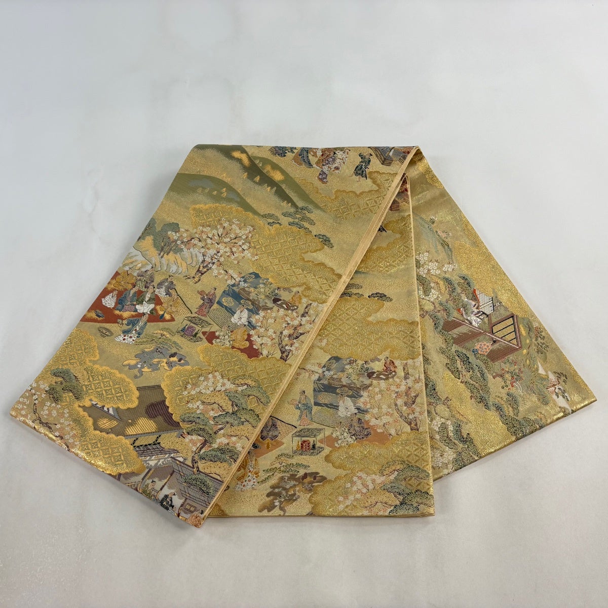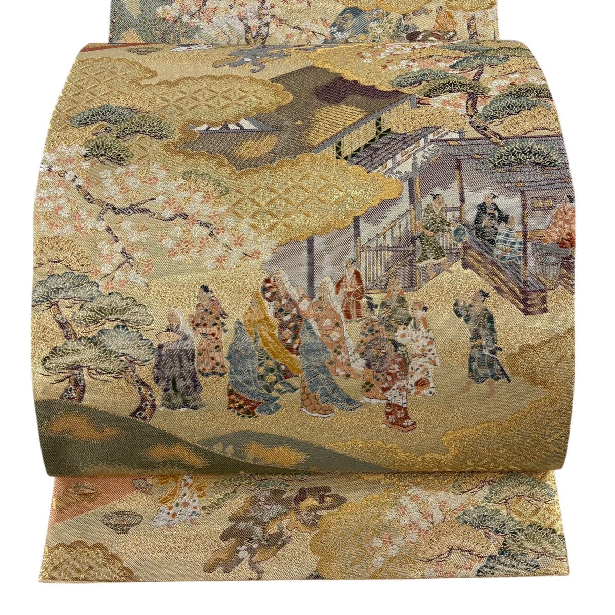 袋帯とは女性用の主にフォーマル用の帯で第一礼装として着用されることが多く、形状は表地にのみ柄があり裏地は無地になるように袋状に織って作成されたため袋帯という名が付きました。 帯を締める際にはおめでたいことが重なりますようにという願いが込められている二重太鼓や成人式の際に振袖に見かけるふくら雀や文庫結びなどの変わり結びを用いて着用します。