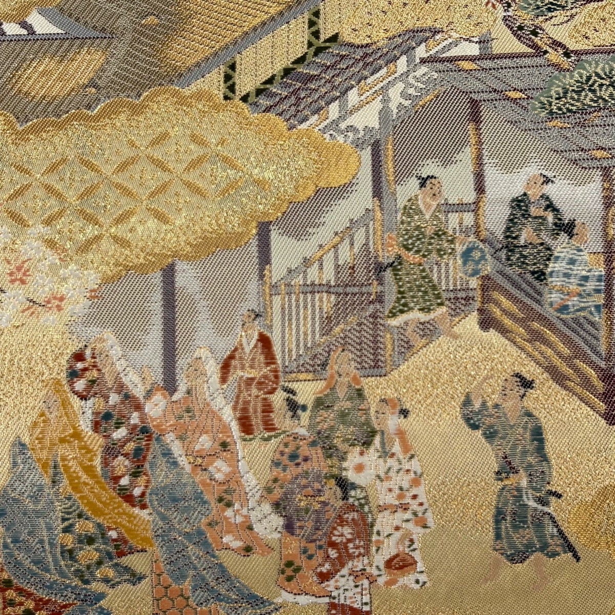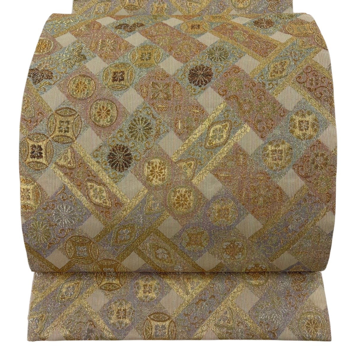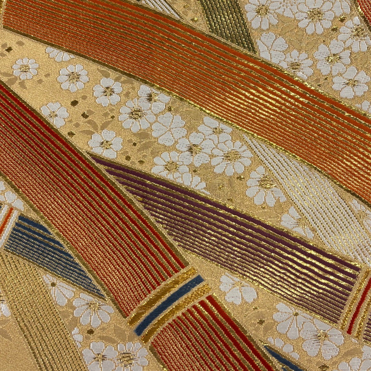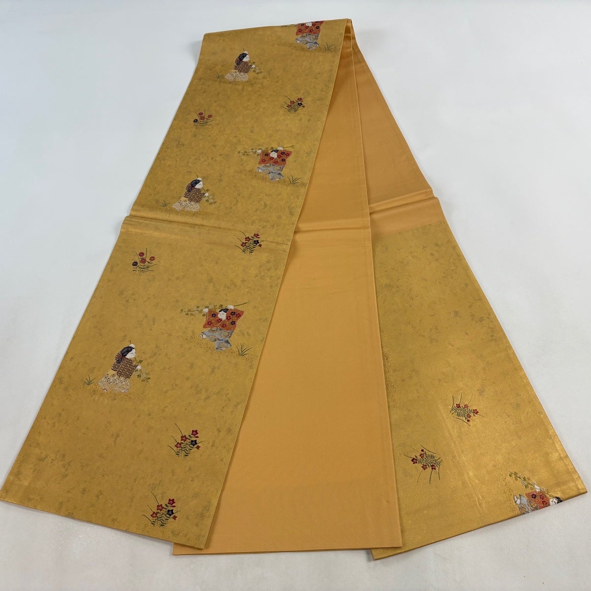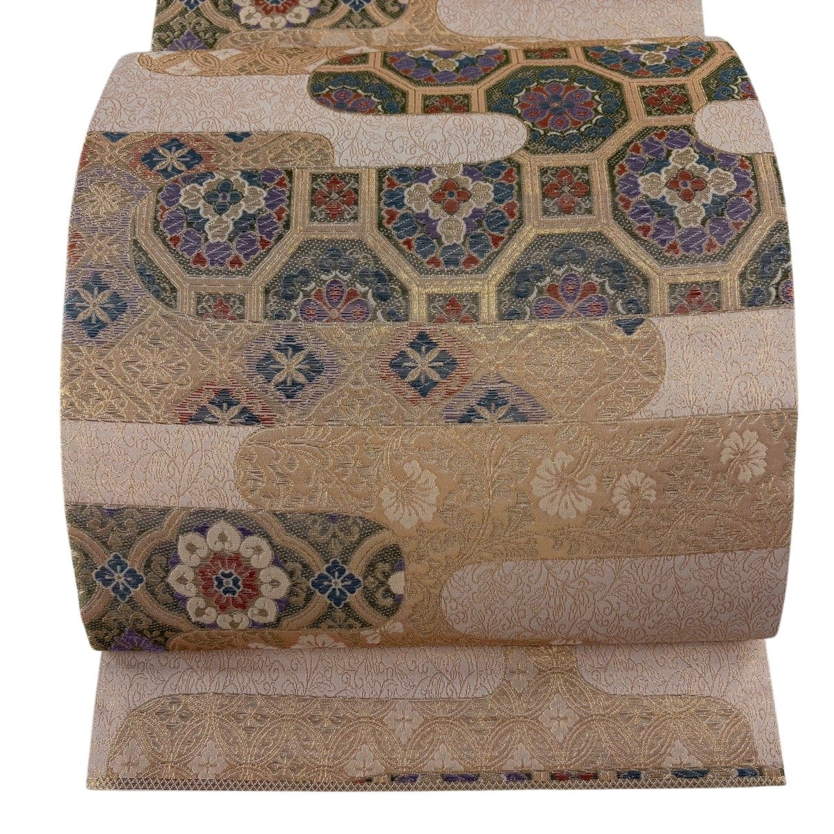 袋帯とは女性用の主にフォーマル用の帯で第一礼装として着用されることが多く、形状は表地にのみ柄があり裏地は無地になるように袋状に織って作成されたため袋帯という名が付きました。 帯を締める際にはおめでたいことが重なりますようにという願いが込められている二重太鼓や成人式の際に振袖に見かけるふくら雀や文庫結びなどの変わり結びを用いて着用します。