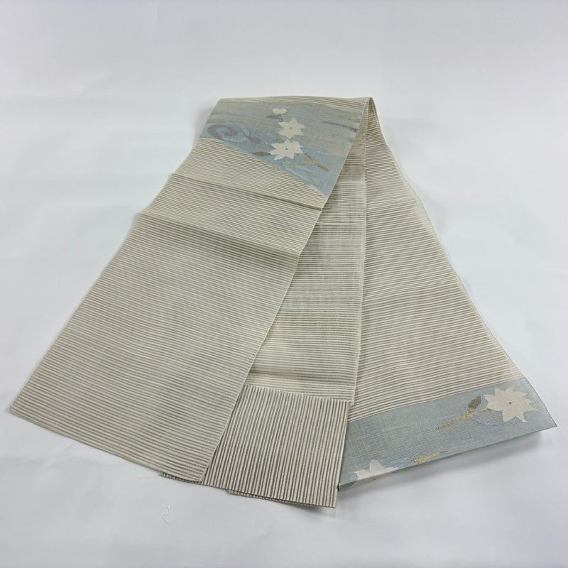 夏帯でございます。 セミフォーマルでお使いいただける名古屋帯でございます。 見る人に重たい印象を感じさせない女性ならではの、気品豊かな一品です。 締め跡がございます。 お太鼓垂先間にヤケ、手先前柄間所々に薄いシミ、締め跡沿いに薄汚れがございます。 リユース品としては良い状態で、まだまだご活用頂けると思われます。 ※なお、厳しく商品の状態確認を行っておりますが、記載の汚れ以外にも見落とし箇所がある可能性がある旨ご了承いただけますと幸いです。 沢山の商品の中からご覧いただき誠にありがとうございます。