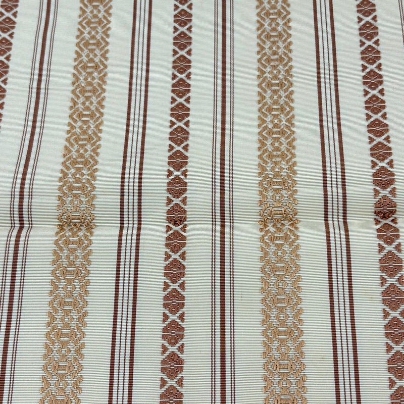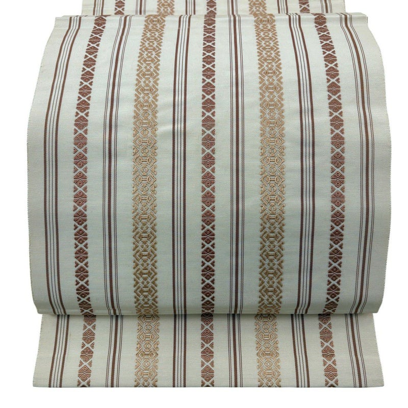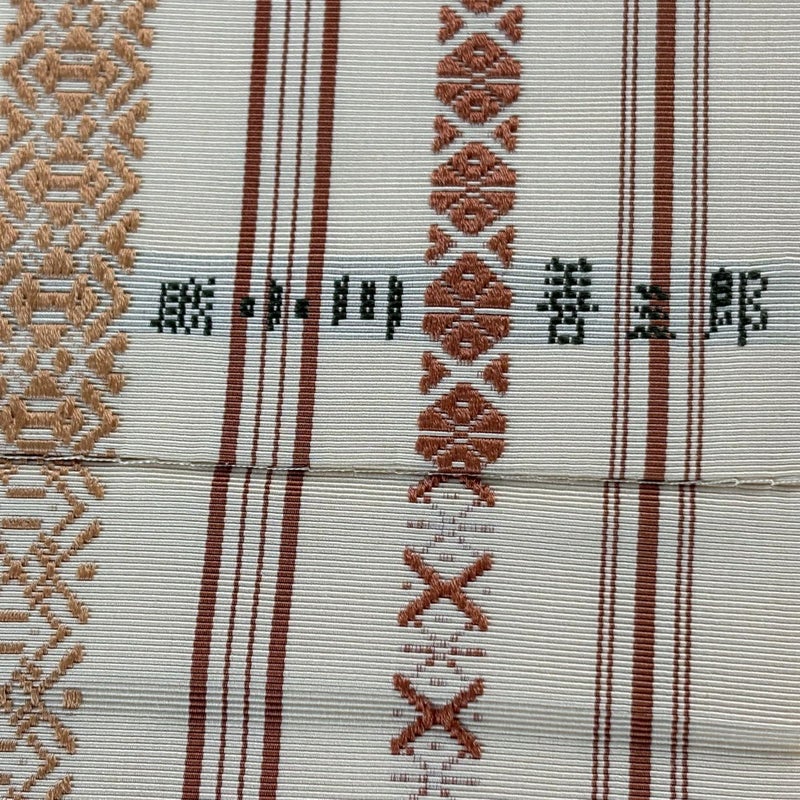 博多織の人間国宝に認定された「小川善三郎」の作品でございます。 普段使いでお使いいただける名古屋帯でございます。 カジュアルな装いに合わせてお使いください。 垂先と手先など表地所々に点シミ、垂先付近など表地所々に線シミ、お太鼓にシワがございます。 リユース品としては良い状態で、まだまだご活用頂けると思われます。 ※なお、厳しく商品の状態確認を行っておりますが、記載の汚れ以外にも見落とし箇所がある可能性がある旨ご了承いただけますと幸いです。 沢山の商品の中からご覧いただき誠にありがとうございます。