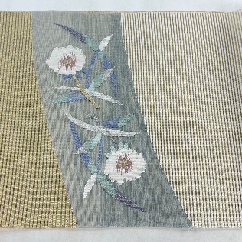 夏帯でございます。 セミフォーマルでお使いいただける名古屋帯でございます。 見る人に重たい印象を感じさせない女性ならではの、気品豊かな一品です。 締め跡がございます。 前柄お太鼓間と手先前柄間にシワがございます。 リユース品としては目立った染み傷なく、状態の良いお品でございます。 ※なお、厳しく商品の状態確認を行っておりますが、記載の汚れ以外にも見落とし箇所がある可能性がある旨ご了承いただけますと幸いです。 沢山の商品の中からご覧いただき誠にありがとうございます。