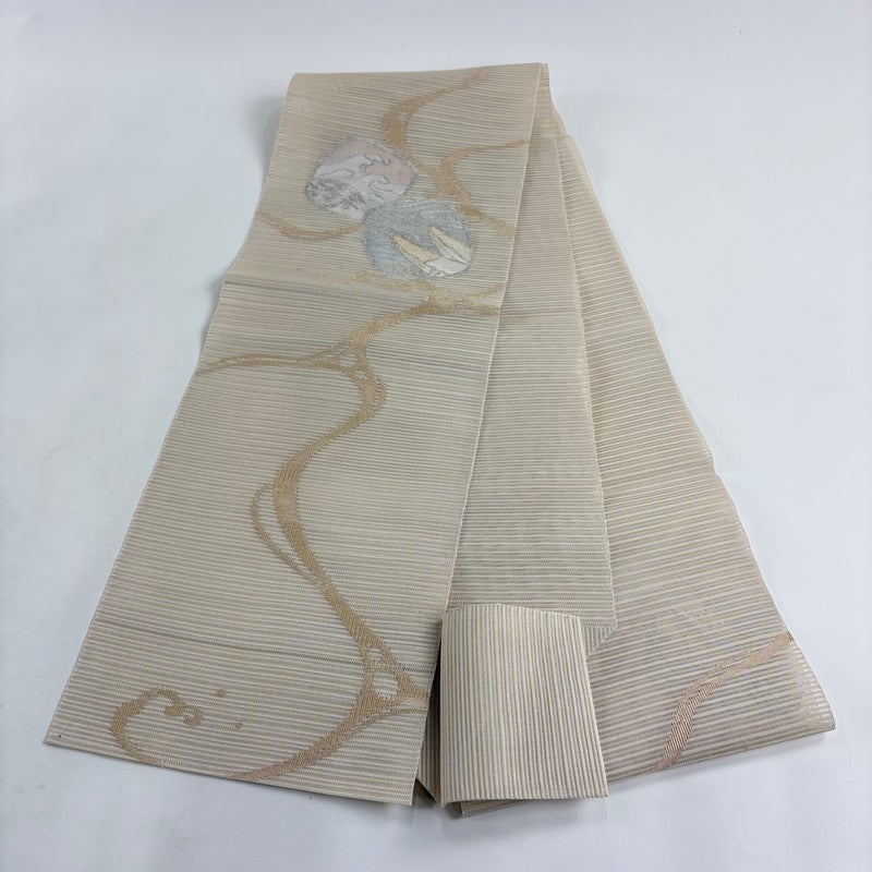 セミフォーマルでお使いいただける夏物の名古屋帯でございます。 見る人に重たい印象を感じさせない女性ならではの、気品豊かな一品です。 締め跡、垂先に小さいシミがございます。 リユース品としては目立った染み傷なく、状態の良いお品でございます。 ※なお、厳しく商品の状態確認を行っておりますが、記載の汚れ以外にも見落とし箇所がある可能性がある旨ご了承いただけますと幸いです。 沢山の商品の中からご覧いただき誠にありがとうございます。