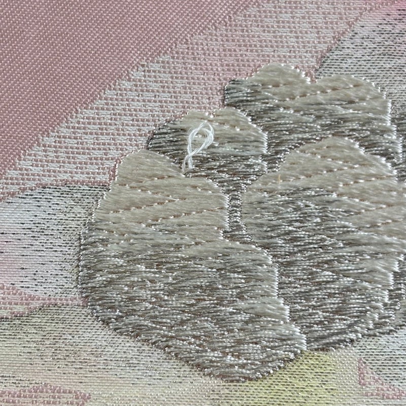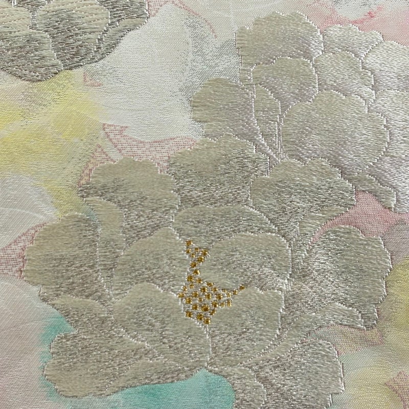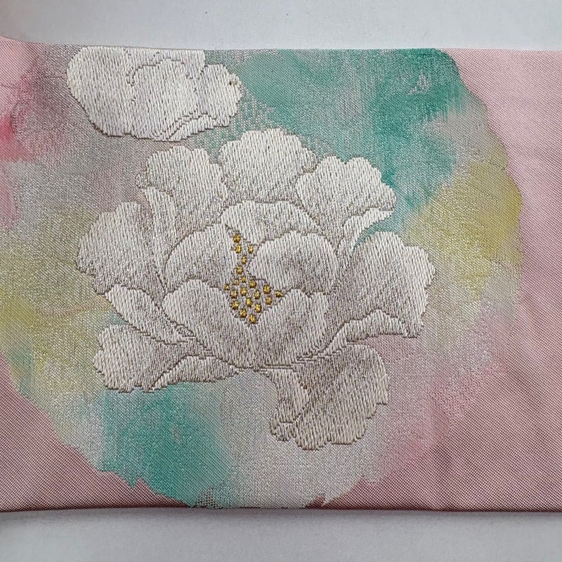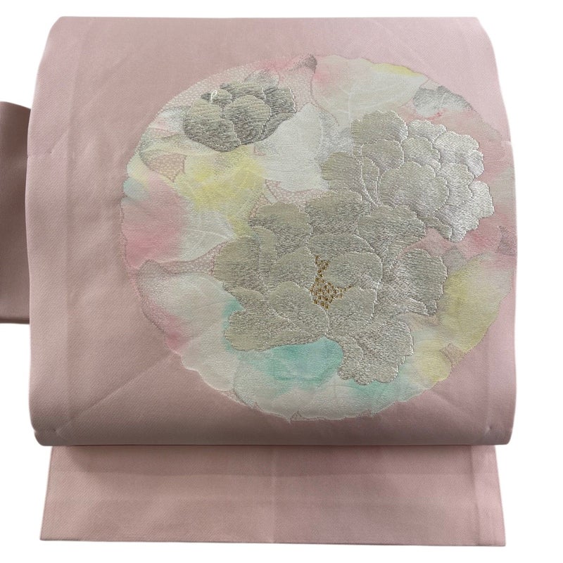 セミフォーマルでお使いいただける名古屋帯でございます。 見る人に重たい印象を感じさせない女性ならではの、気品豊かな一品です。 前柄垂境間に薄いシミ、 手先前柄間にシミがございます。 お太鼓に刺繍の緩みがございます。 表地所々にシワがございます。リユース品としては目立った染み傷なく、状態の良いお品でございます。 ※なお、厳しく商品の状態確認を行っておりますが、記載の汚れ以外にも見落とし箇所がある可能性がある旨ご了承いただけますと幸いです。 沢山の商品の中からご覧いただき誠にありがとうございます。