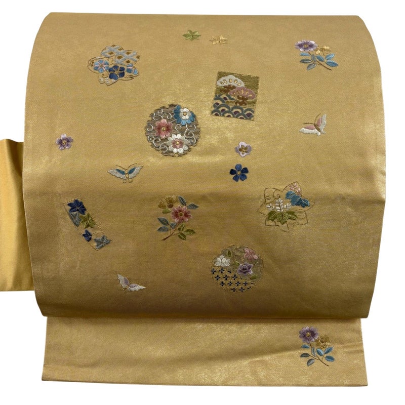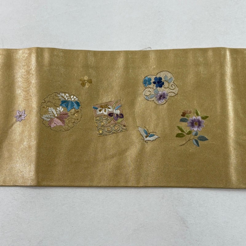 セミフォーマルでお使いいただける名古屋帯でございます。 見る人に重たい印象を感じさせない女性ならではの、気品豊かな一品です。 締め跡がございます。 お太鼓に箔の変色やシワがございます。 手先前柄間にシミがございます。 リユース品としては良い状態で、まだまだご活用頂けると思われます。 ※なお、厳しく商品の状態確認を行っておりますが、記載の汚れ以外にも見落とし箇所がある可能性がある旨ご了承いただけますと幸いです。 沢山の商品の中からご覧いただき誠にありがとうございます。 【PR2】