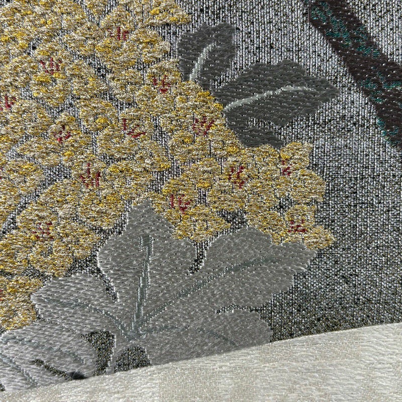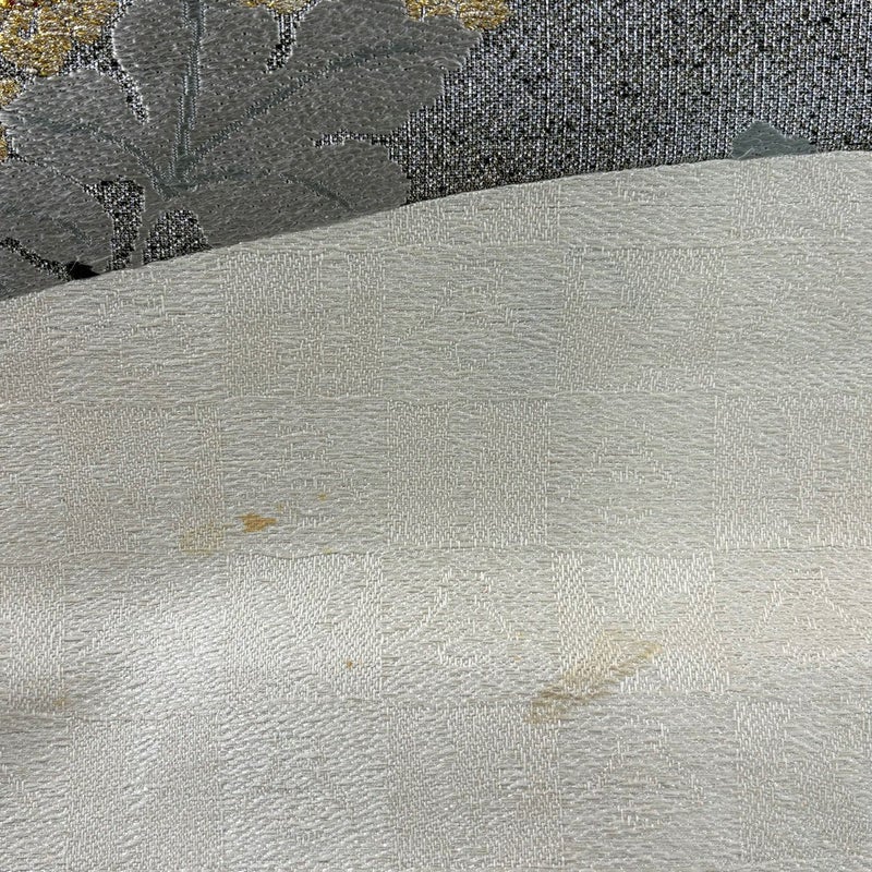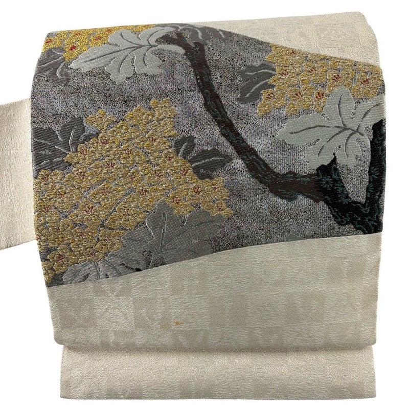 セミフォーマルでお使いいただける名古屋帯でございます。 見る人に重たい印象を感じさせない女性ならではの、気品豊かな一品です。 締め跡がございます。 お太鼓所々とお太鼓柄付近、お太鼓垂先間にシミ、手先前柄間に汚れがございます。 ご購入の際はその点ご留意ください。 ※なお、厳しく商品の状態確認を行っておりますが、記載の汚れ以外にも見落とし箇所がある可能性がある旨ご了承いただけますと幸いです。 沢山の商品の中からご覧いただき誠にありがとうございます。